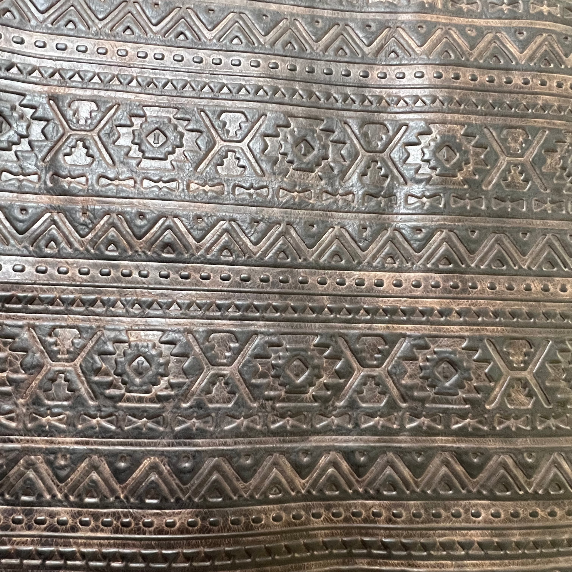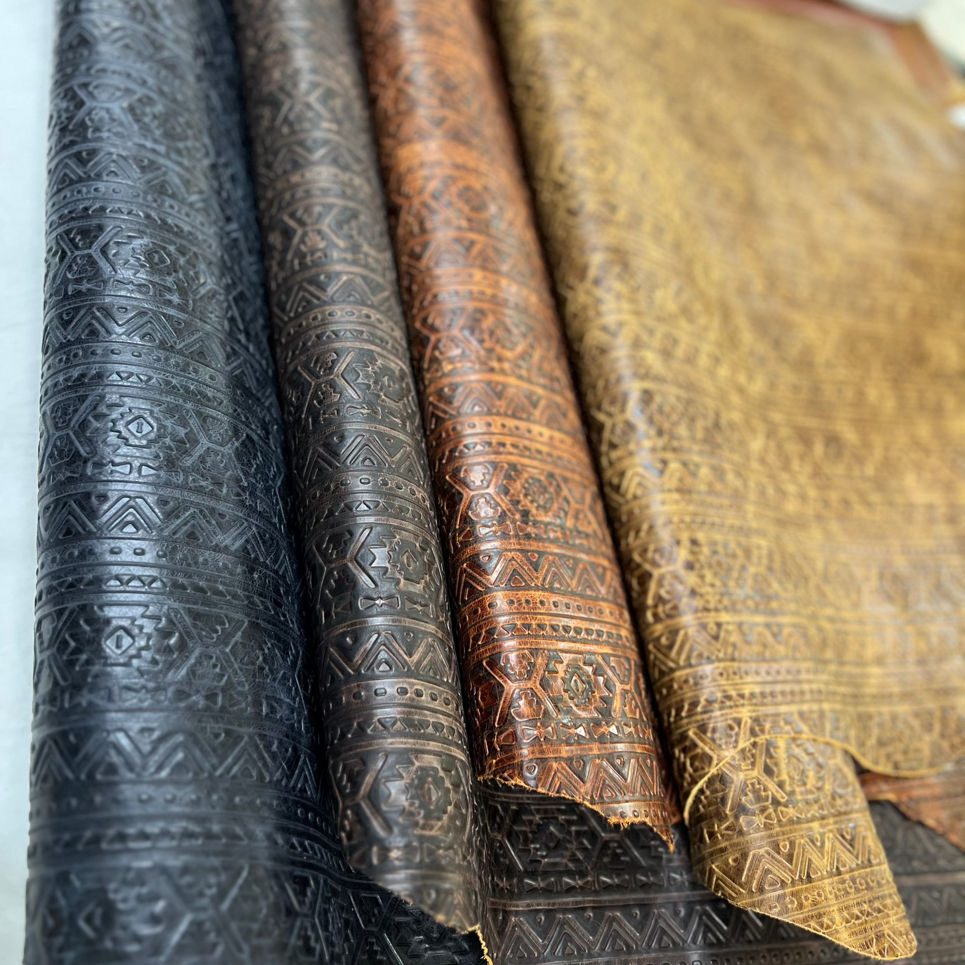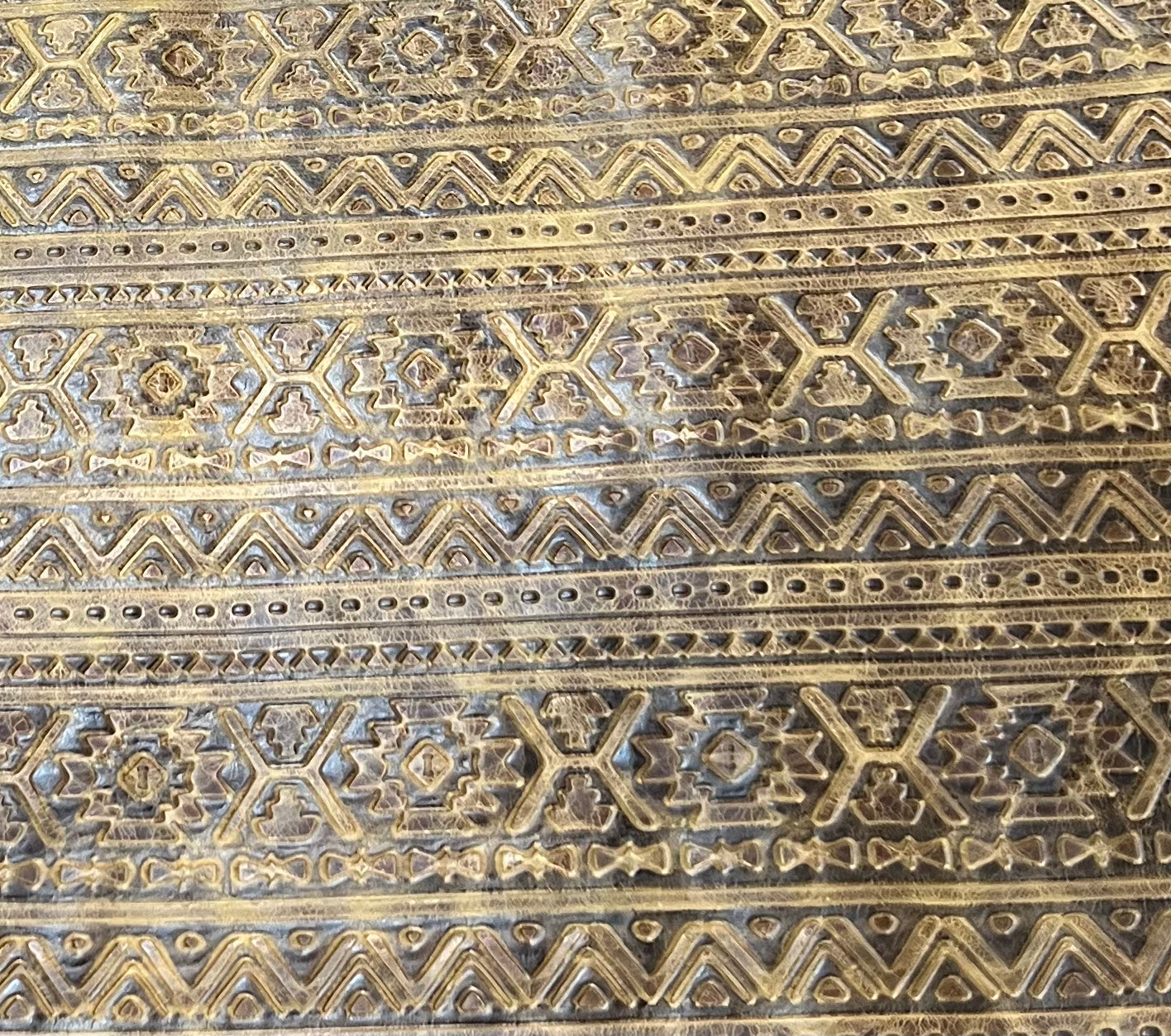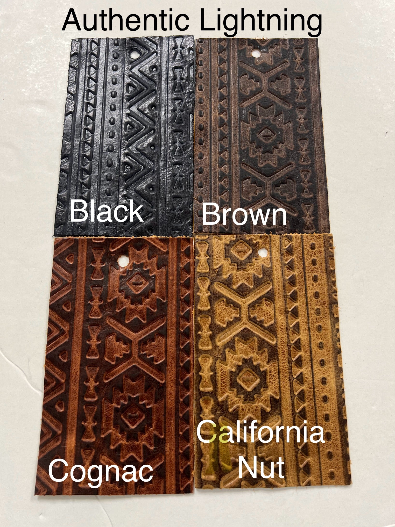 Authentic Lightning - showcases the rich historical roots tribal symbols have in todays fashion. Triangles, squares and dots were the original language widely used to record and interact. Finished with natural waxes and oils, and hand applied aniline dyes to display rich color.
