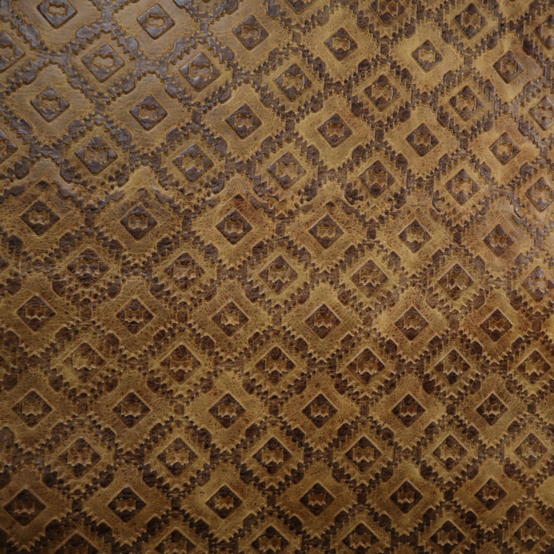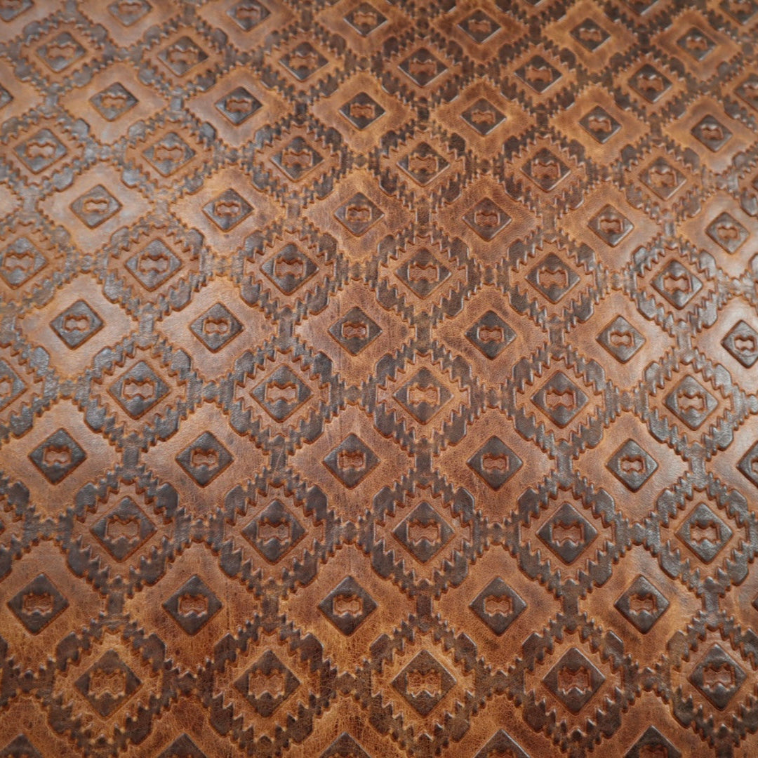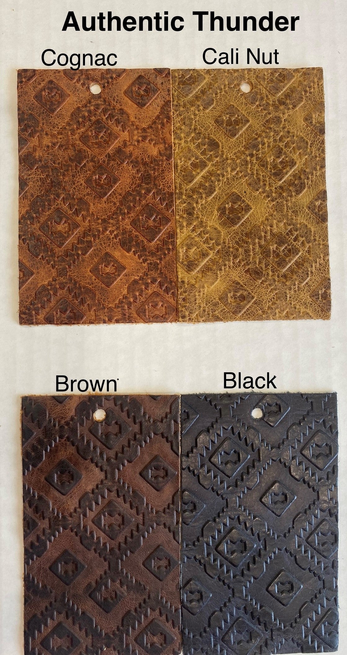 Authentic Thunder- made to embrace the American Navajo theme. This geometric design is easy to cut with deep valleys, creating highs and lows in color depth. Authentic thunder is finished with natural waxes and oils, and hand applied aniline dyes to display rich color.