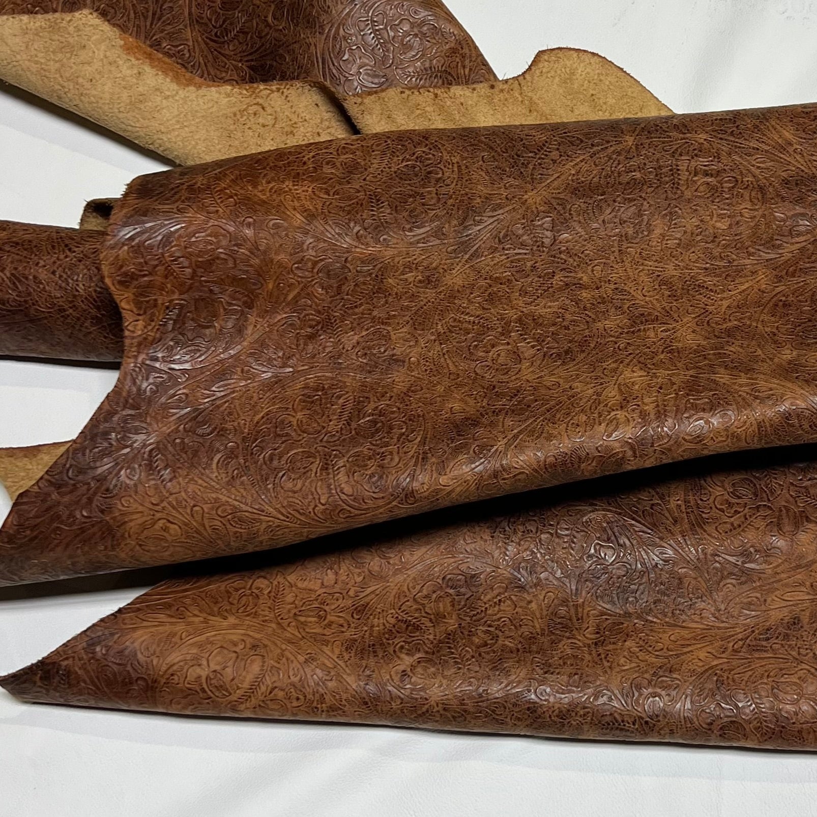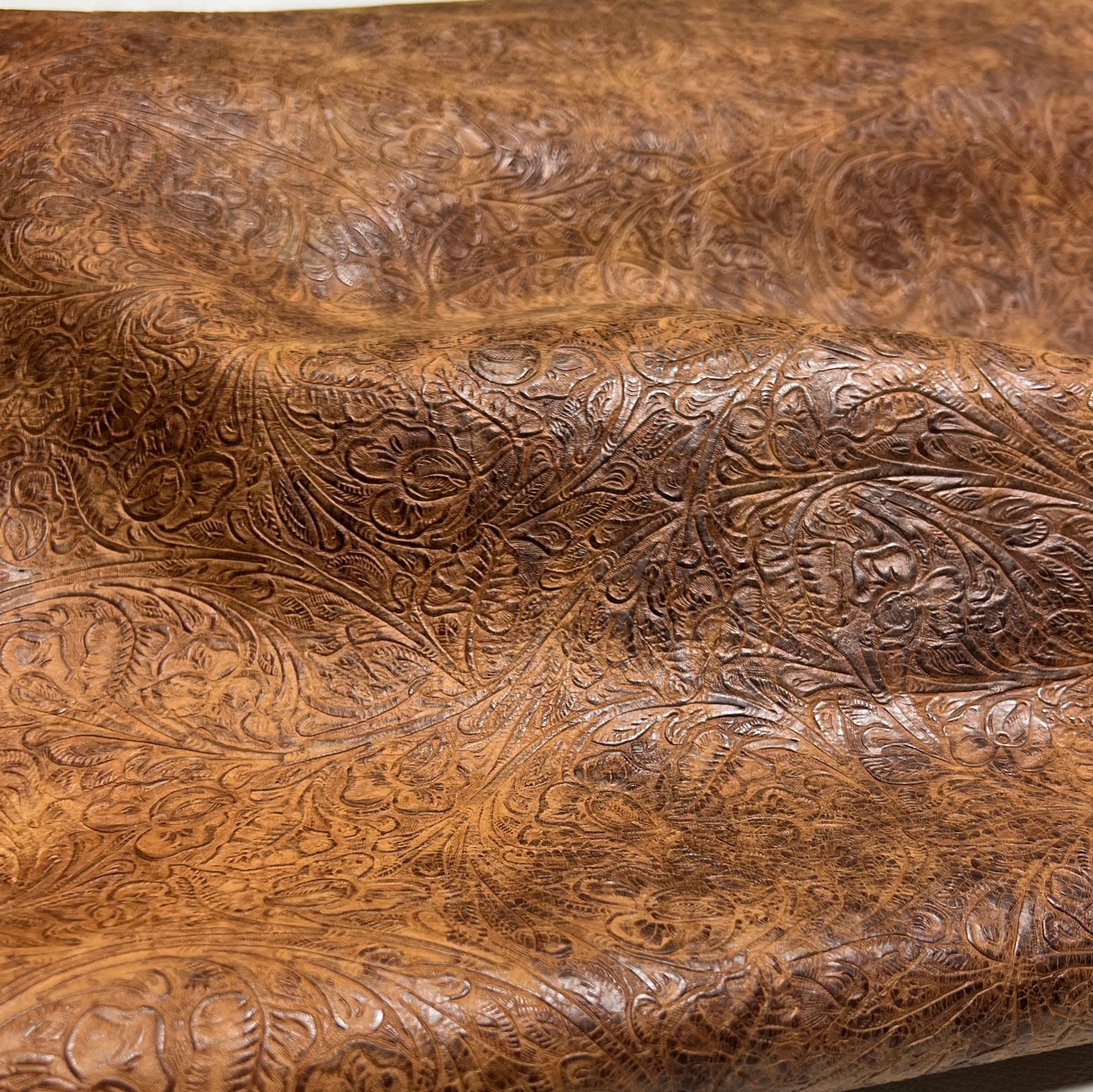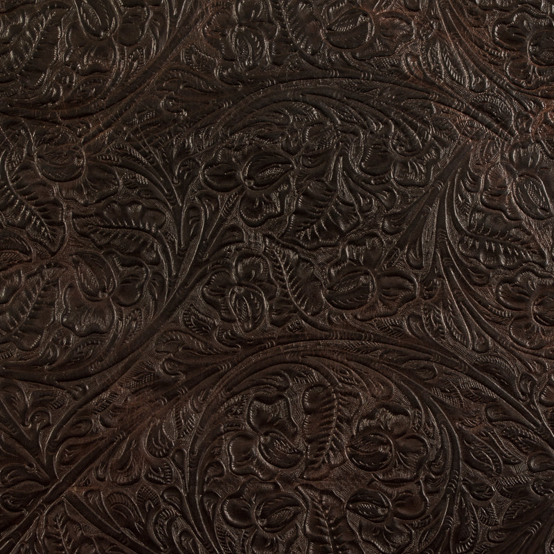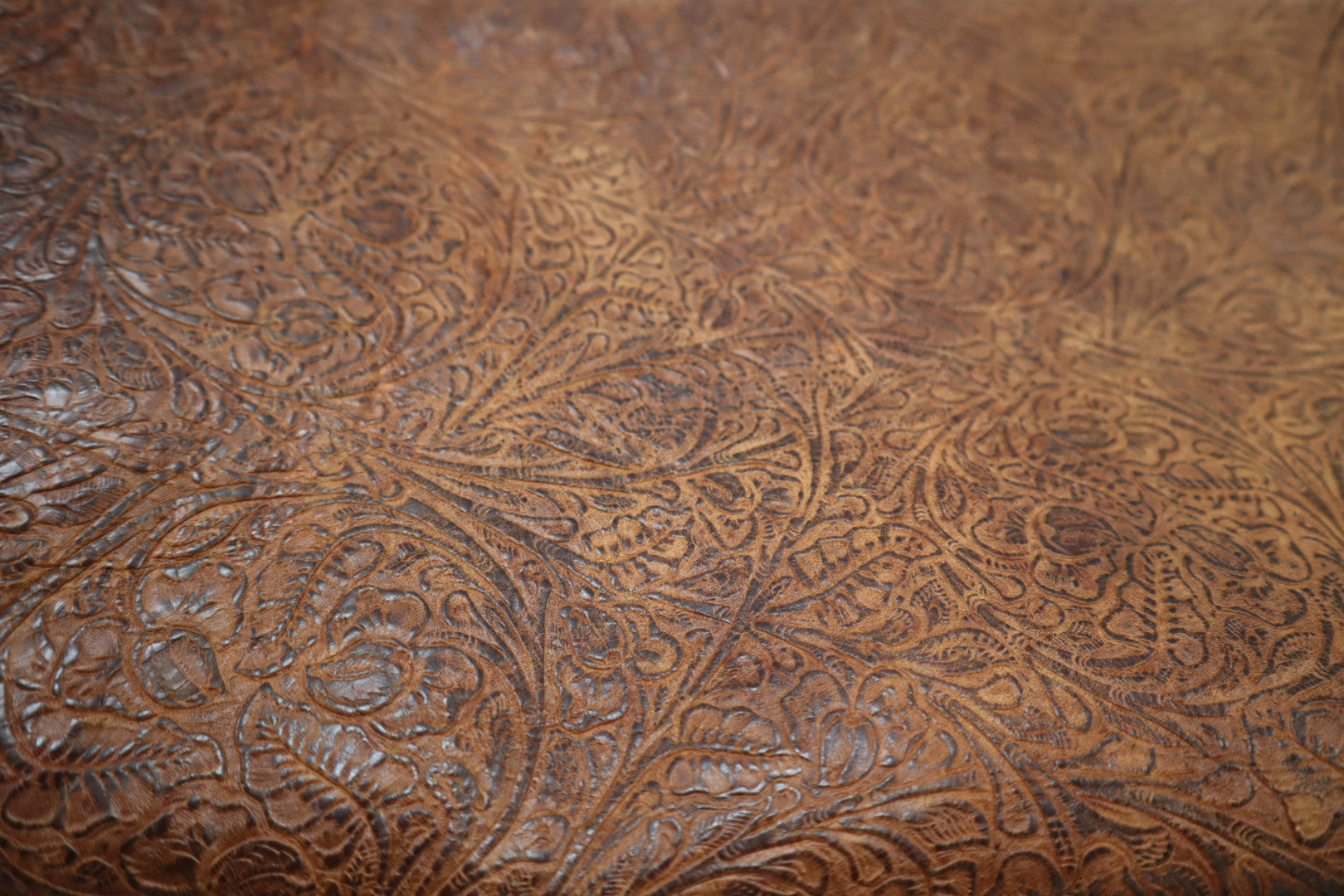 Authentic Western Tool - Embossed top grain cowhide in uniform tooled floral design. Natural dull wax top finish , hand rubbed aniline dyes, washed at final to semi shrink texture for a more realistic look and feel. Colors will vary from skin to skin as aniline dyed finishing by hand.
