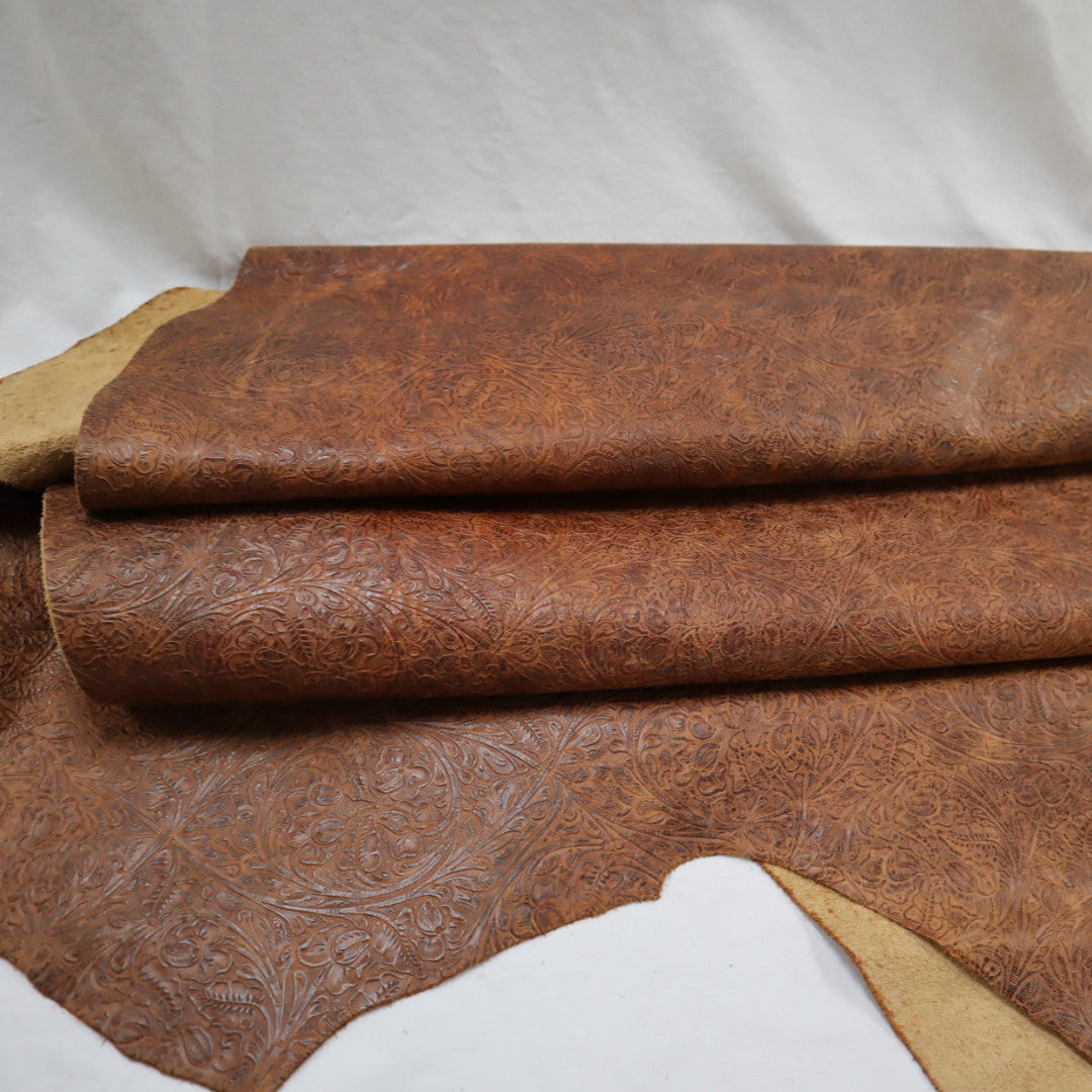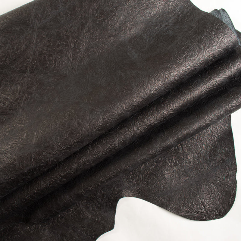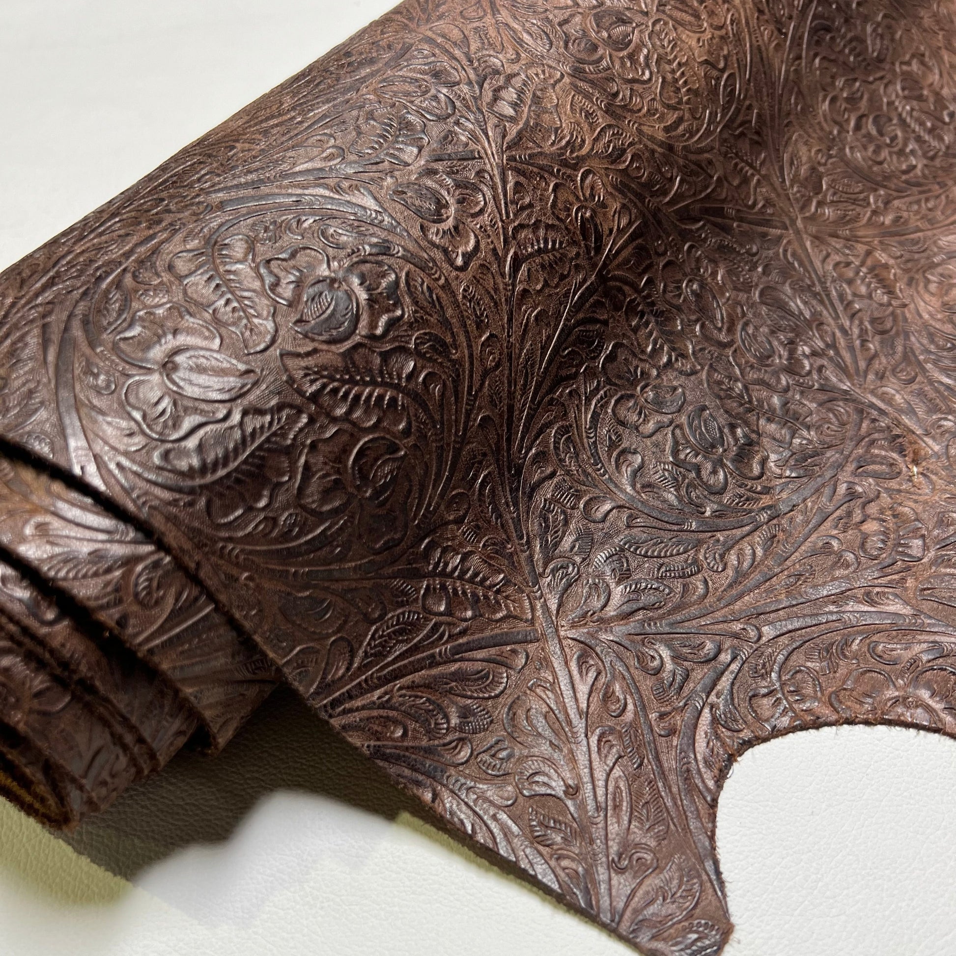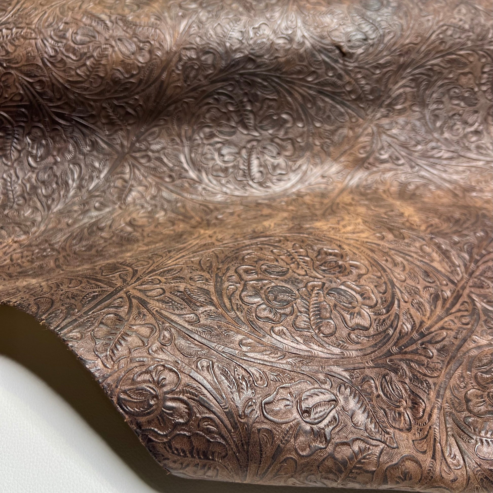 Authentic Western Tool - Embossed top grain cowhide in uniform tooled floral design. Natural dull wax top finish , hand rubbed aniline dyes, washed at final to semi shrink texture for a more realistic look and feel. Colors will vary from skin to skin as aniline dyed finishing by hand.