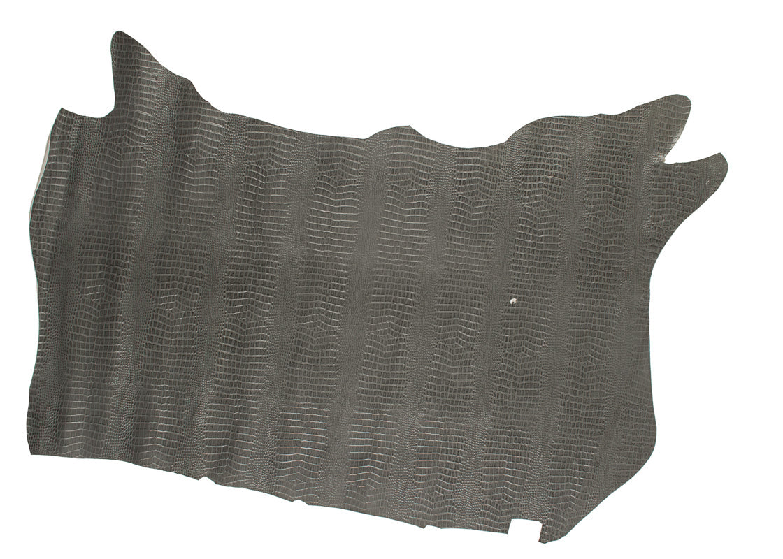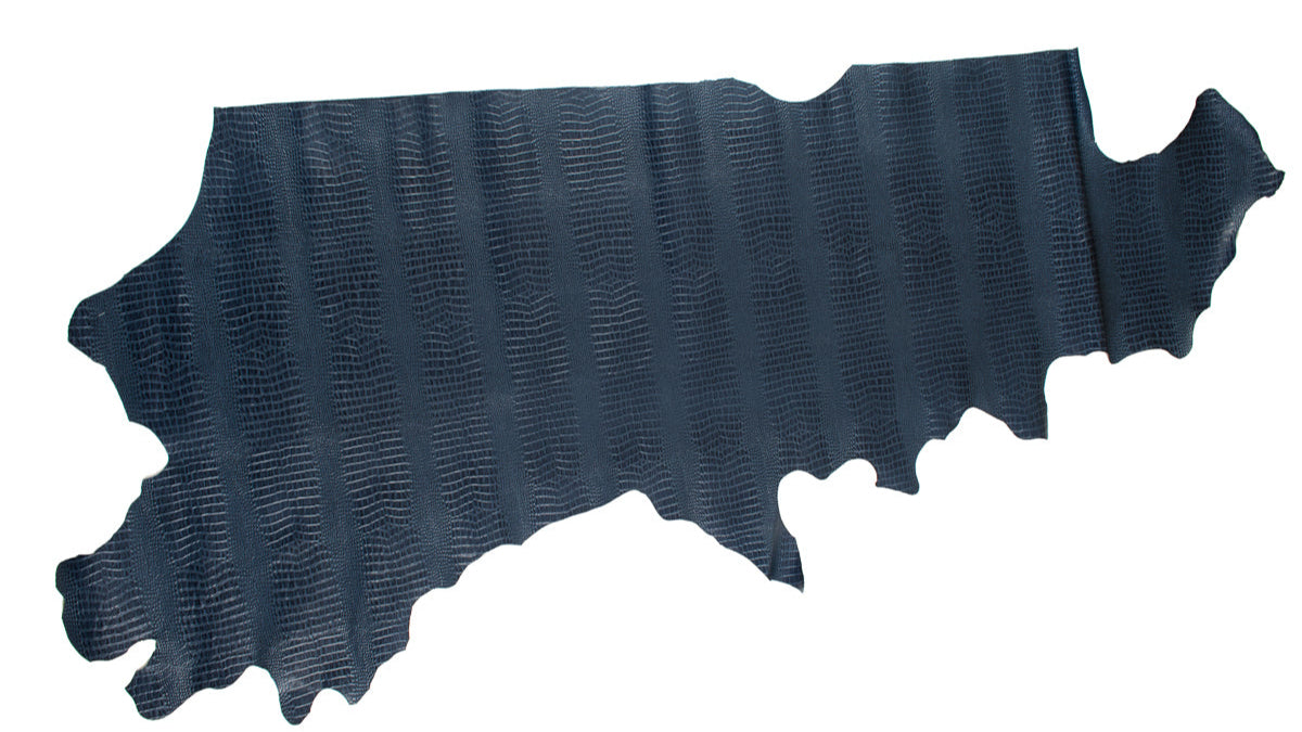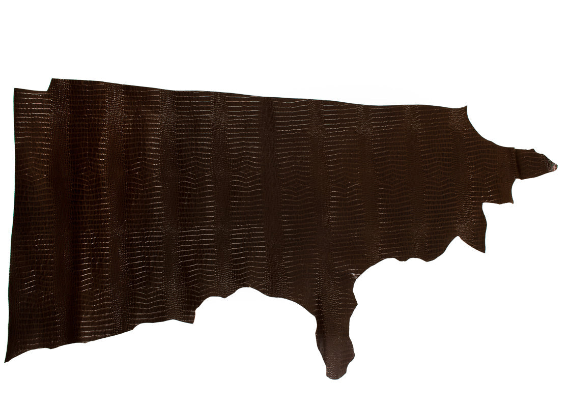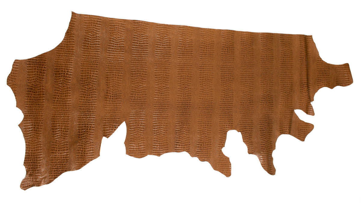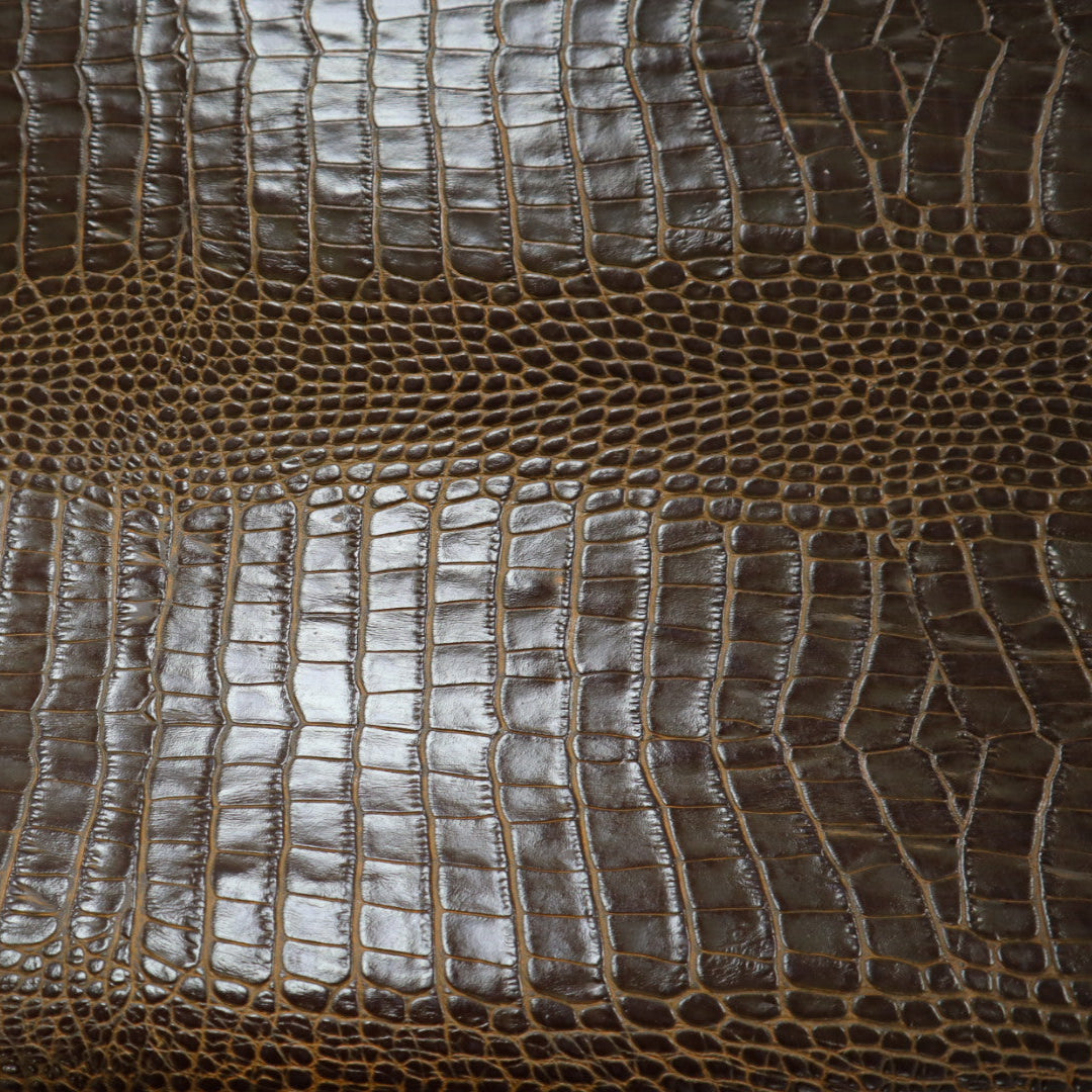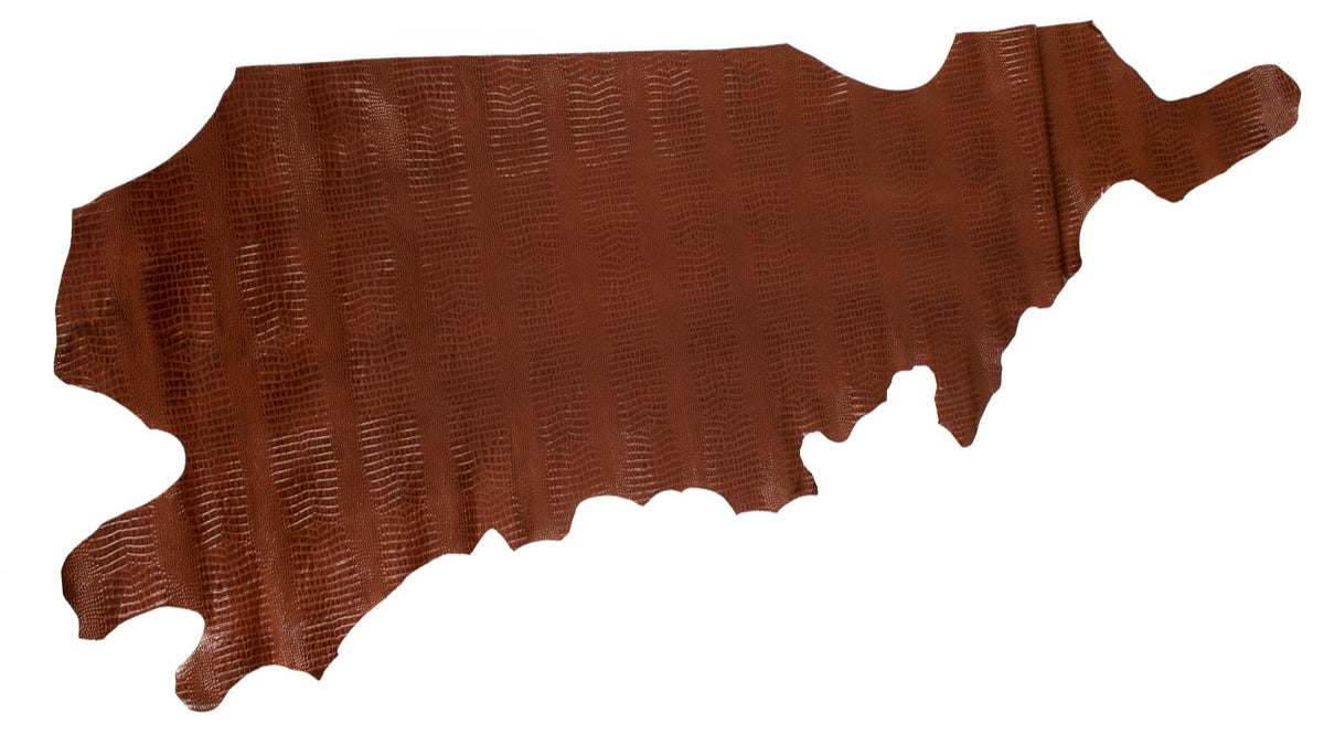 Barcelona- Embossed top grain cowhide in repeating belly print of crocodile. Aniline color top applied, hand antiqued effect with a glazed finish. Colors will vary from skin to skin as aniline dyed finished system.