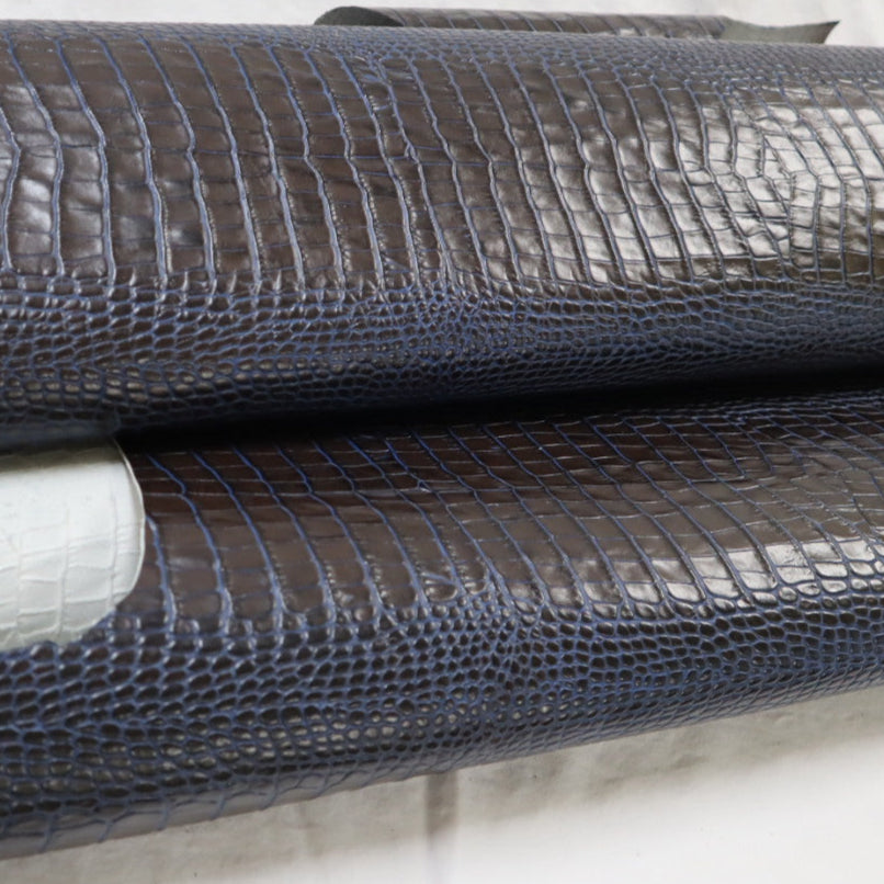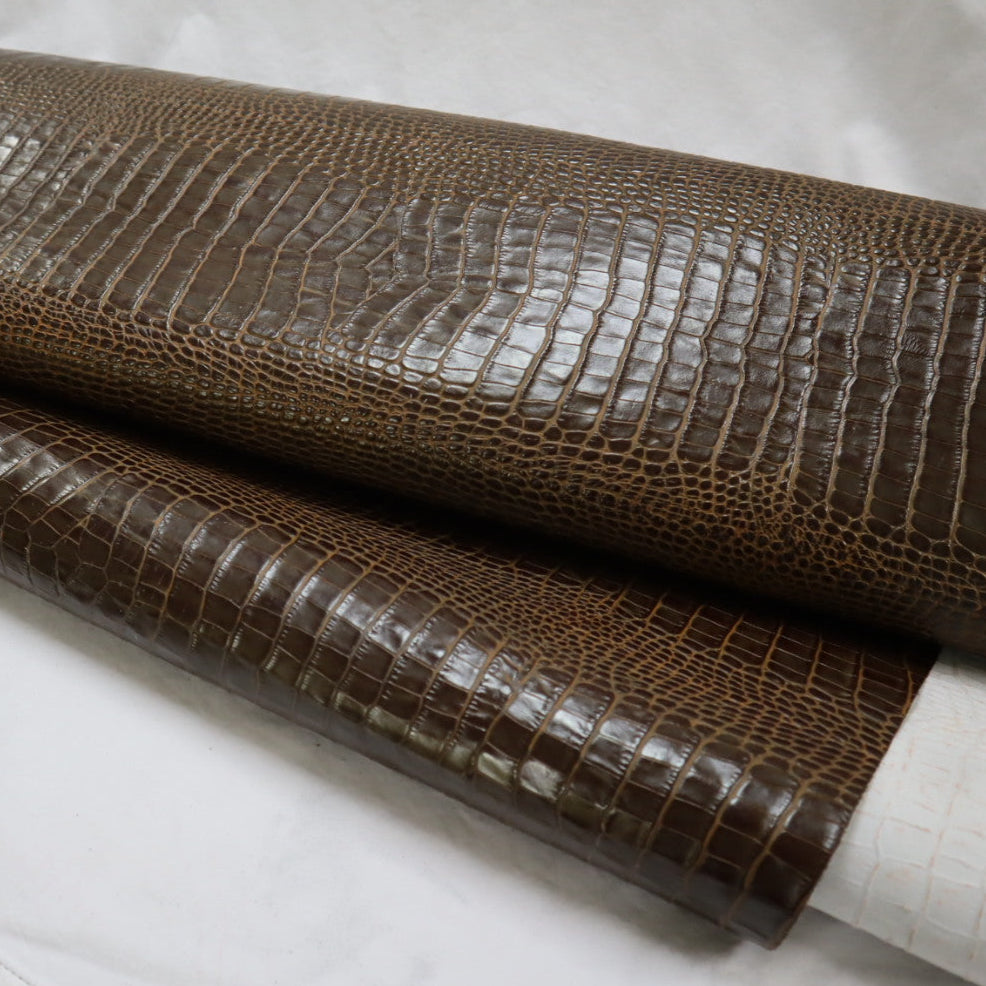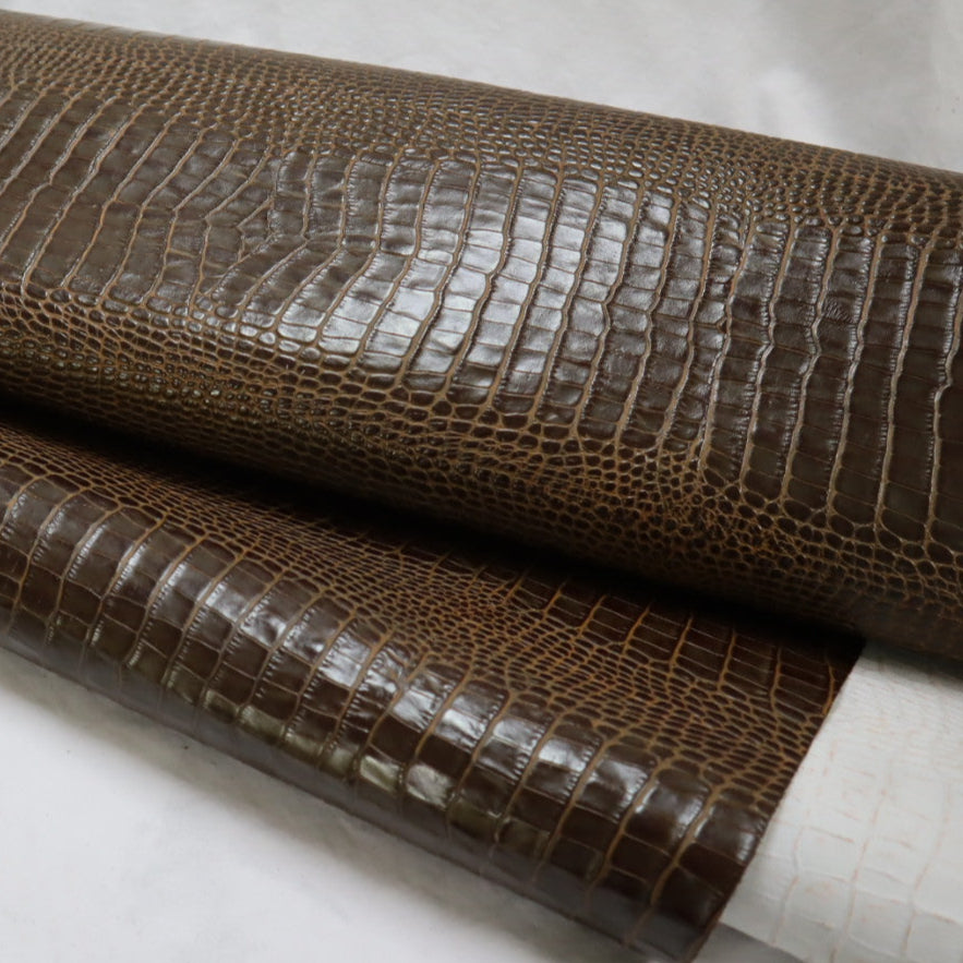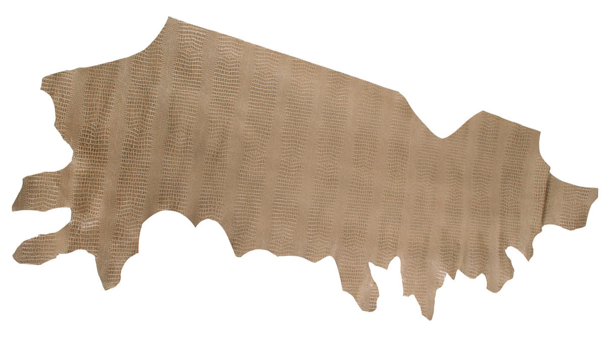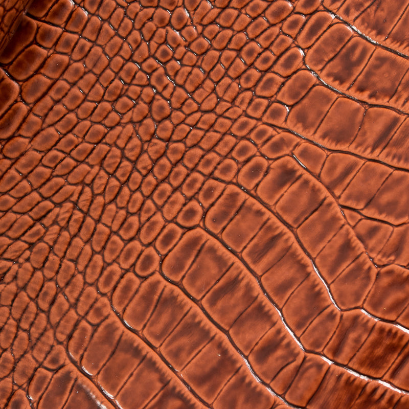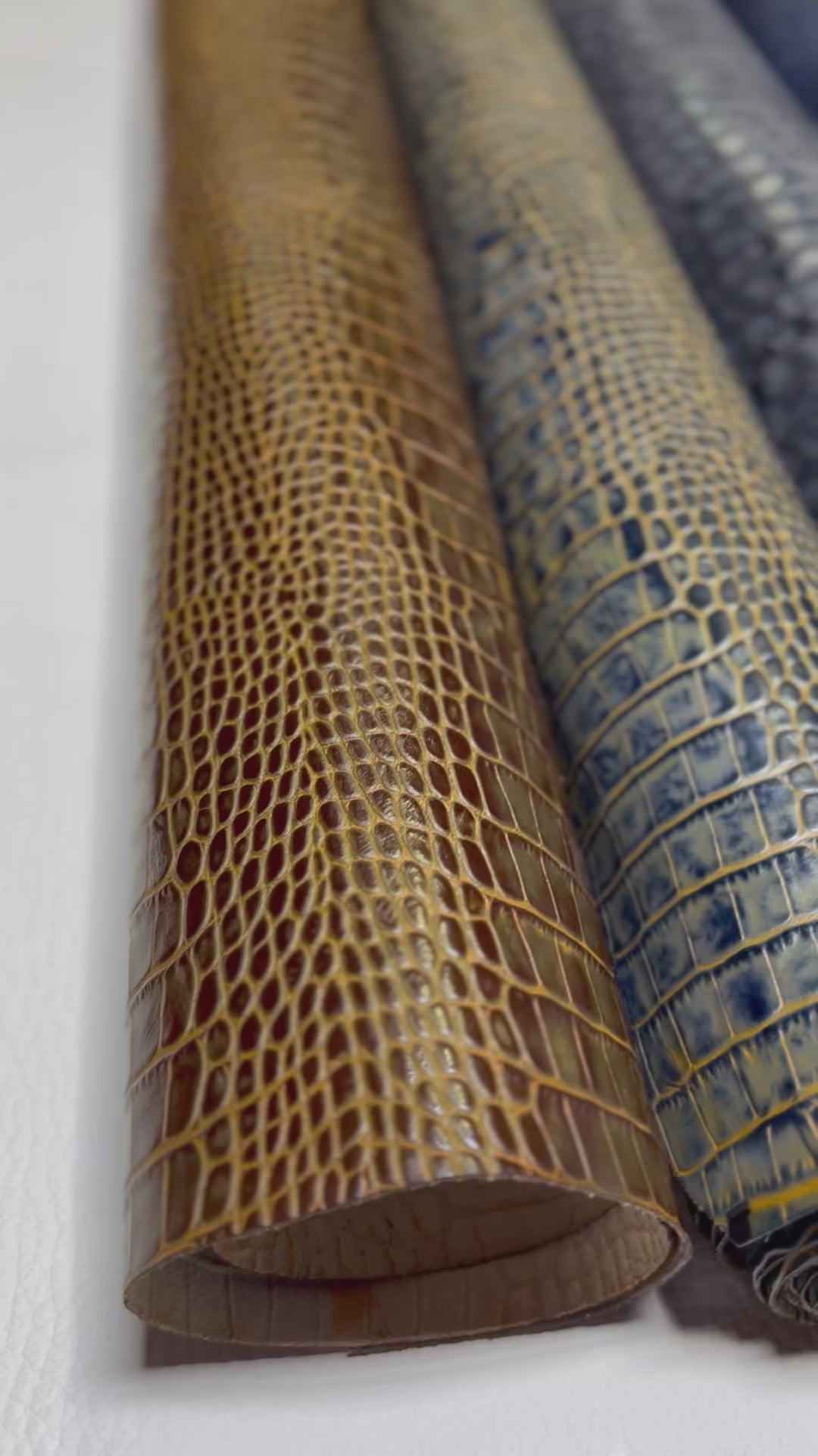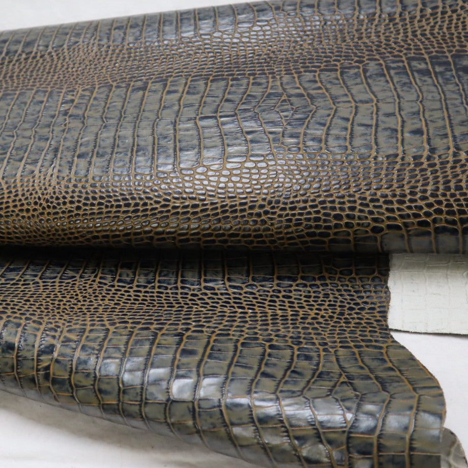 Barcelona- Embossed top grain cowhide in repeating belly print of crocodile. Aniline color top applied, hand antiqued effect with a glazed finish. Colors will vary from skin to skin as aniline dyed finished system.