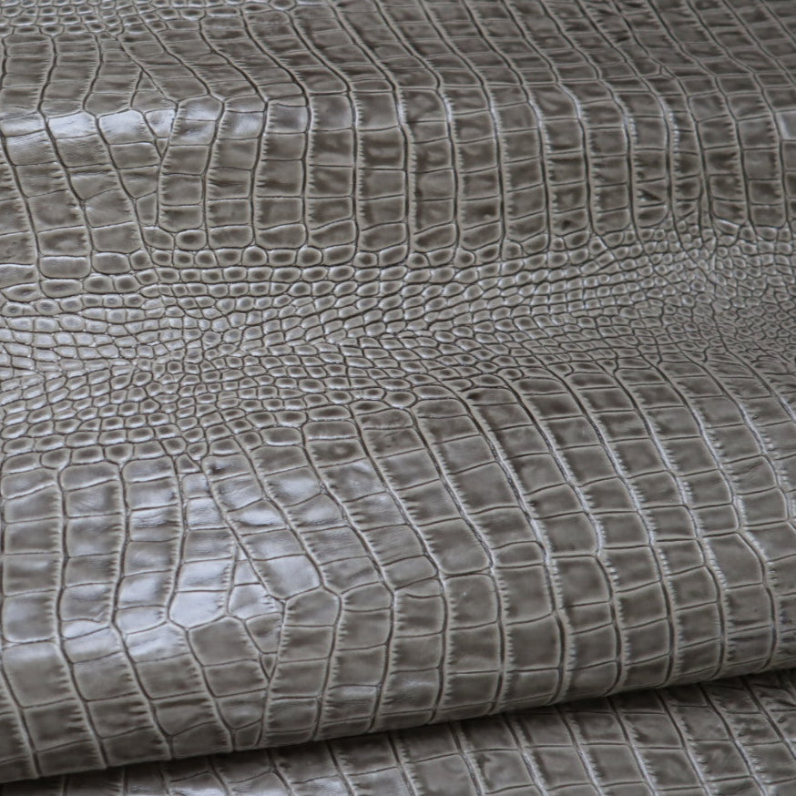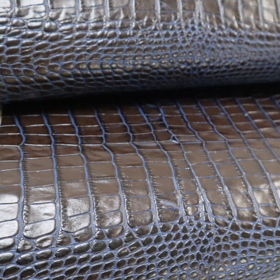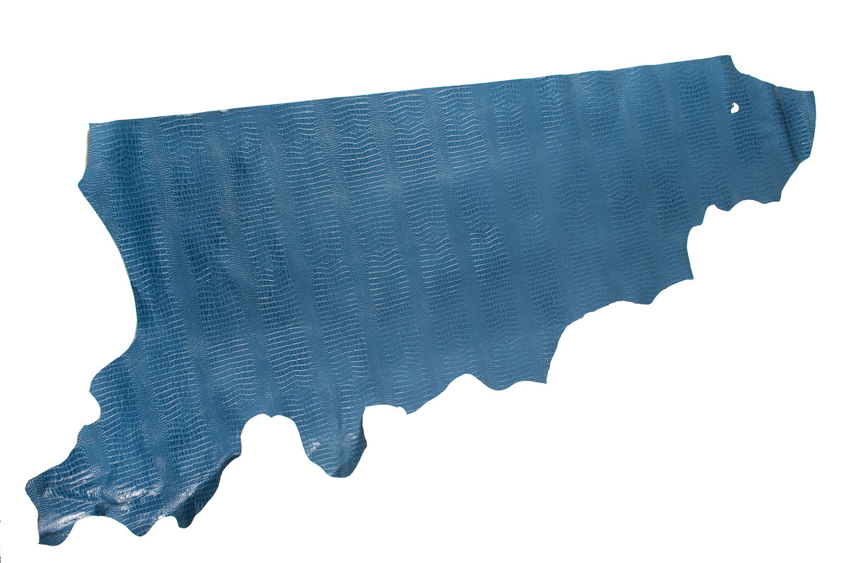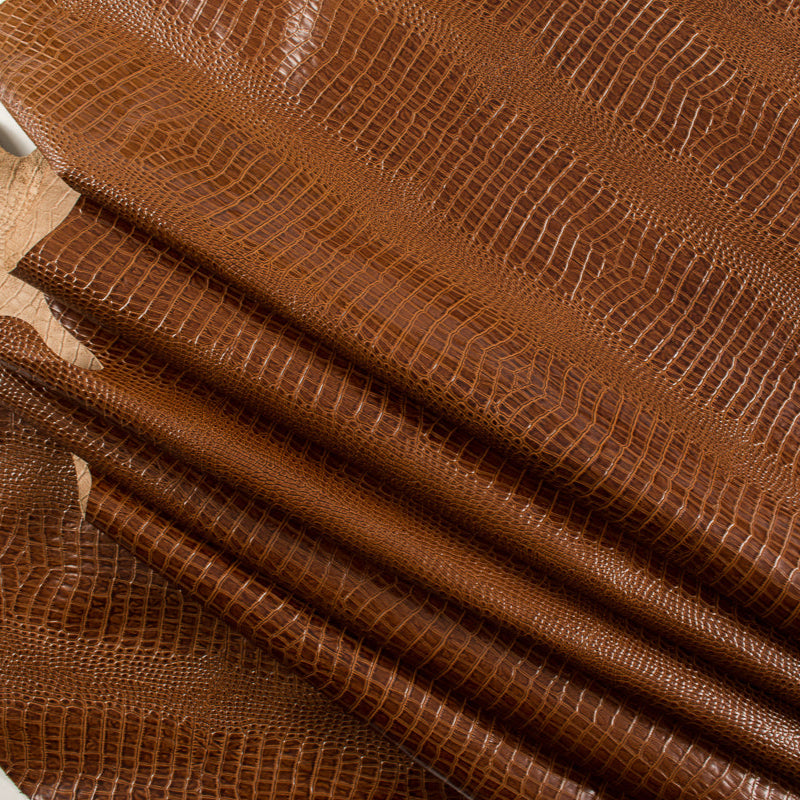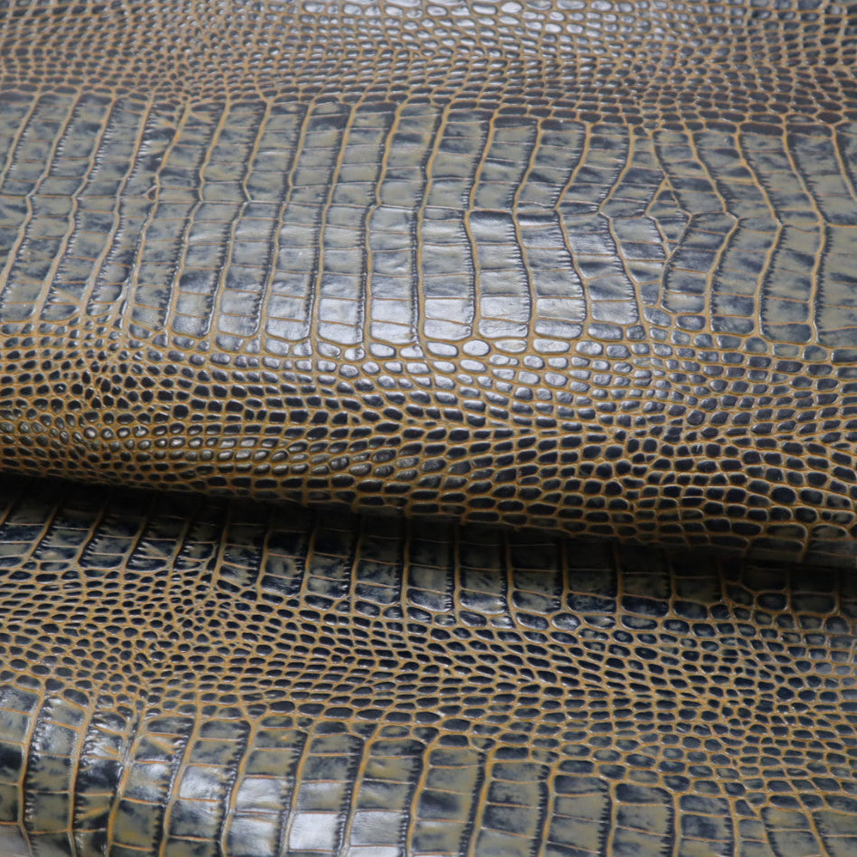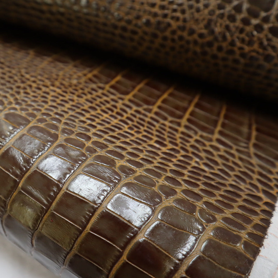 Barcelona- Embossed top grain cowhide in repeating belly print of crocodile. Aniline color top applied, hand antiqued effect with a glazed finish. Colors will vary from skin to skin as aniline dyed finished system.
