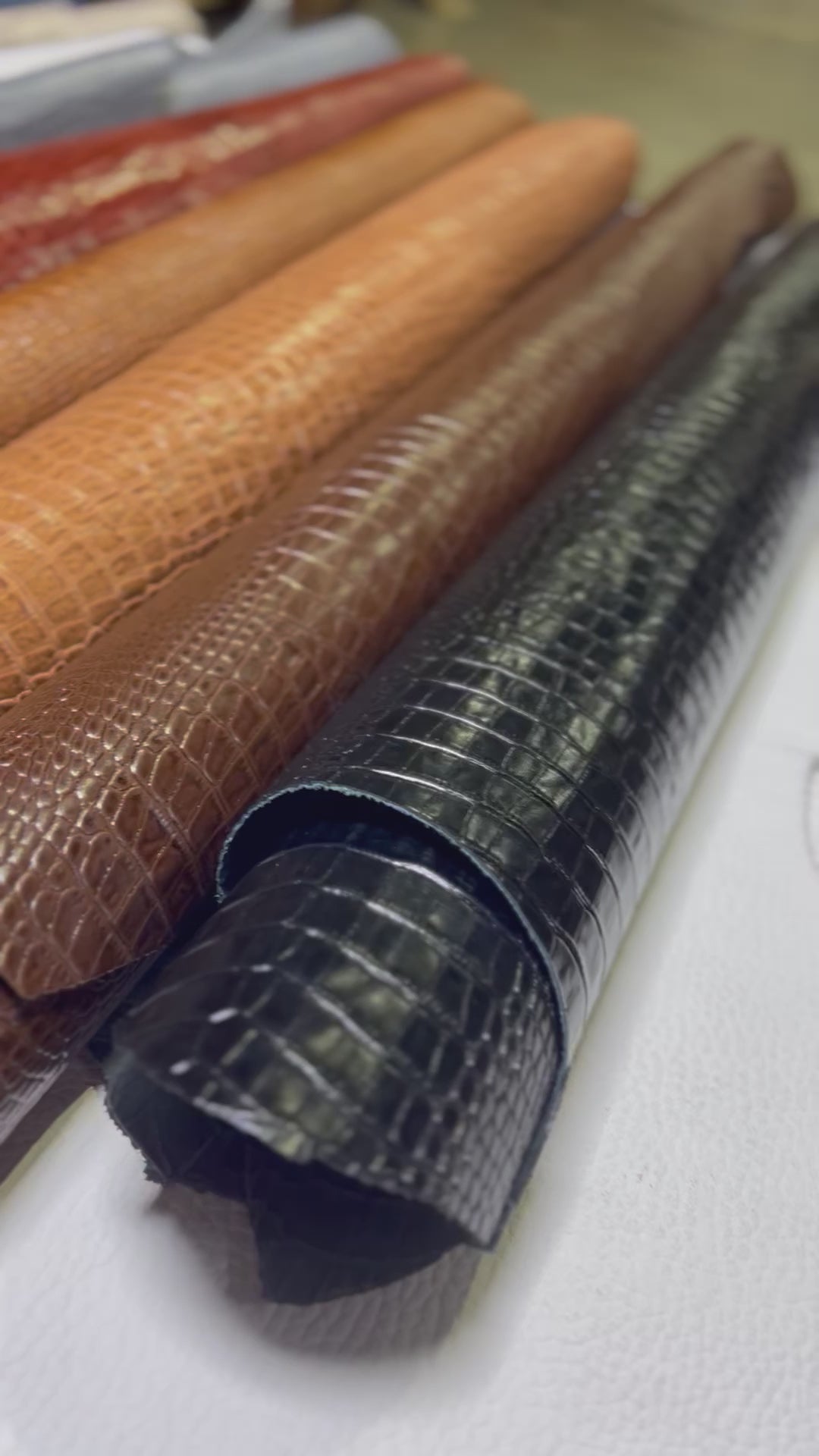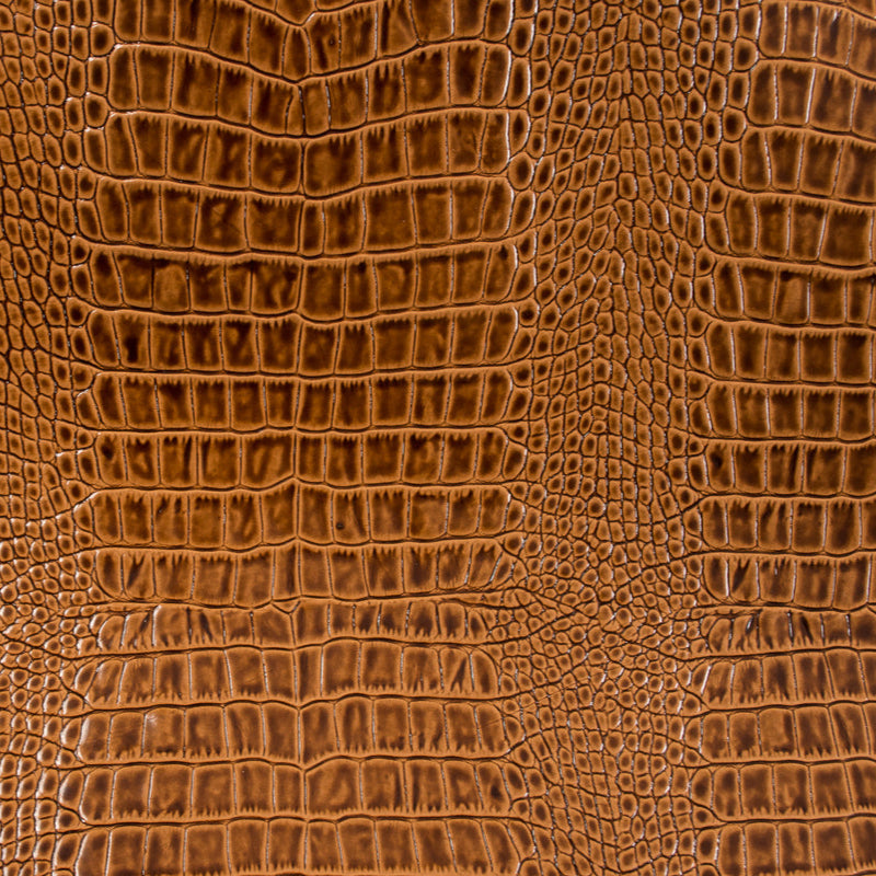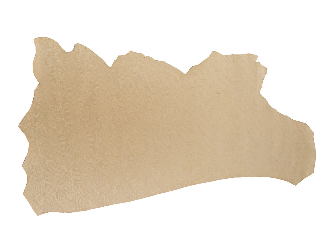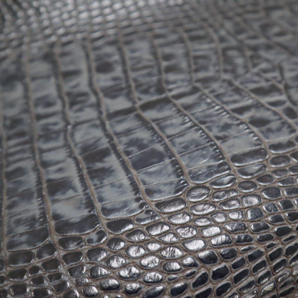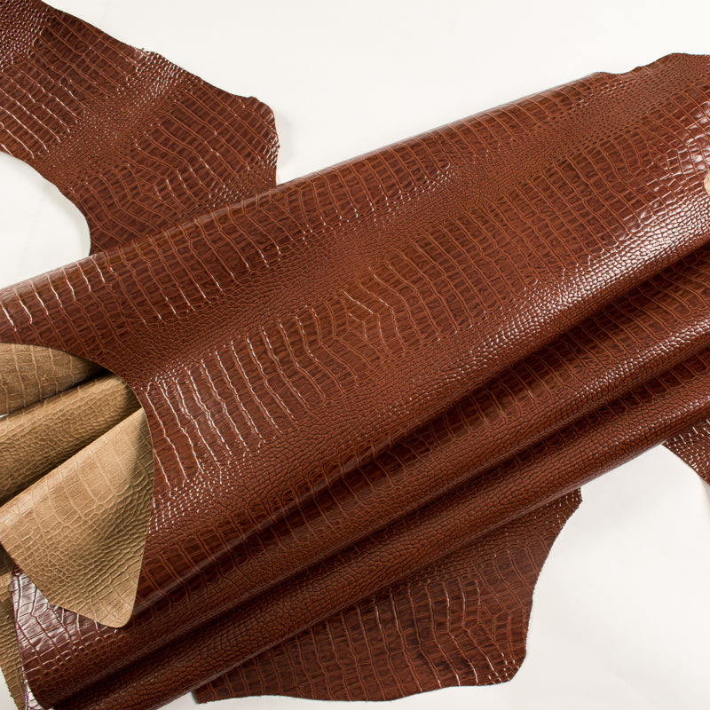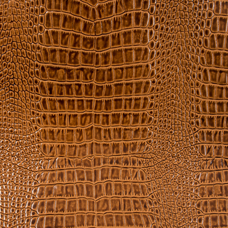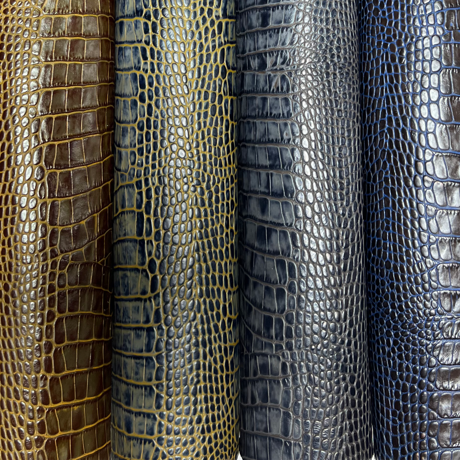 Barcelona- Embossed top grain cowhide in repeating belly print of crocodile. Aniline color top applied, hand antiqued effect with a glazed finish. Colors will vary from skin to skin as aniline dyed finished system.