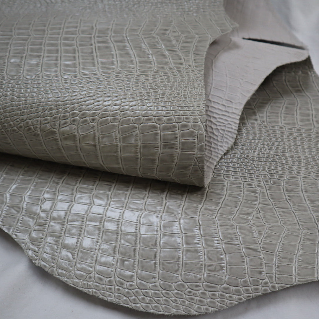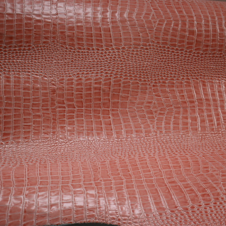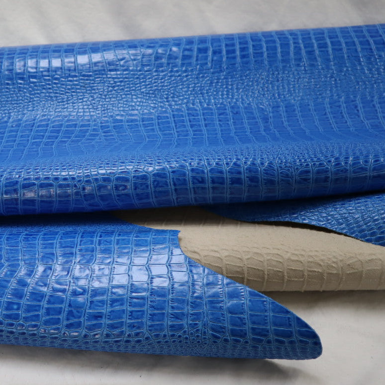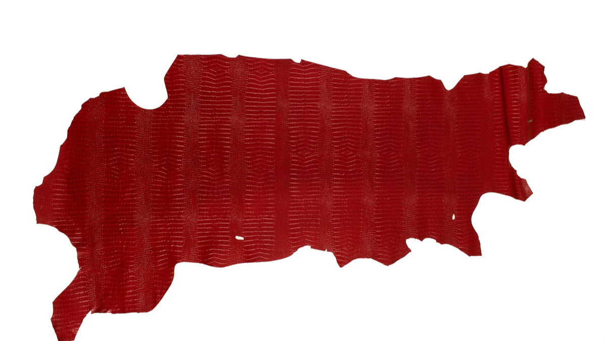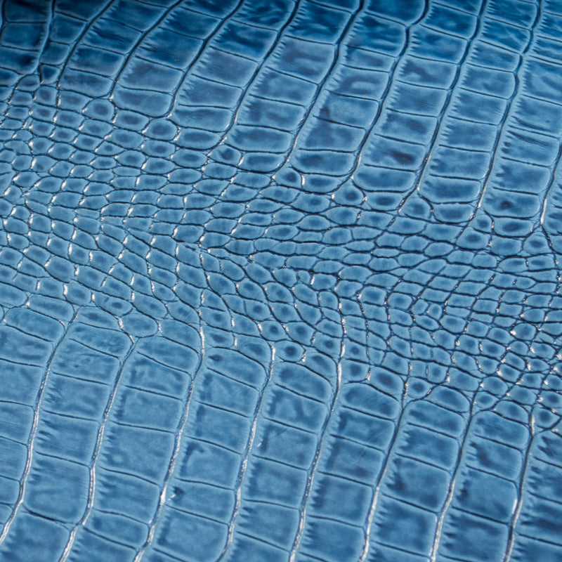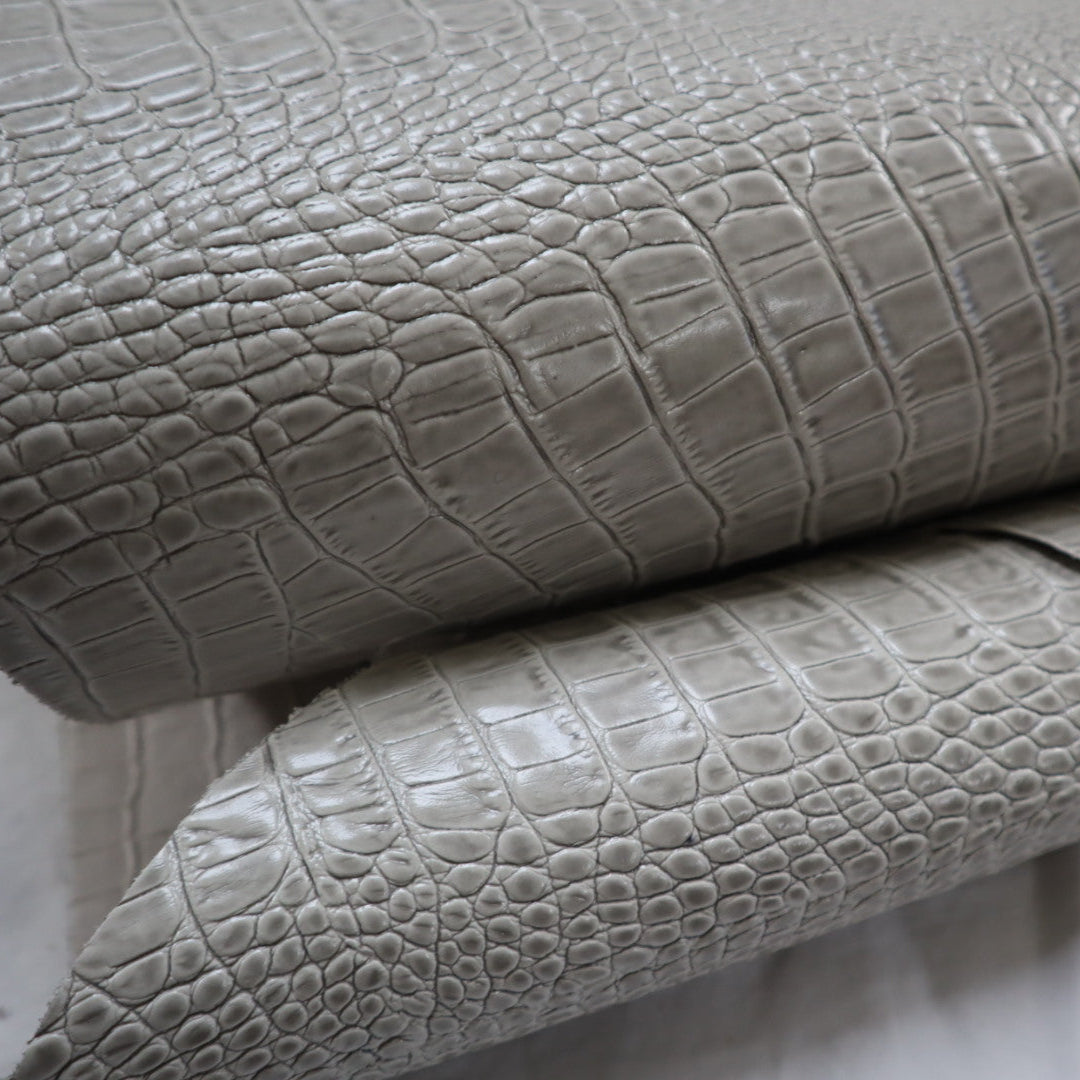 Barcelona- Embossed top grain cowhide in repeating belly print of crocodile. Aniline color top applied, hand antiqued effect with a glazed finish. Colors will vary from skin to skin as aniline dyed finished system.