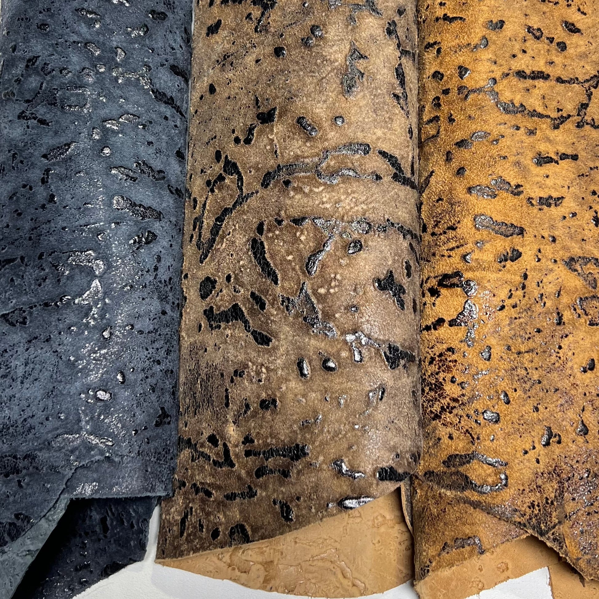 BS Safari Moon face - Embossed rough out, top grain cowhide in uniform textured design. Hand rubbed aniline top finish, washed and shrunken at final for soft temper. Colors will vary skin to skin due to washing process and aniline dye process by hand.