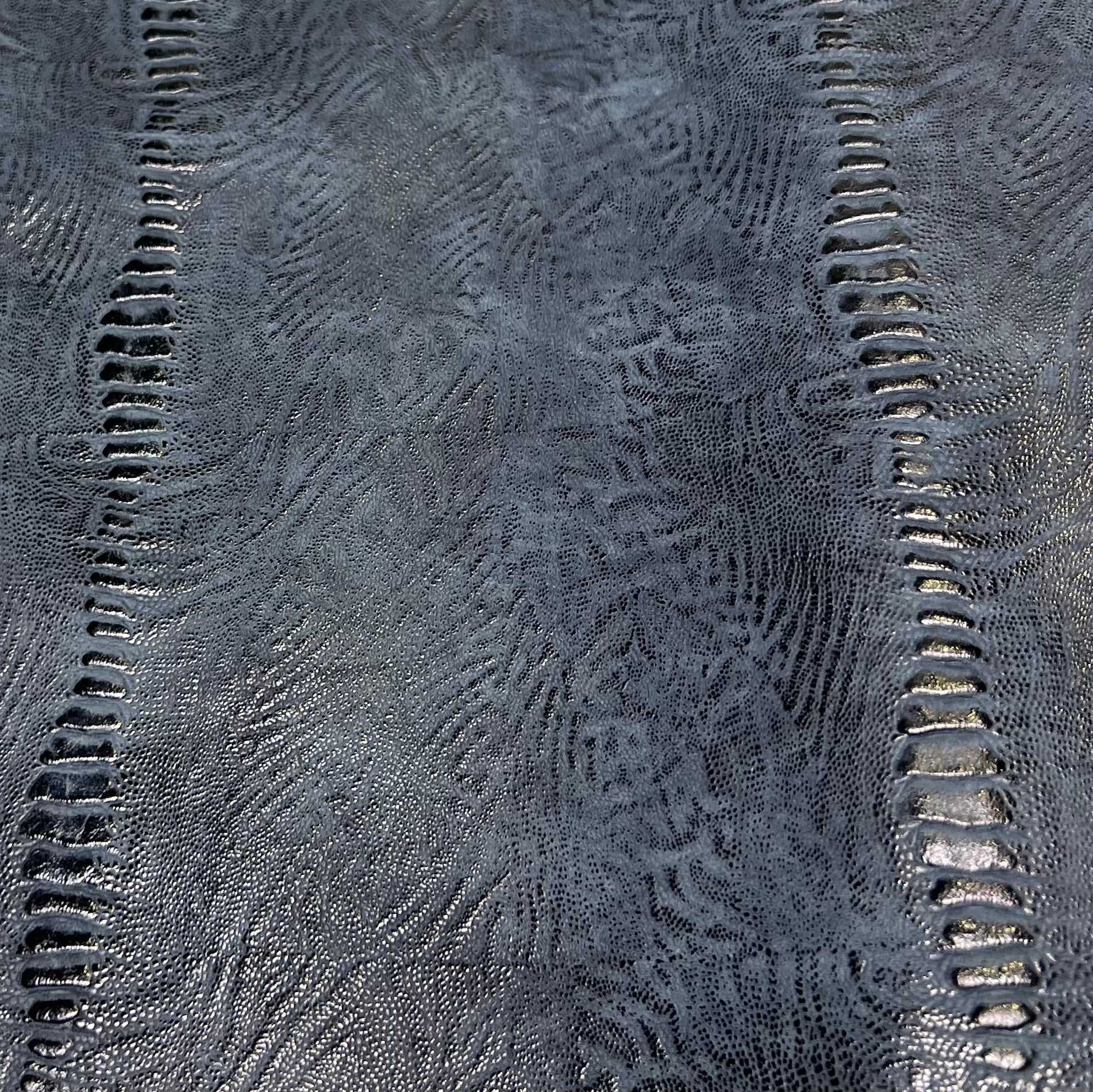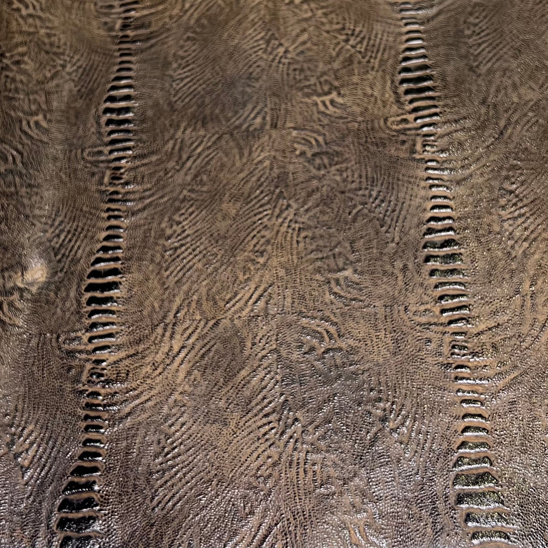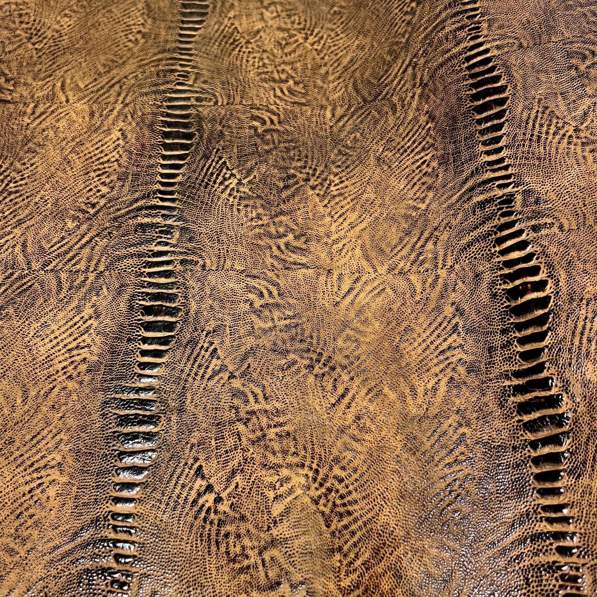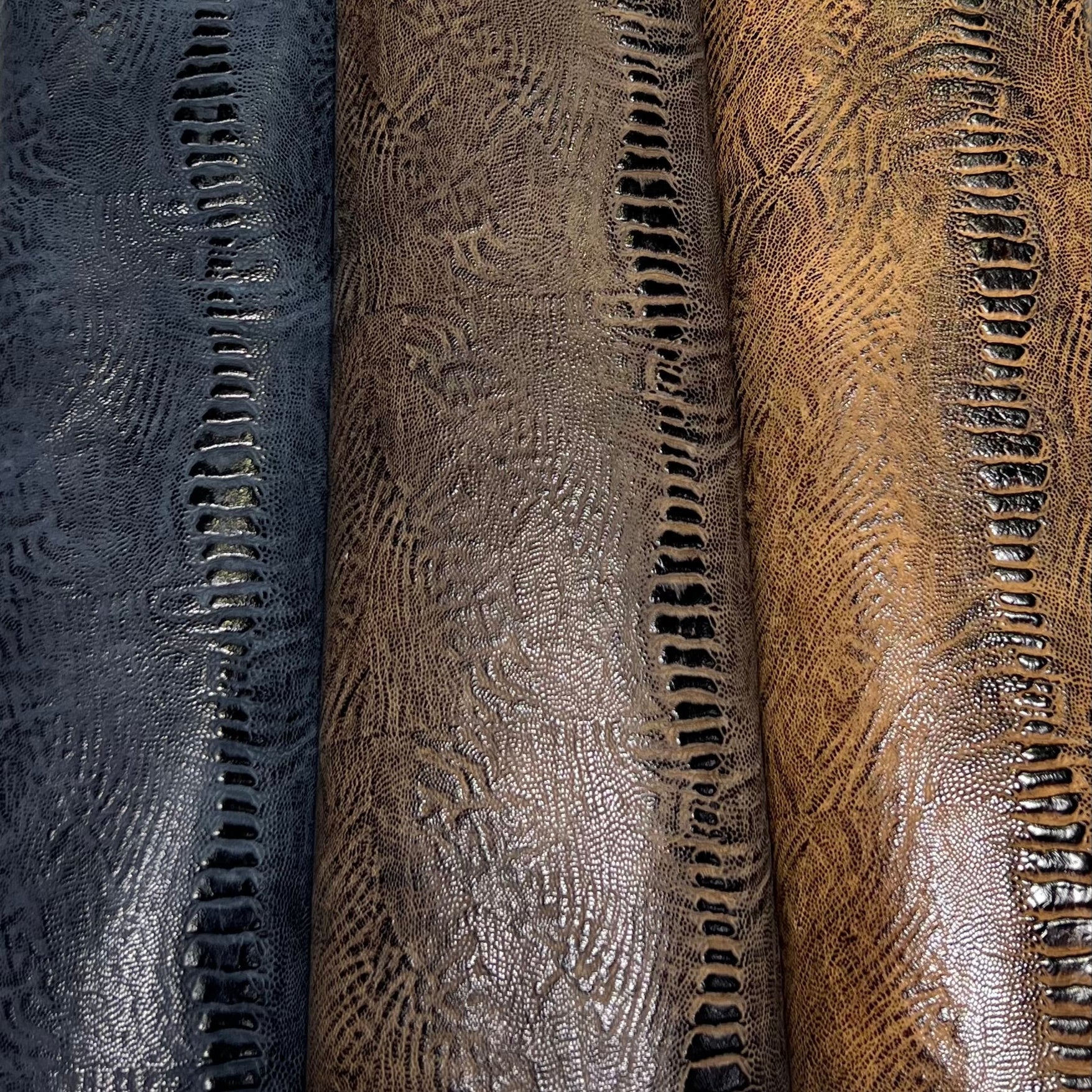 Safari Pinto - Embossed top grain cowhide in repeating ostrich leg design. Hand rubbed aniline top finish, washed and shrunken at final for soft temper. Colors will vary skin to skin due to washing process and aniline dye process by hand.