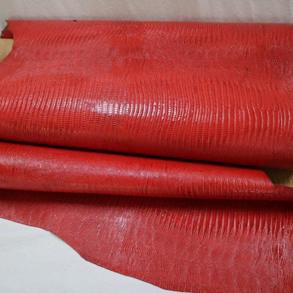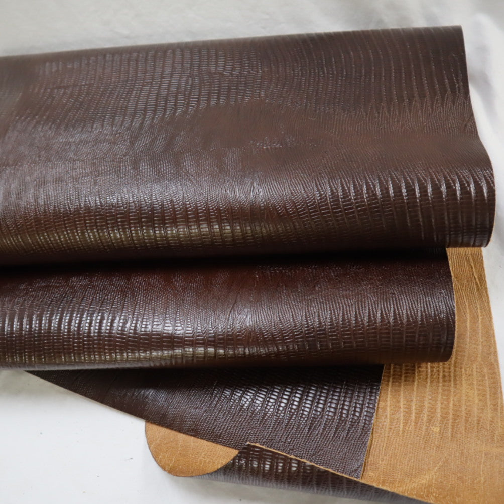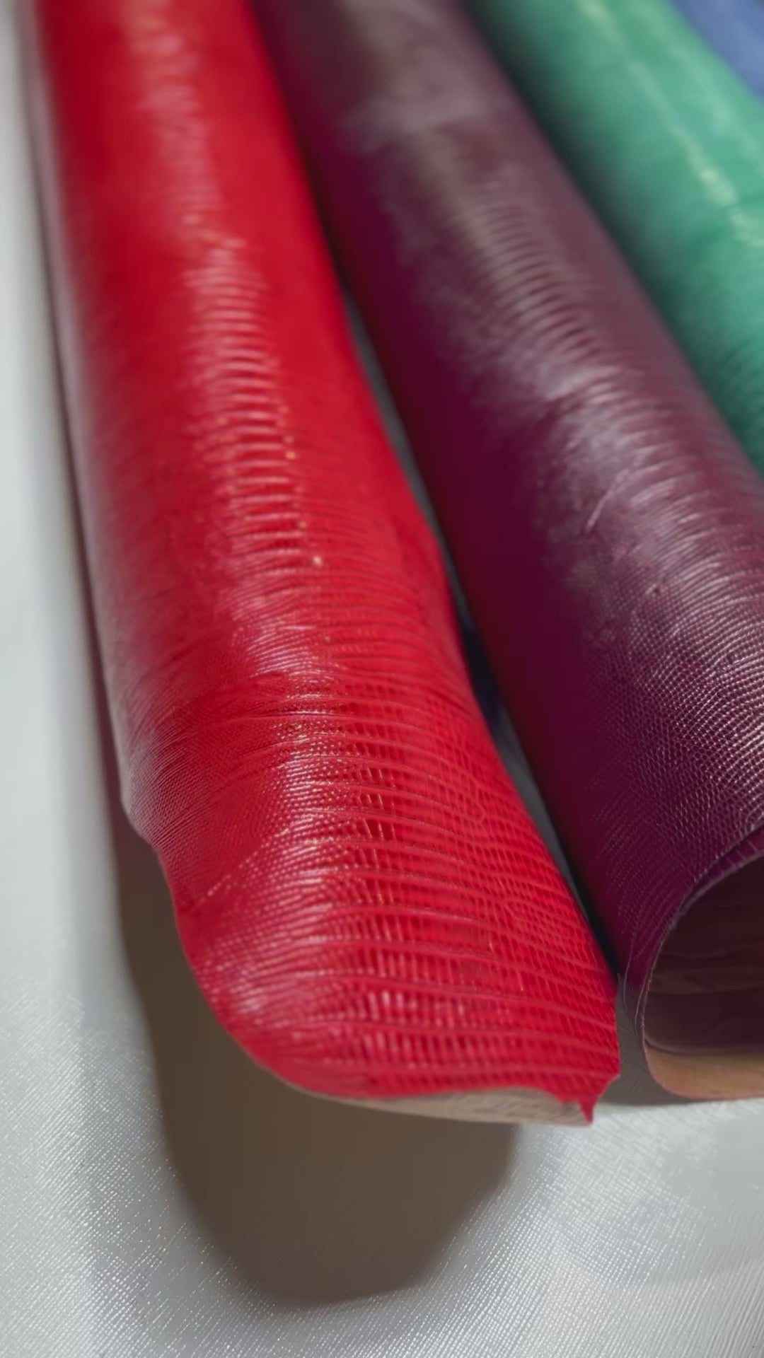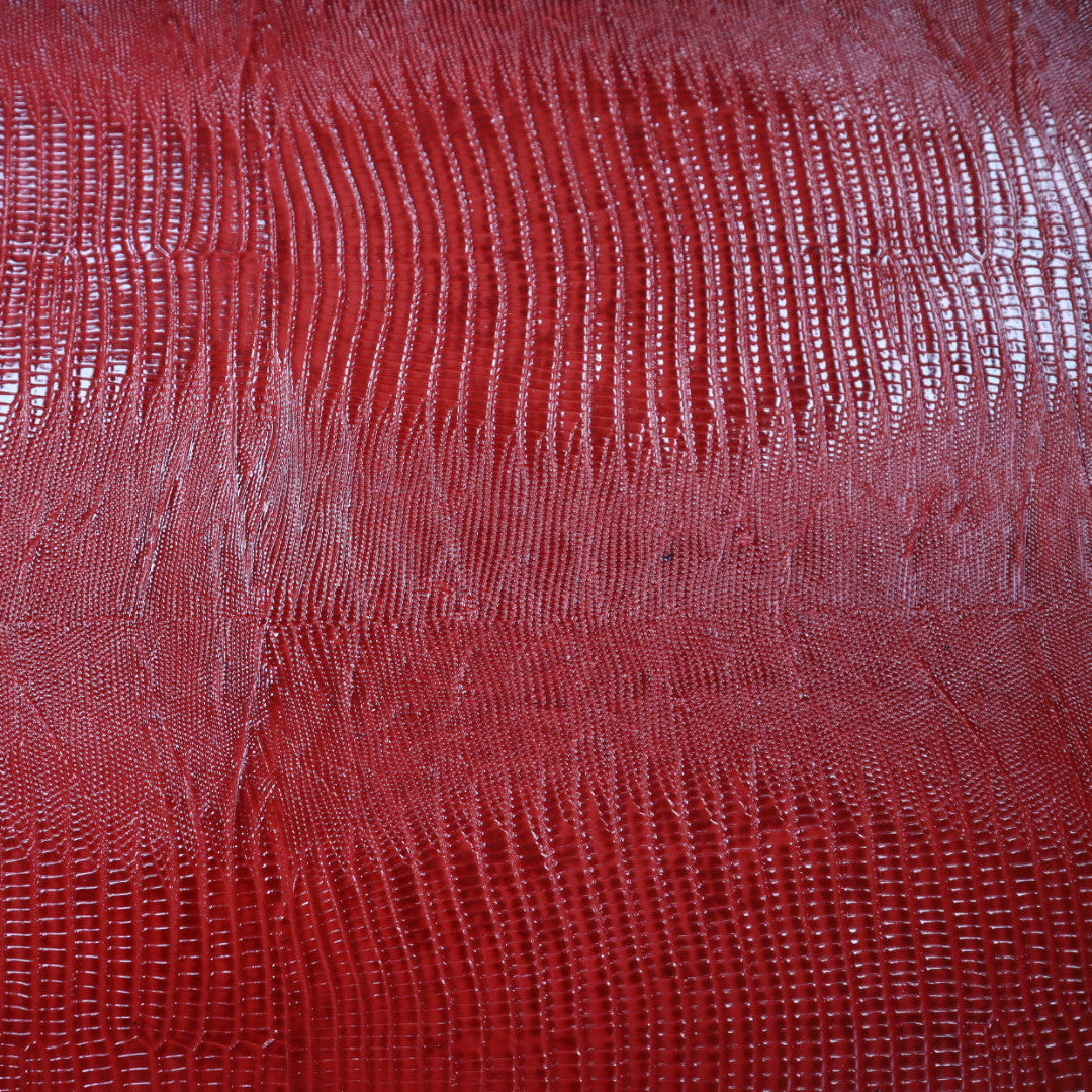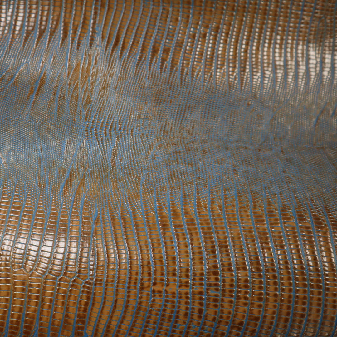 Classic Teju- Embossed top grain cowhide in repeating teju lizard print with high and firm embossing effect. Aniline dyed crust, aniline hand tipped top finish with a shine glaze. Tanned to be firm temper to hold the print. Colors may vary skin to skin due to hand made anline production.