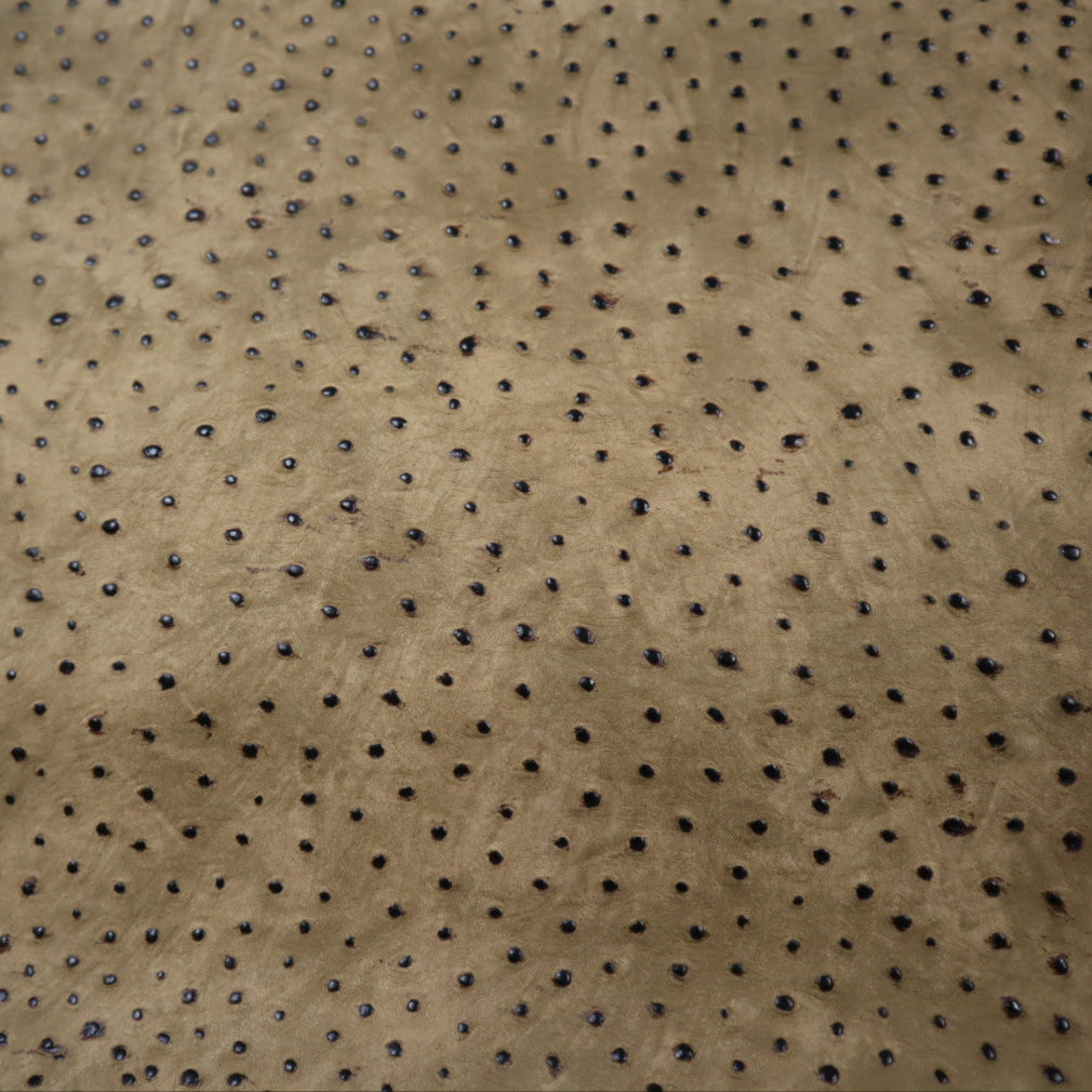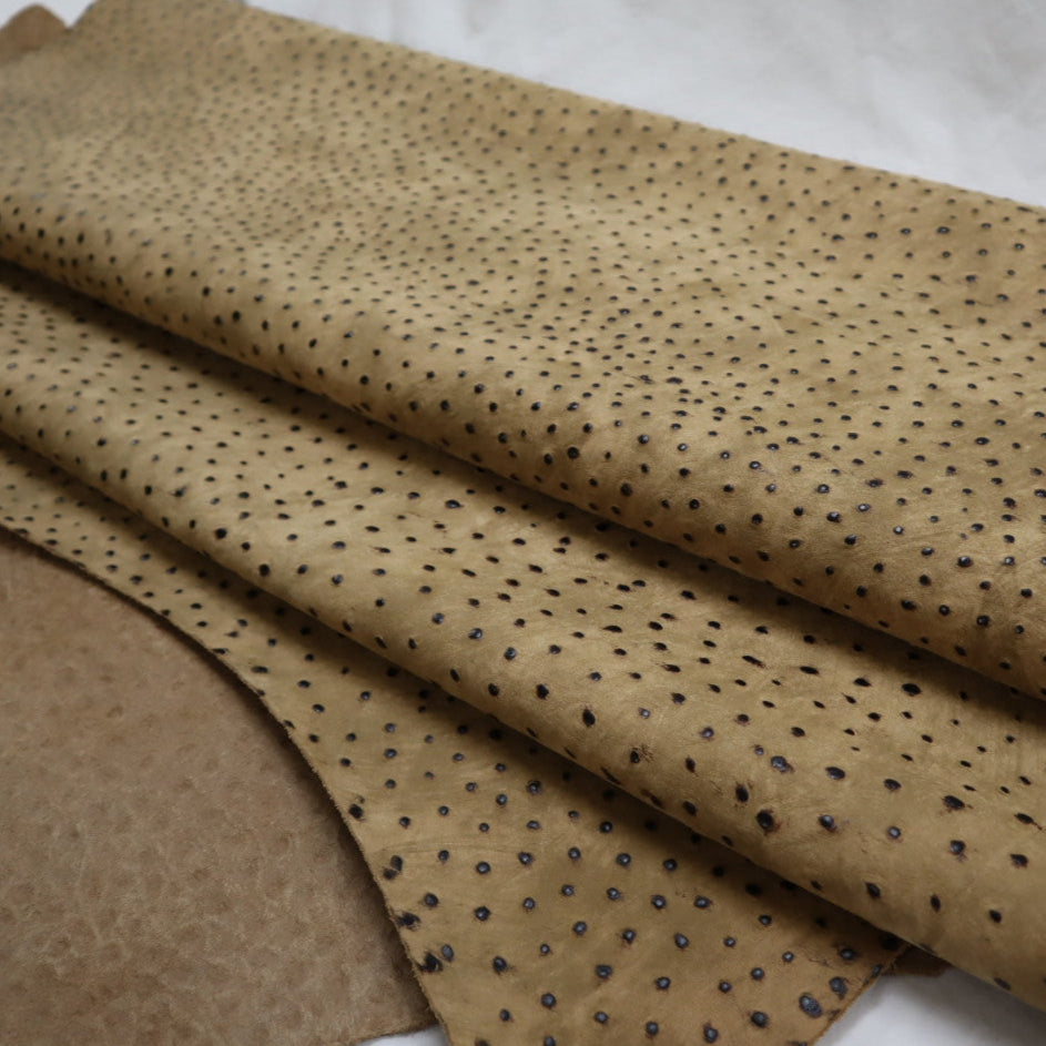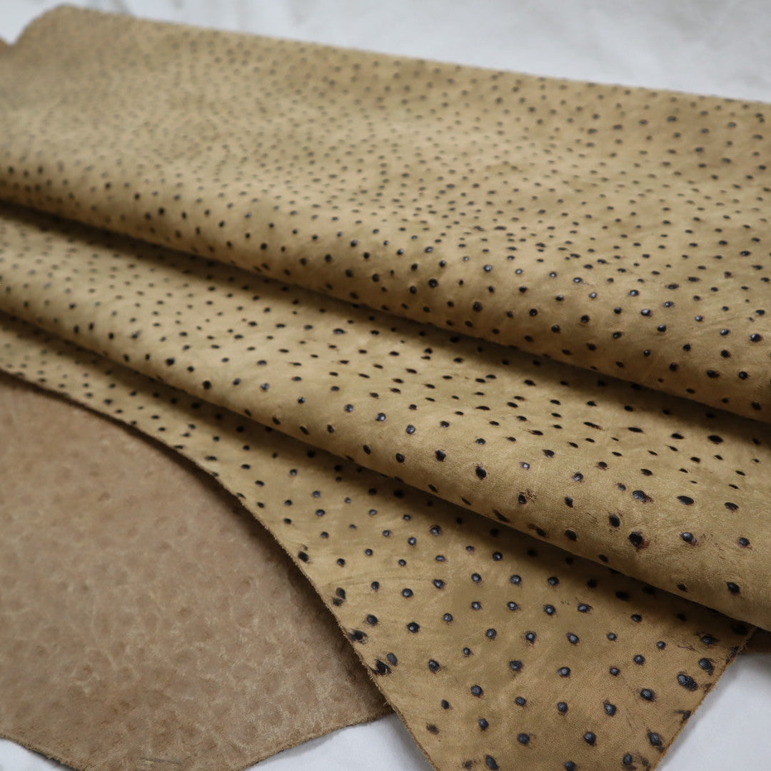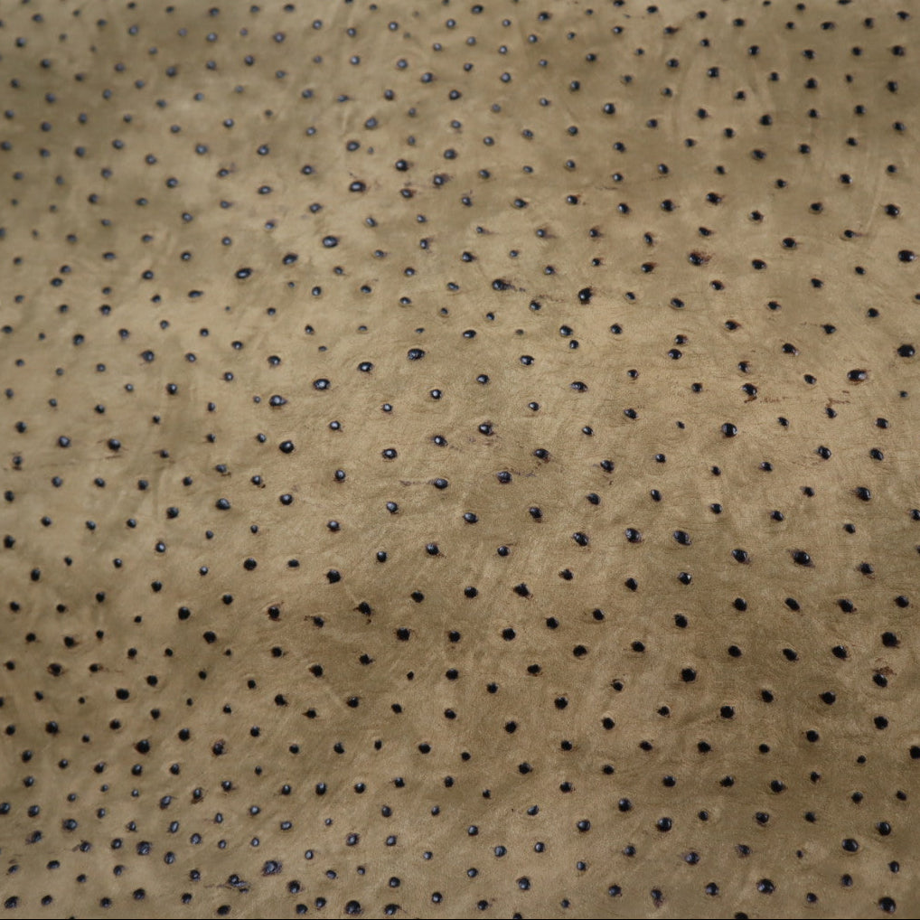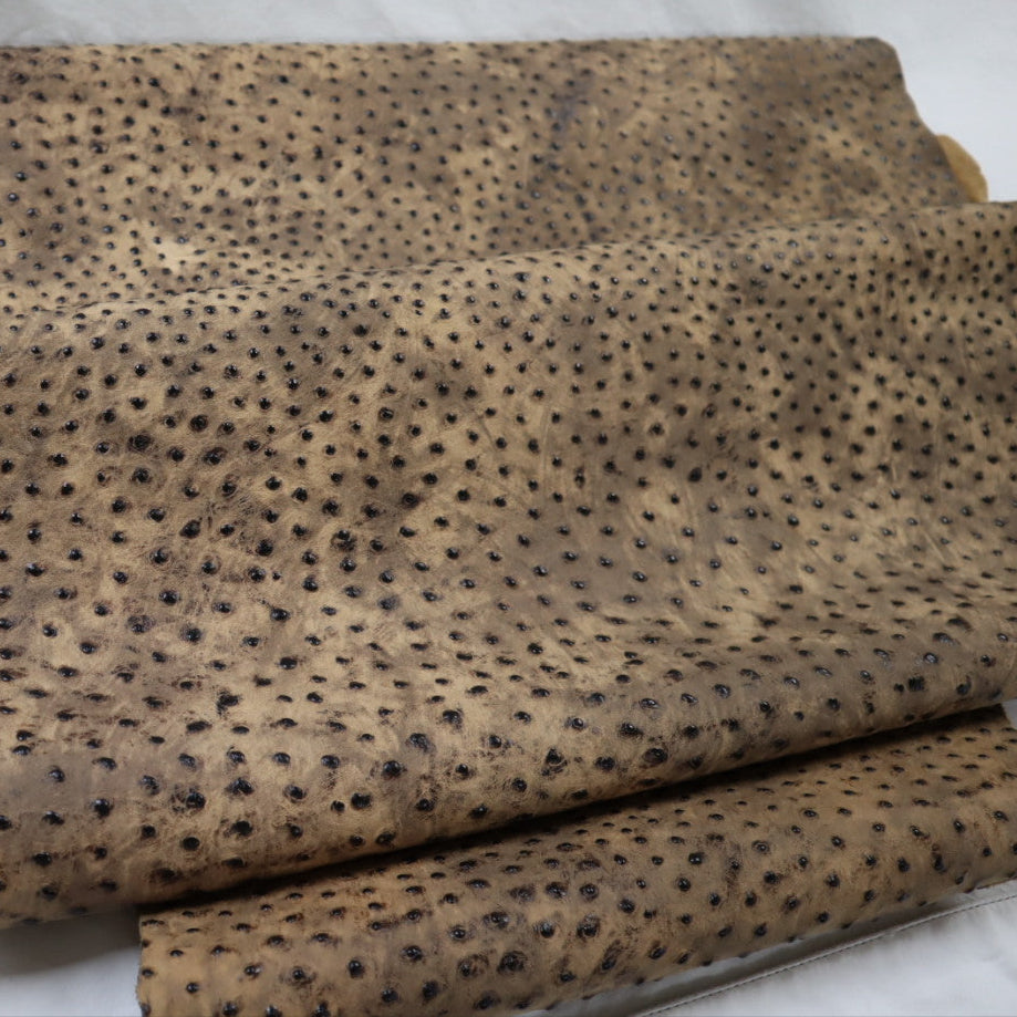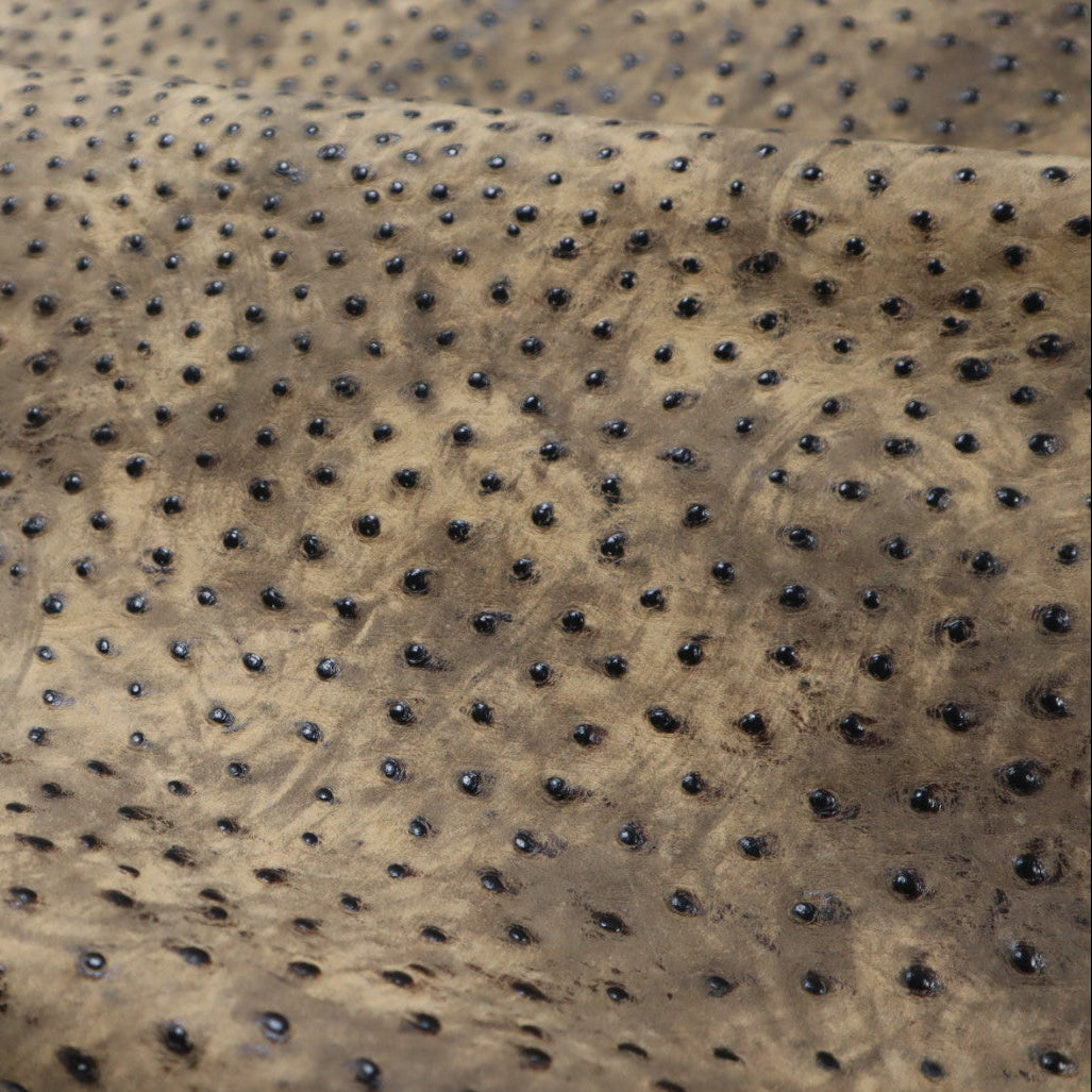 Safari Ostrich- Embossed top grain cowhide in uniform ostrich pattern. Hand rubbed aniline top finish, washed and shrunken at final for soft temper. Colors will vary skin to skin due to washing process and aniline dye process by hand.