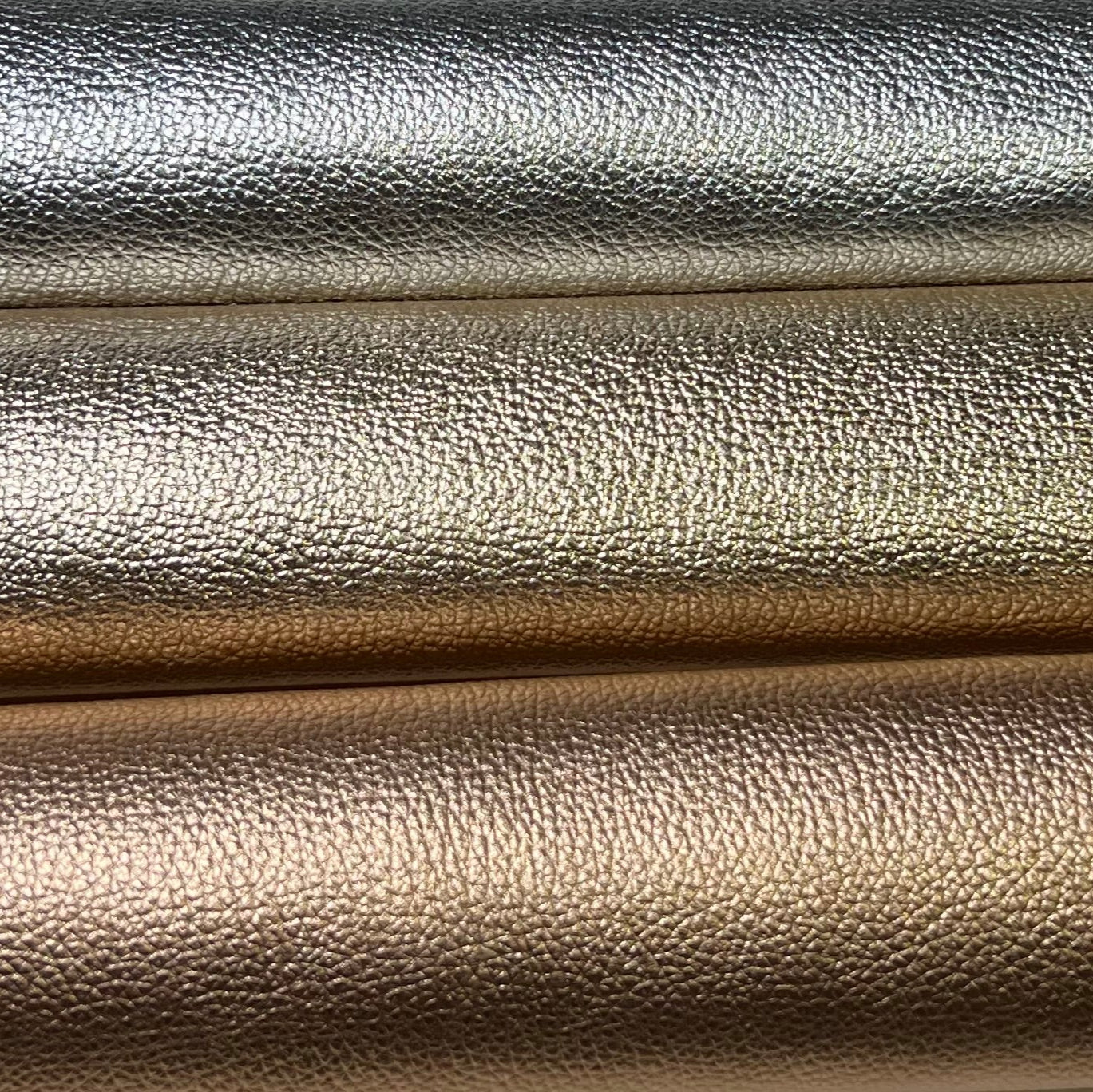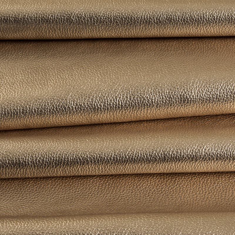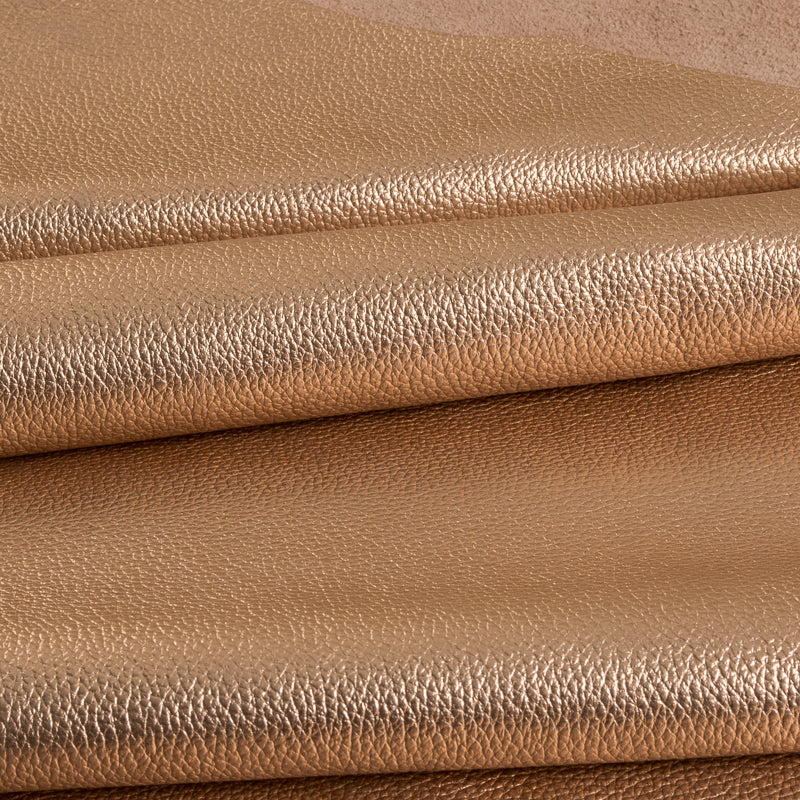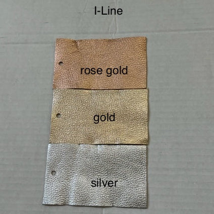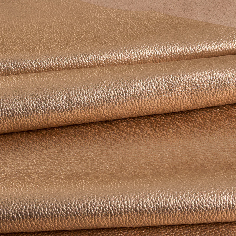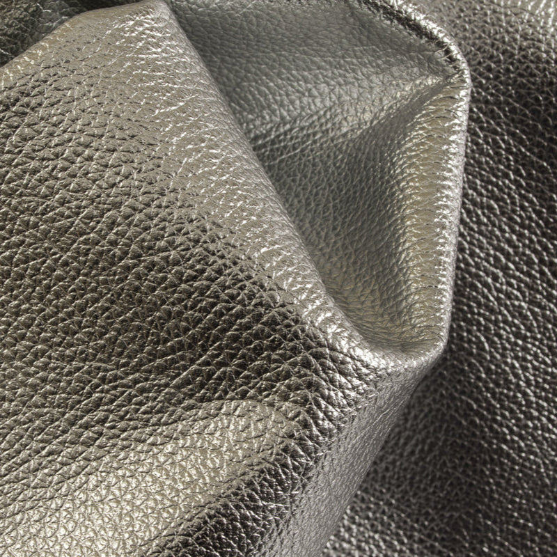 I-Line- Embossed top grain cowhide made with metallic foil top finish, aniline drum dyed through crust, milled for a floater pebble effect. Soft temper and smooth hand feel.