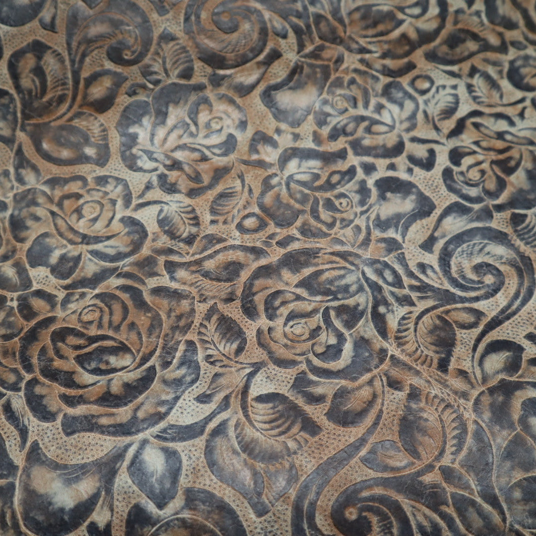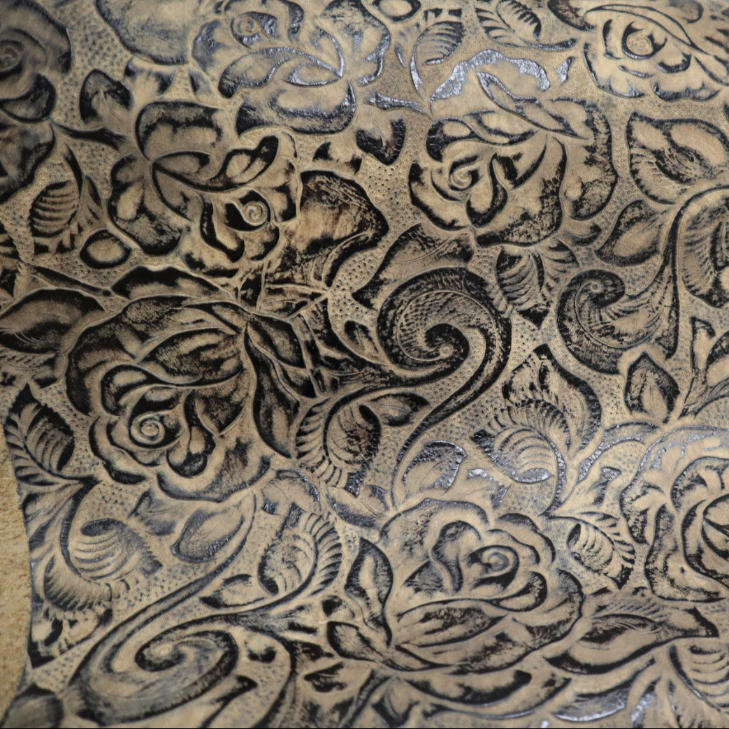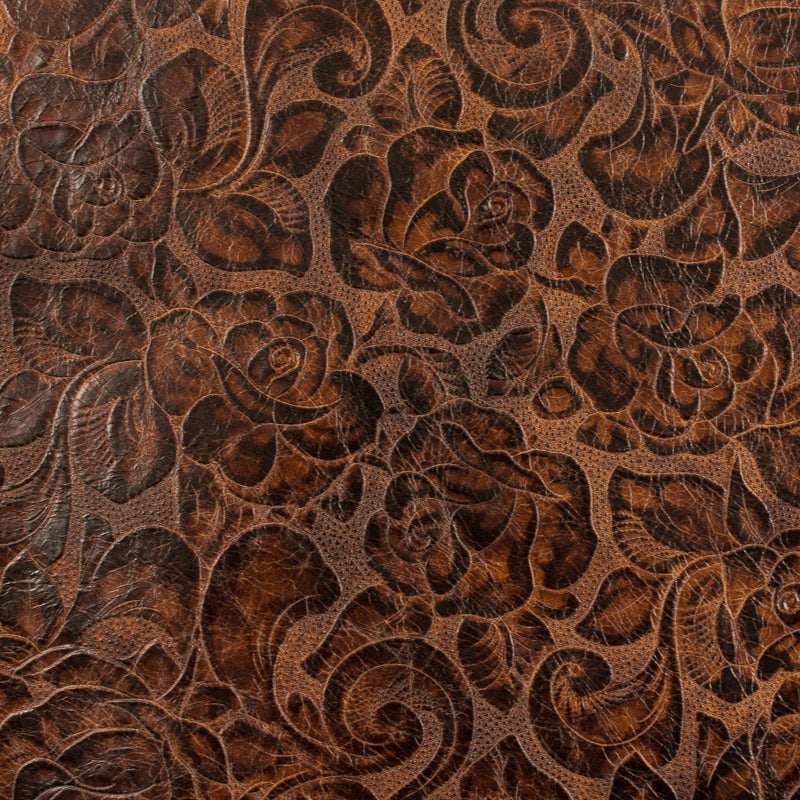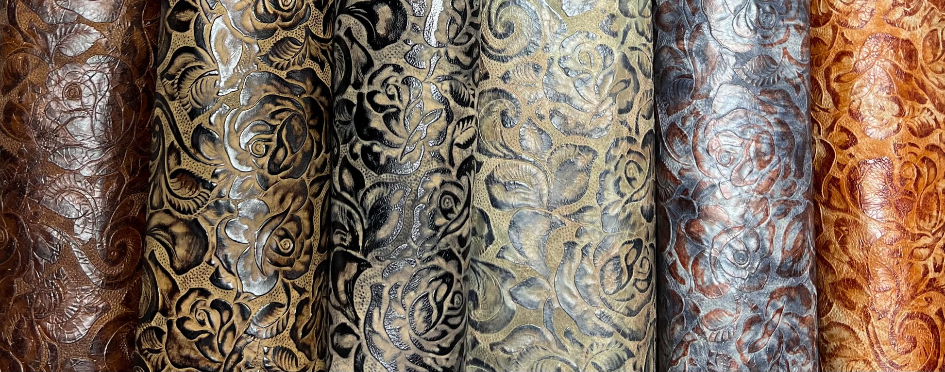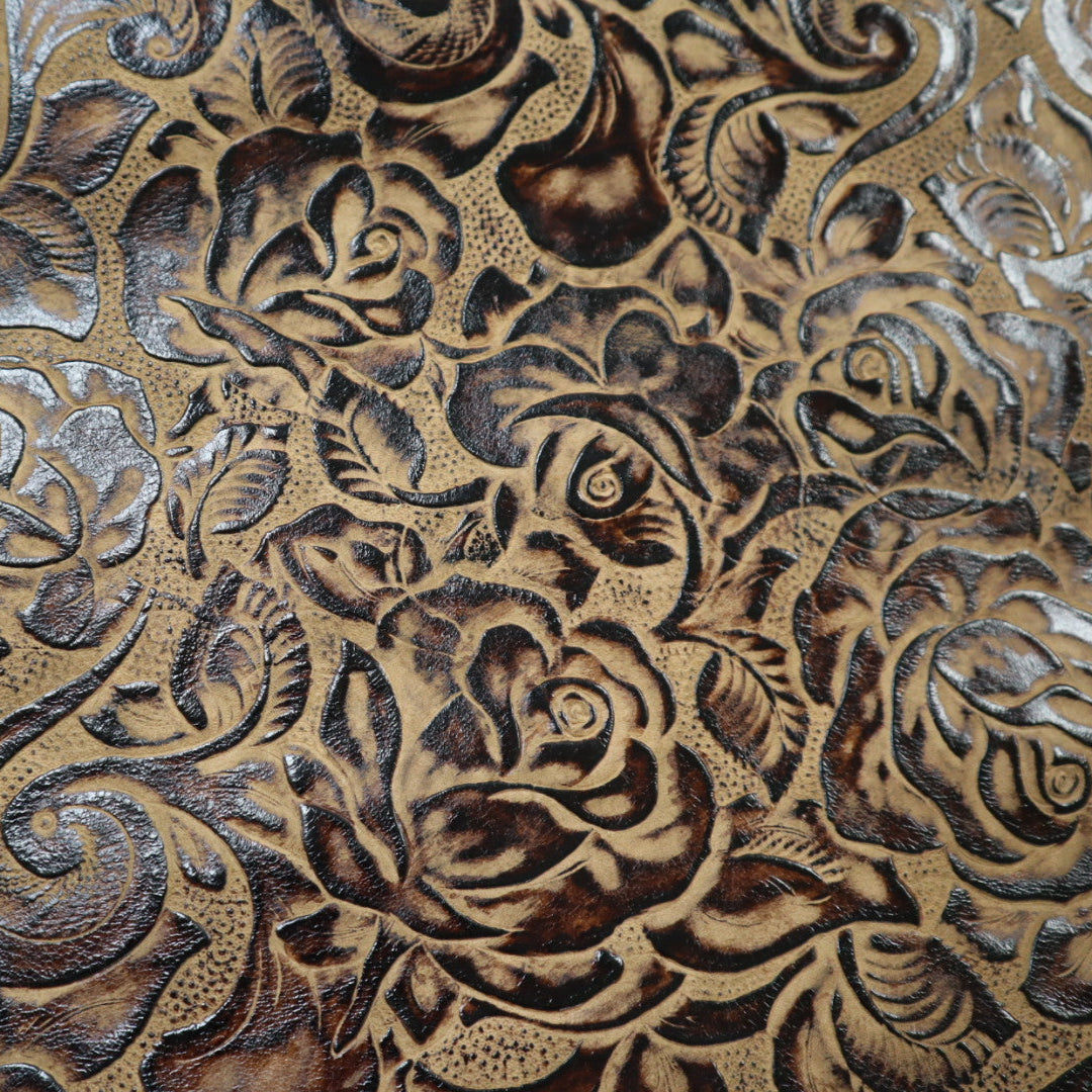 Jessie James- Embossed top grain cowhide in uniform large rose petal design. Hand applied aniline dyes in multi color combinations. Colors may vary skin to skin due to the hand made anline dye process.