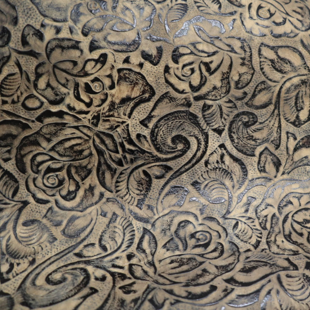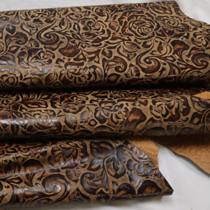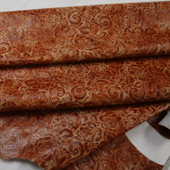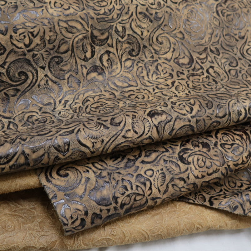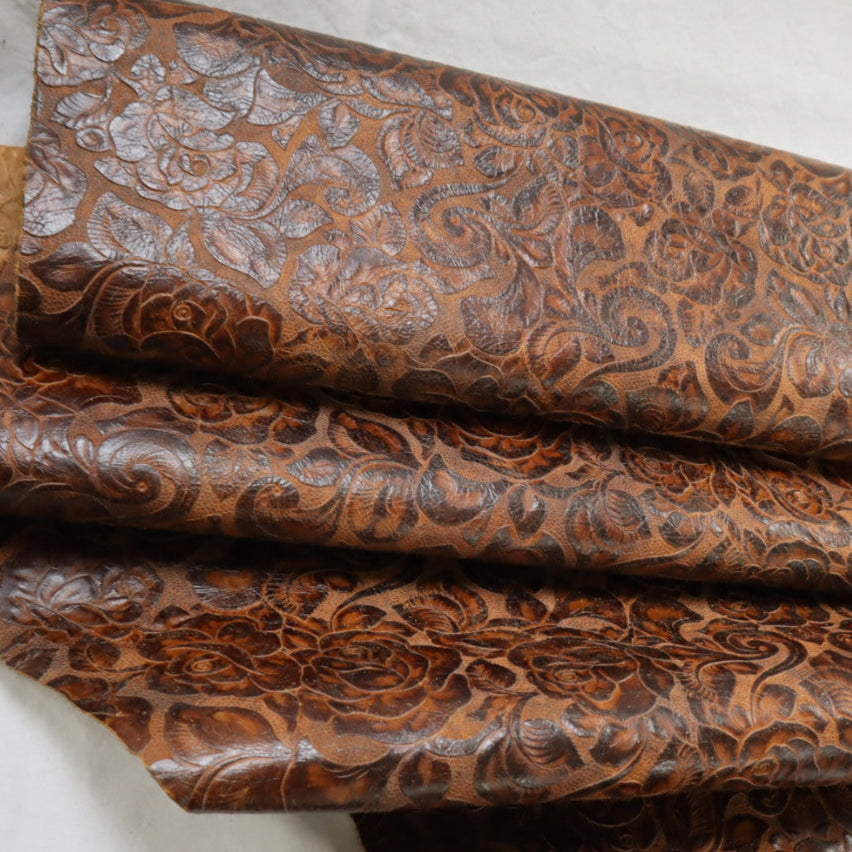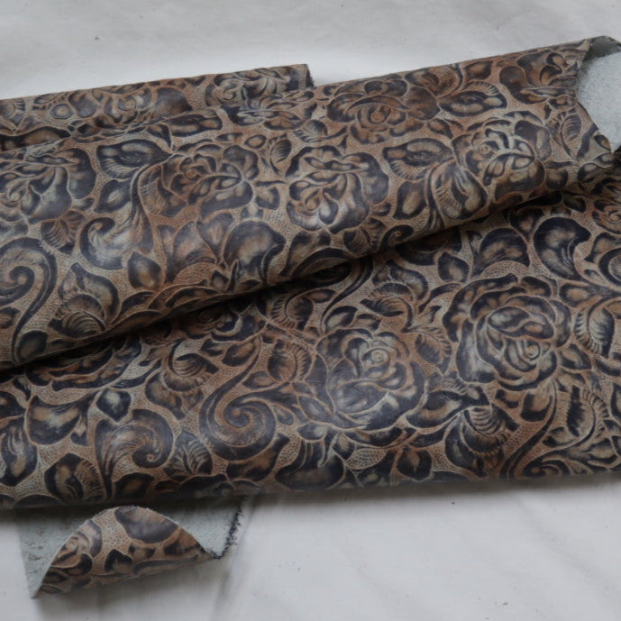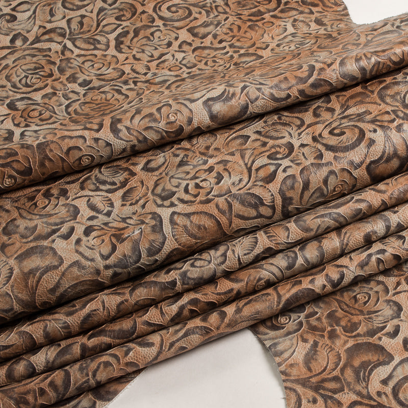 Jessie James- Embossed top grain cowhide in uniform large rose petal design. Hand applied aniline dyes in multi color combinations. Colors may vary skin to skin due to the hand made anline dye process.