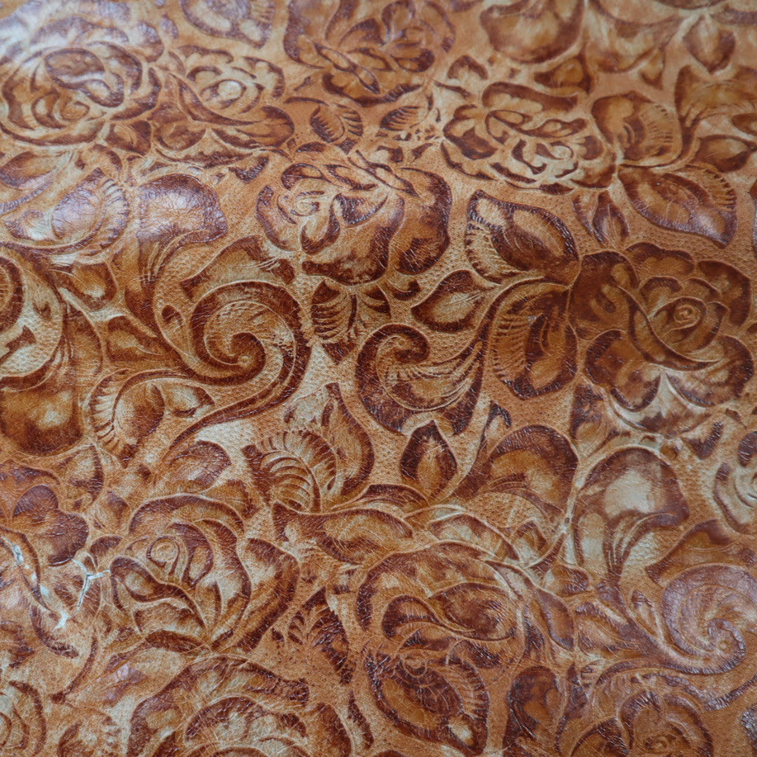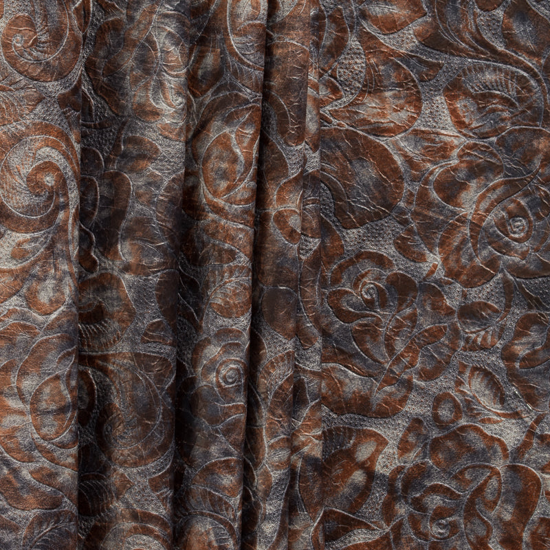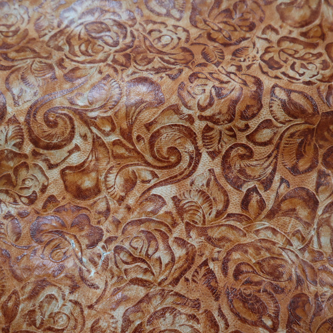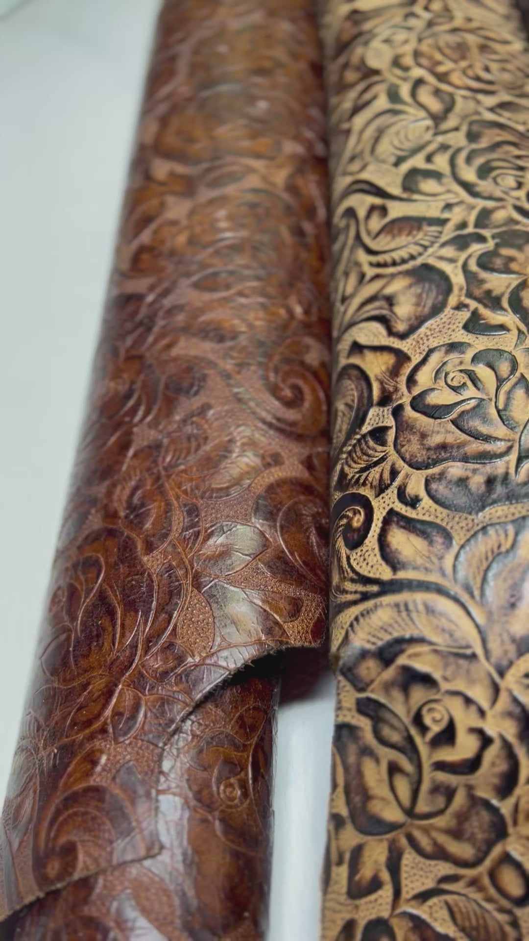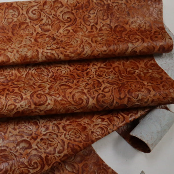 Jessie James- Embossed top grain cowhide in uniform large rose petal design. Hand applied aniline dyes in multi color combinations. Colors may vary skin to skin due to the hand made anline dye process.