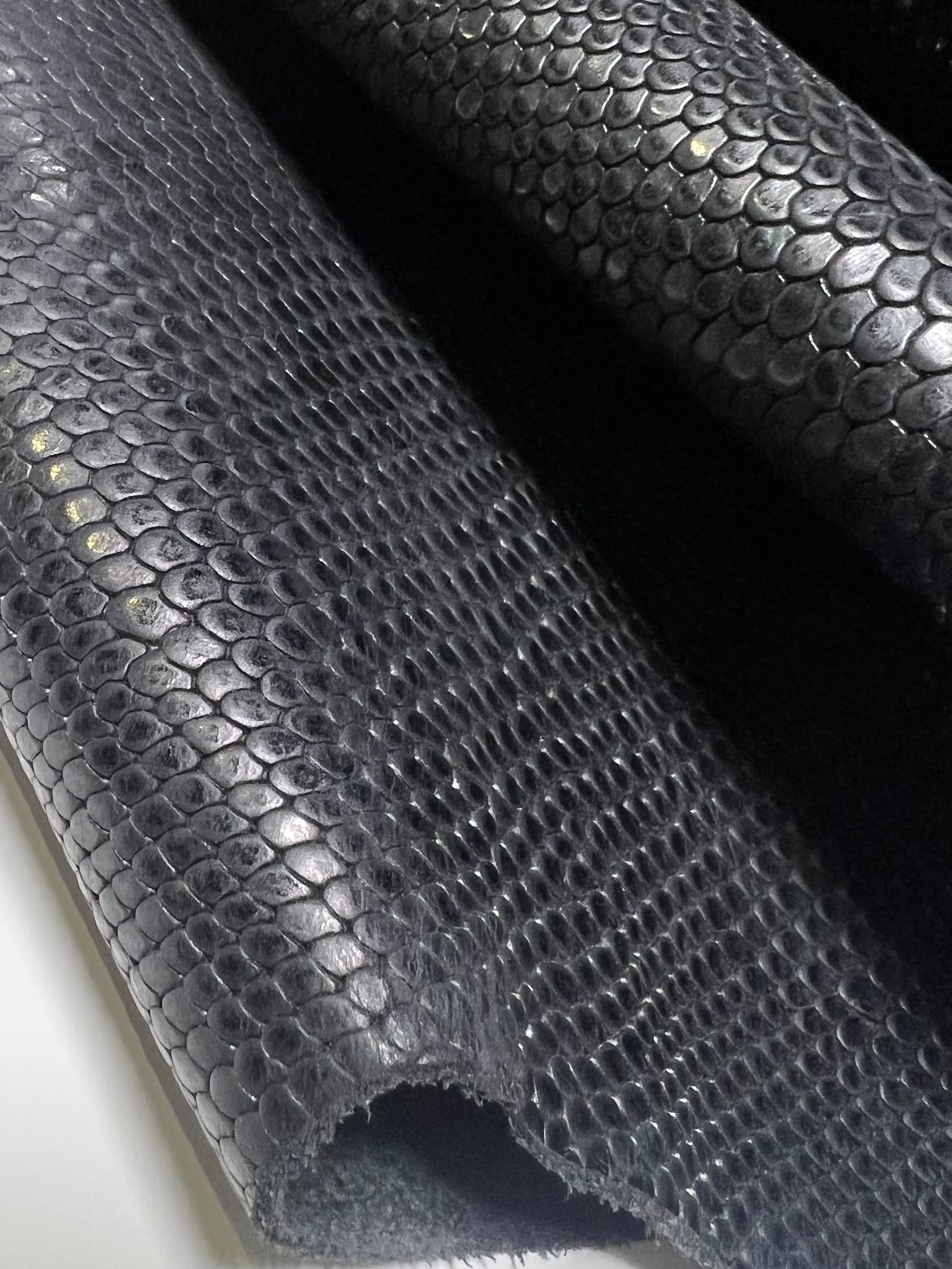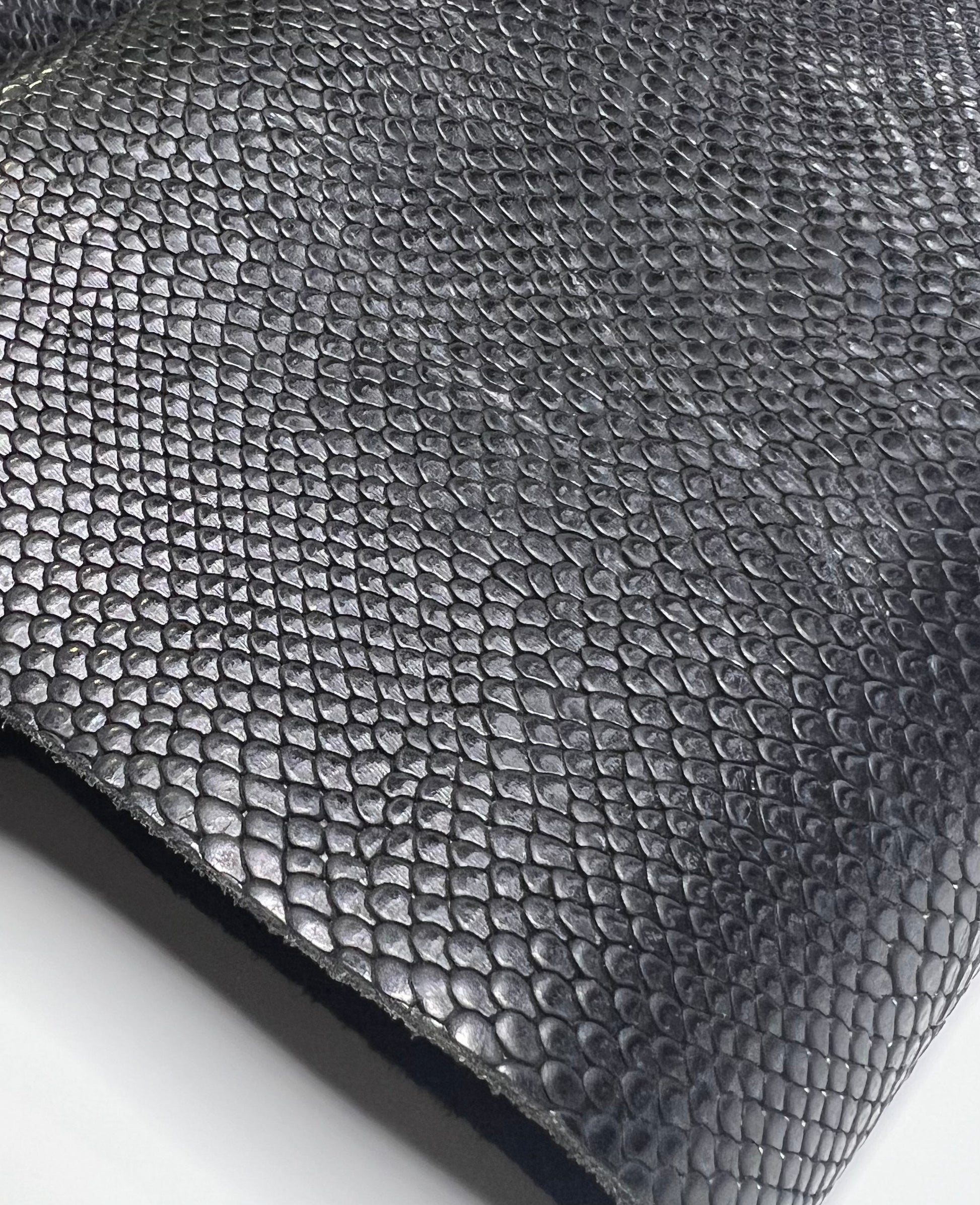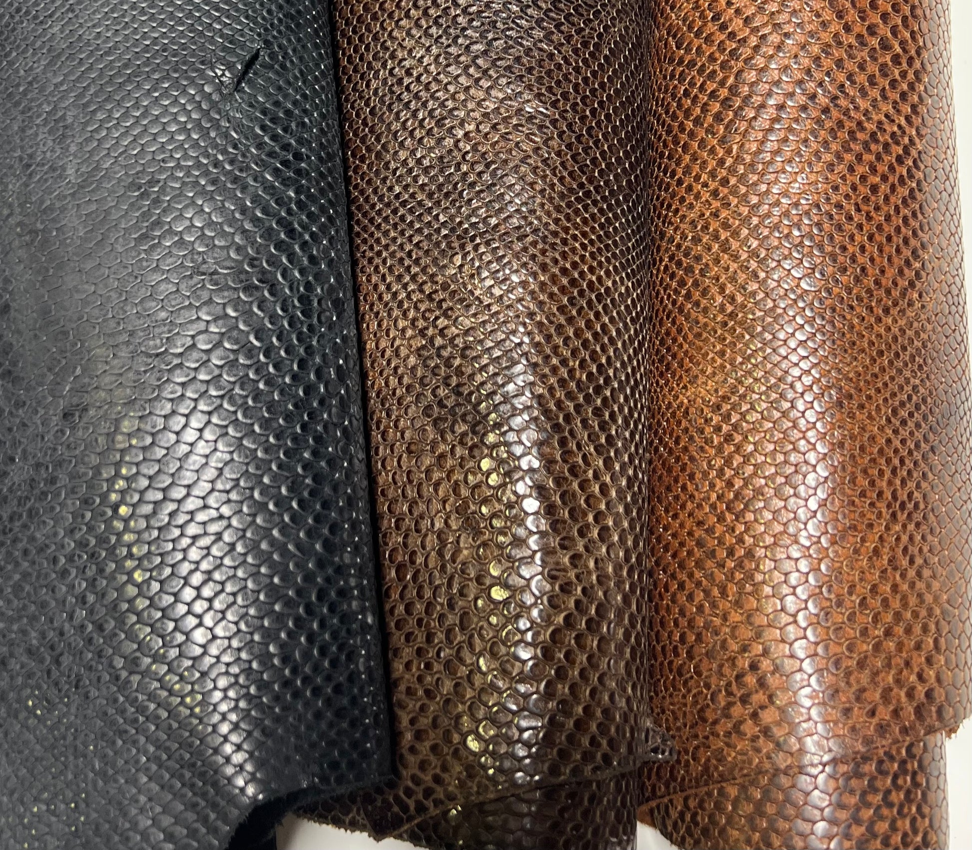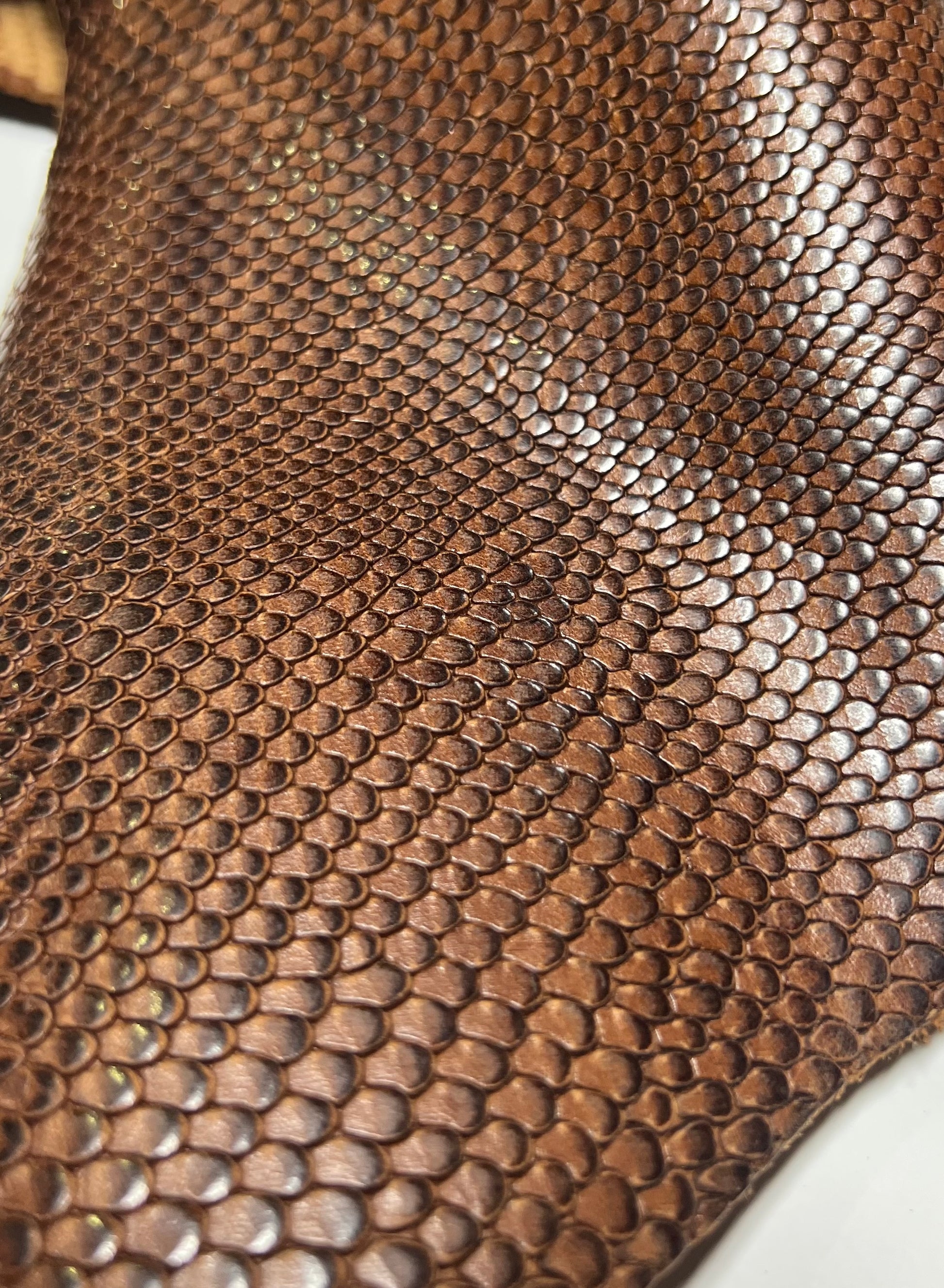 JW Scale- Embossed top grain cowhide in uniform fish scale print, aniline drum dyed base crust, top applied natural shinny wax, hand applied aniline dye top finish, soft temper. Colors will vary from lot to lot due to aniline dye system.
