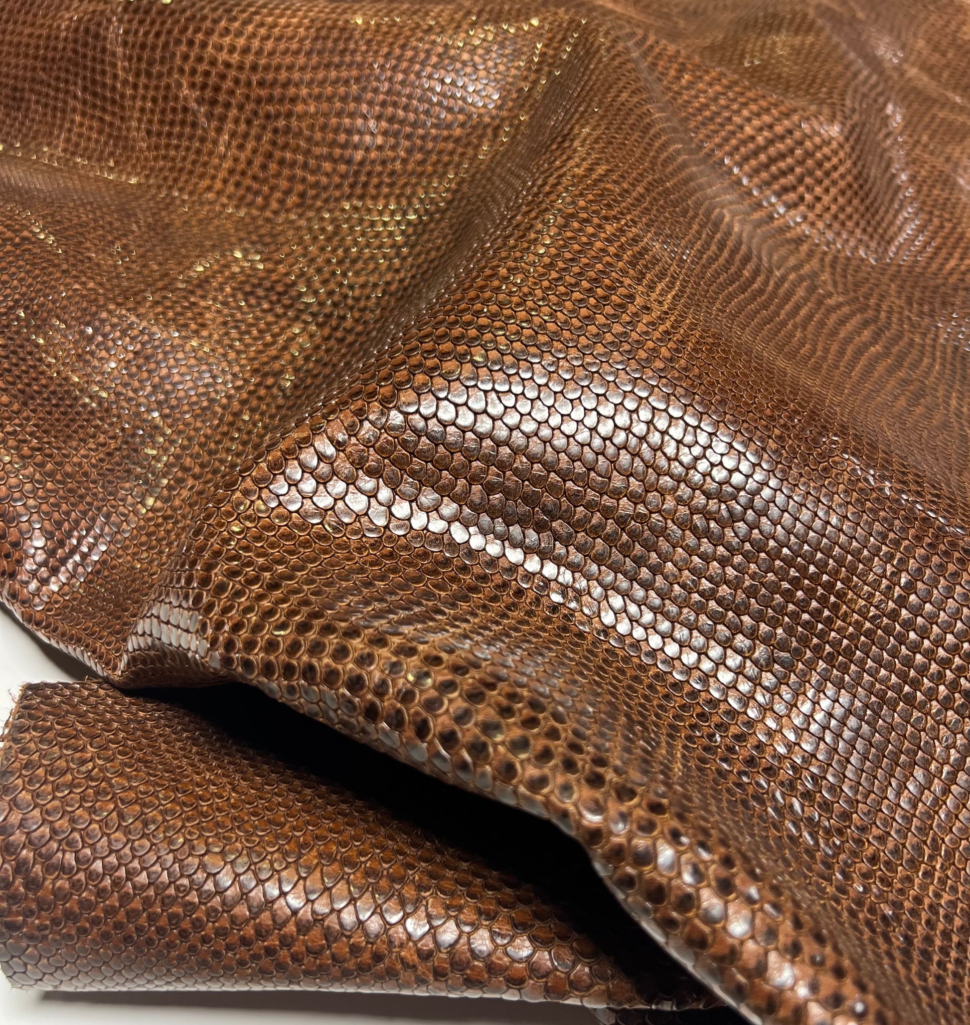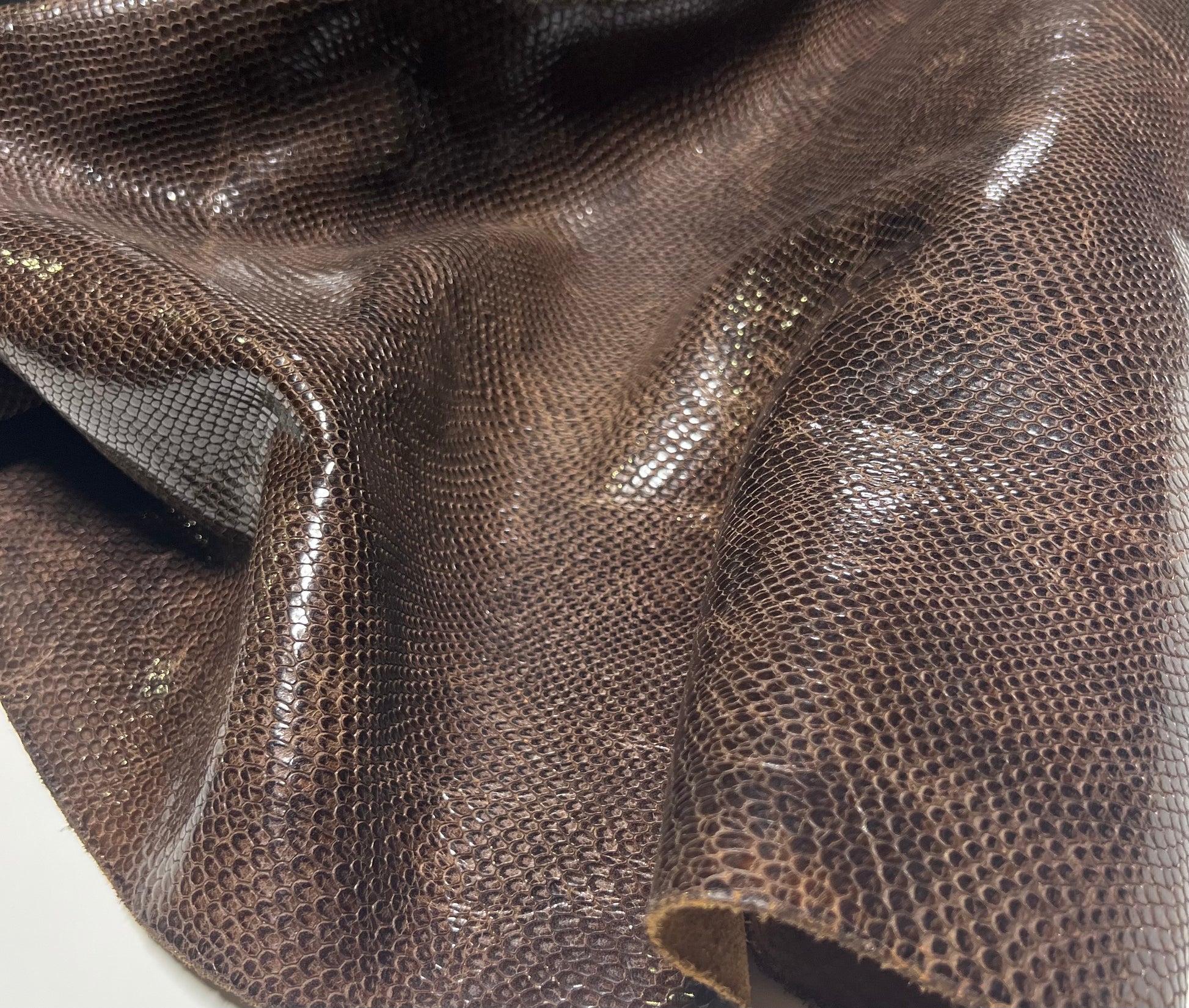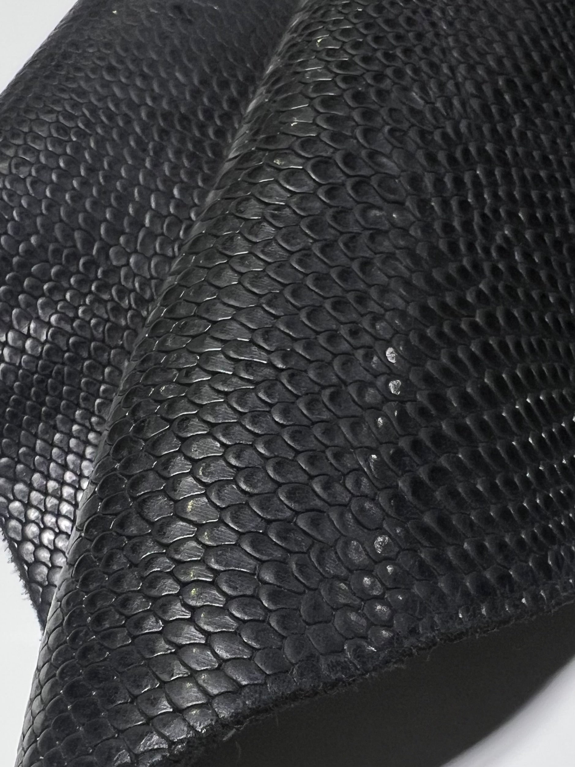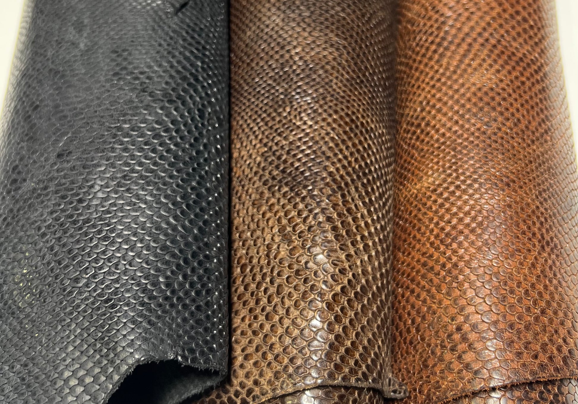 JW Scale- Embossed top grain cowhide in uniform fish scale print, aniline drum dyed base crust, top applied natural shinny wax, hand applied aniline dye top finish, soft temper. Colors will vary from lot to lot due to aniline dye system.