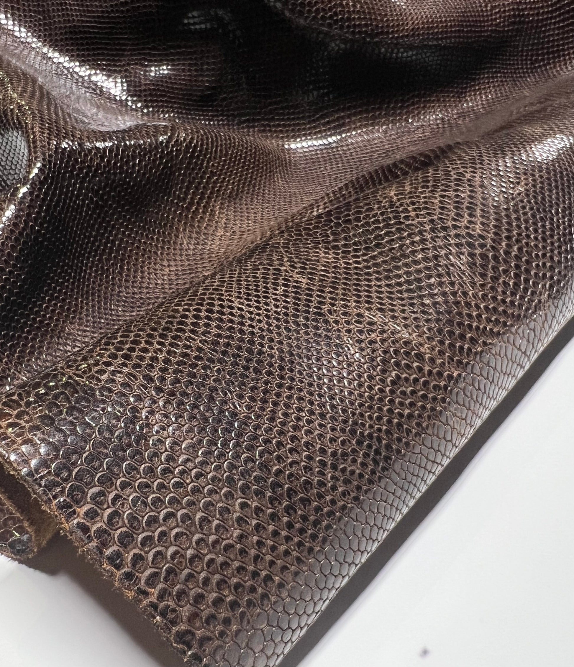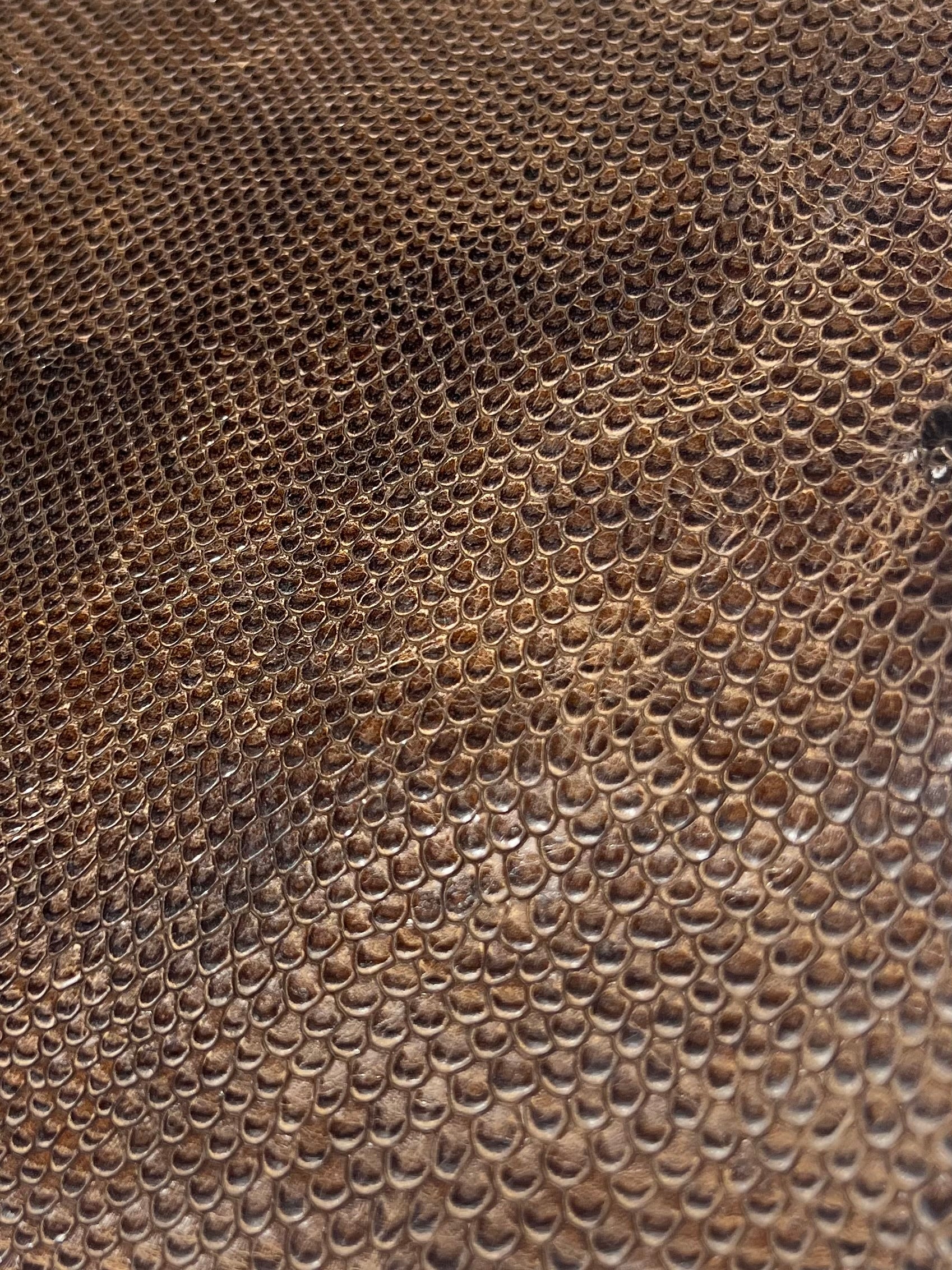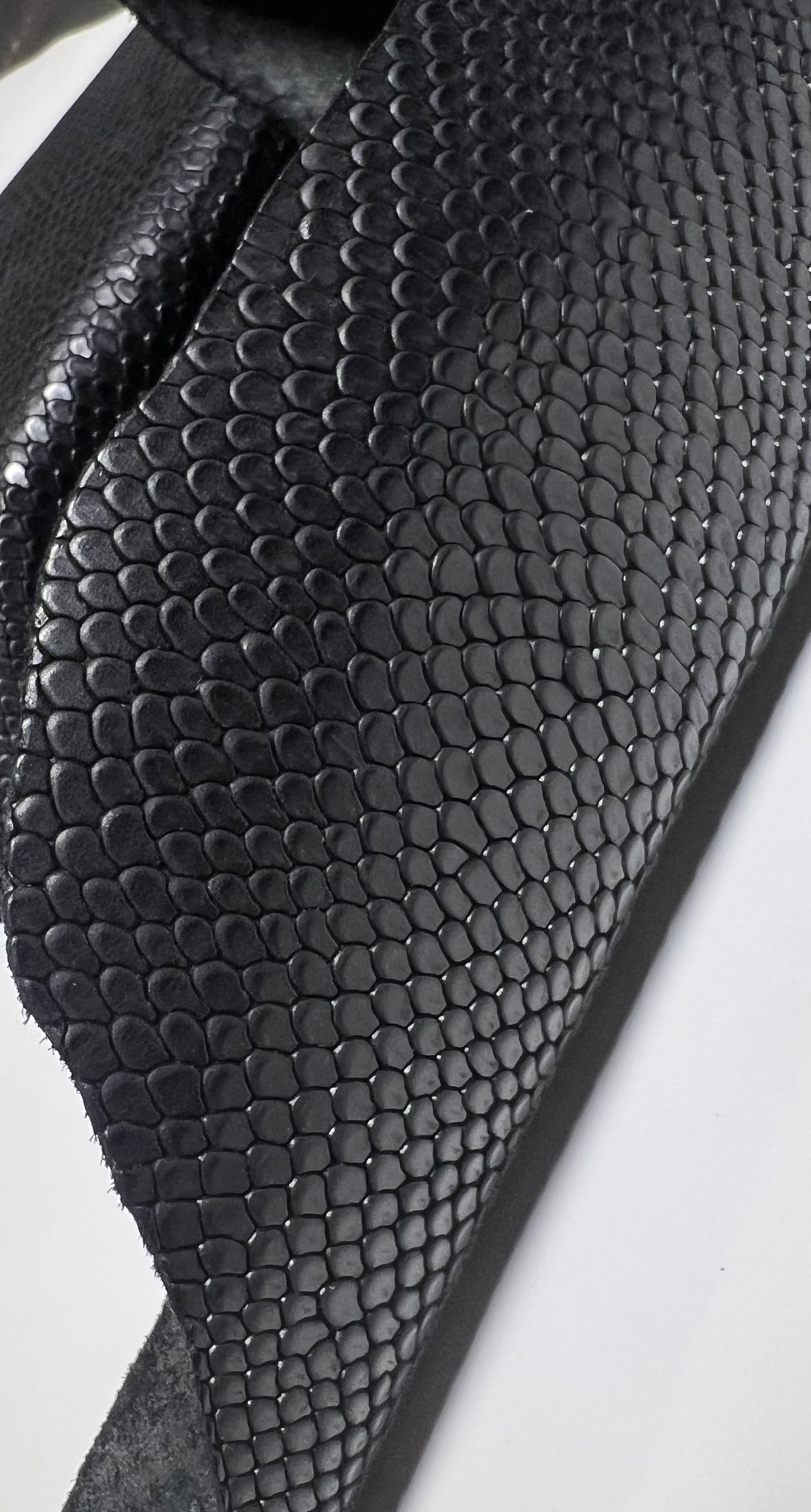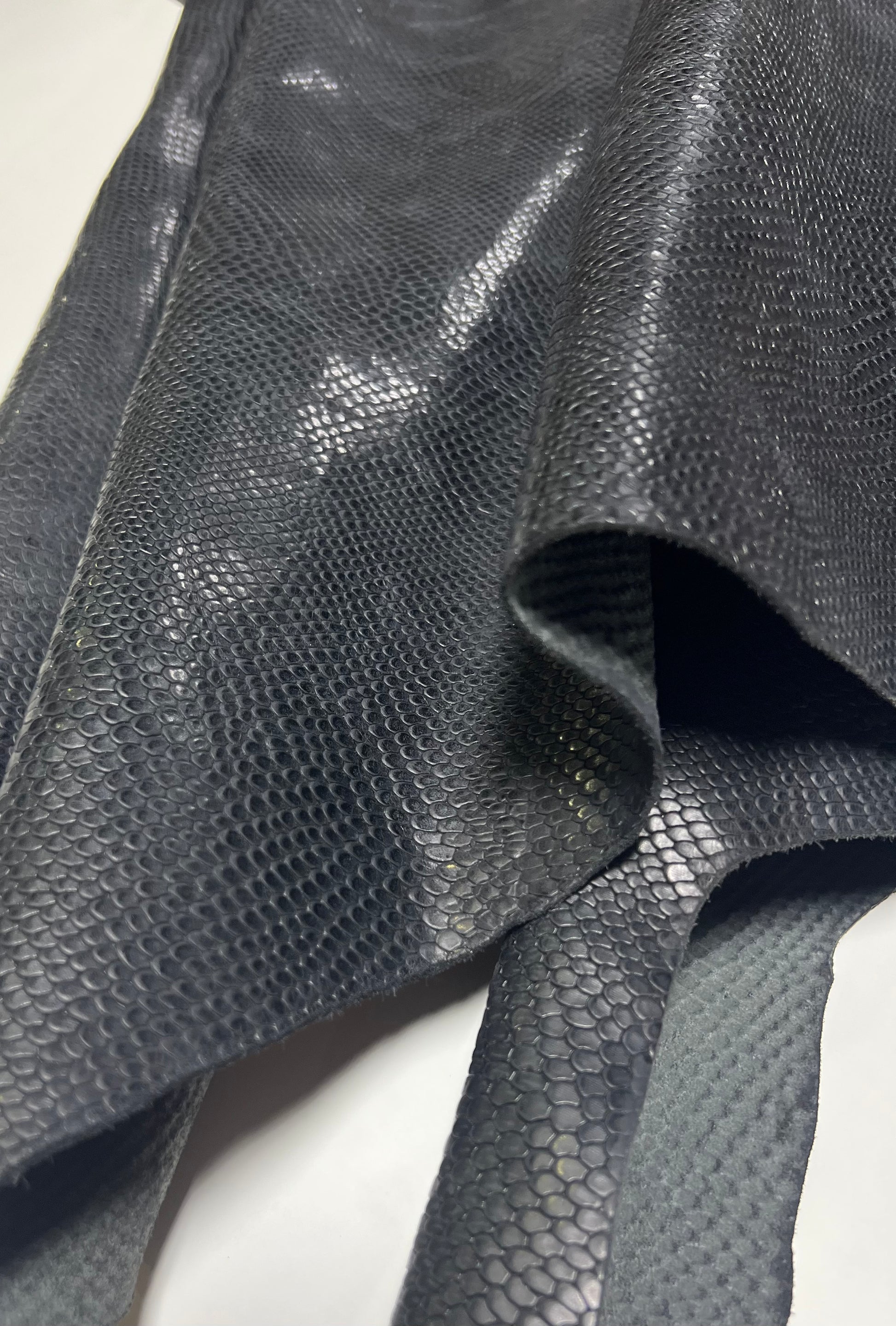 JW Scale- Embossed top grain cowhide in uniform fish scale print, aniline drum dyed base crust, top applied natural shinny wax, hand applied aniline dye top finish, soft temper. Colors will vary from lot to lot due to aniline dye system.