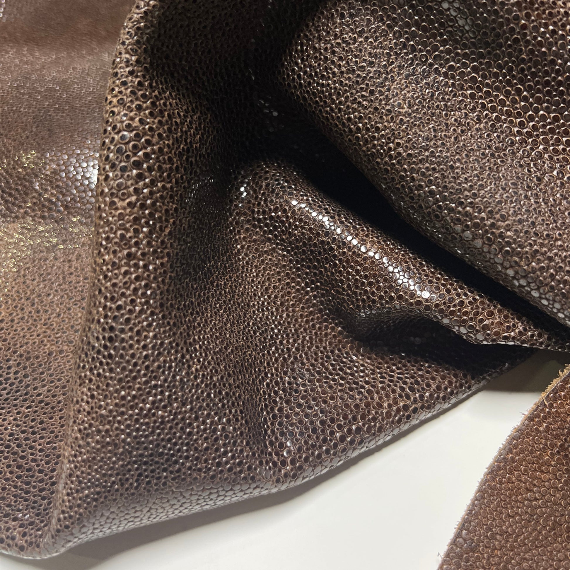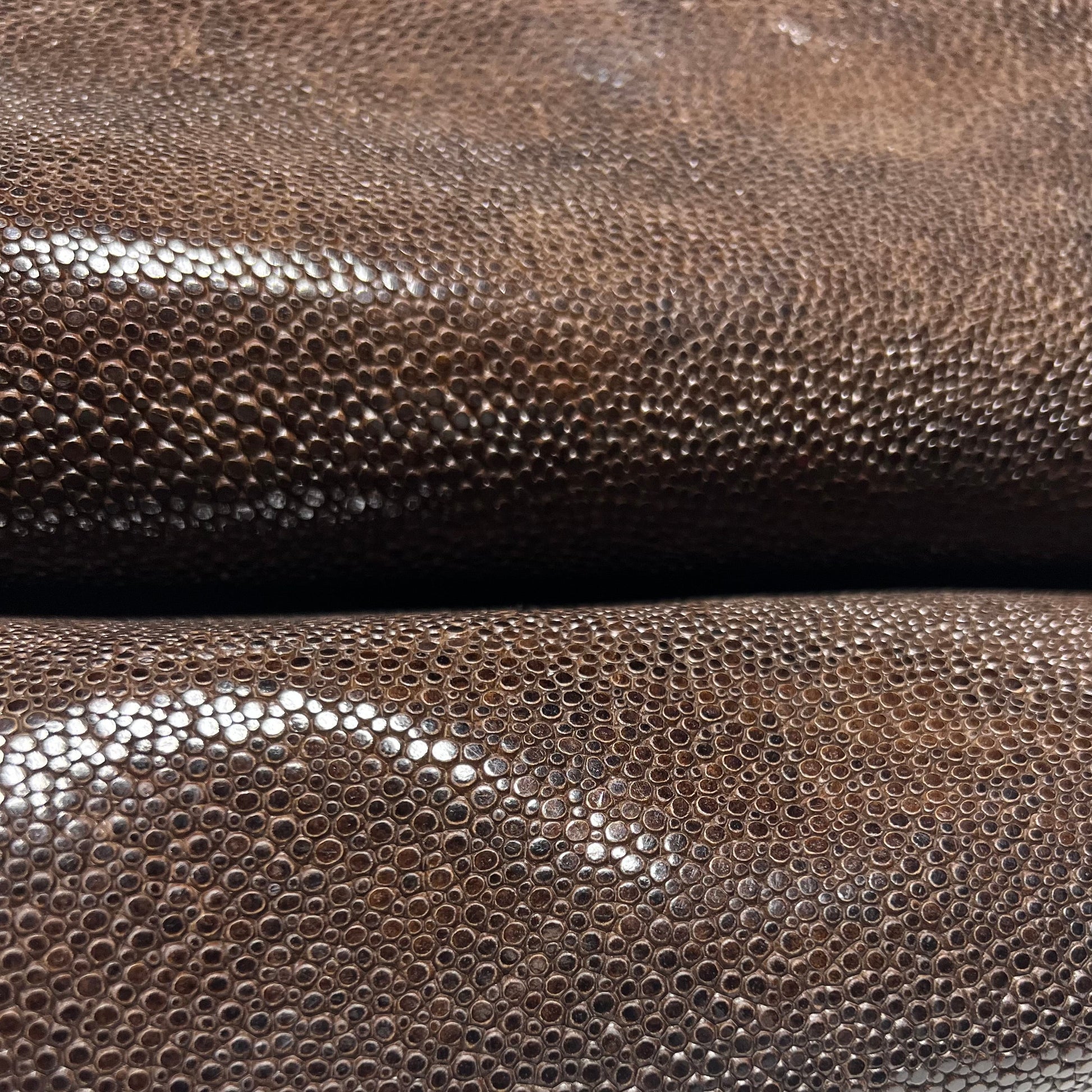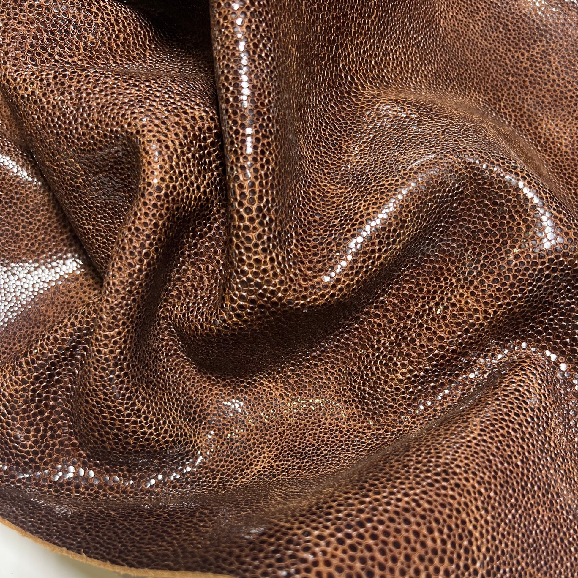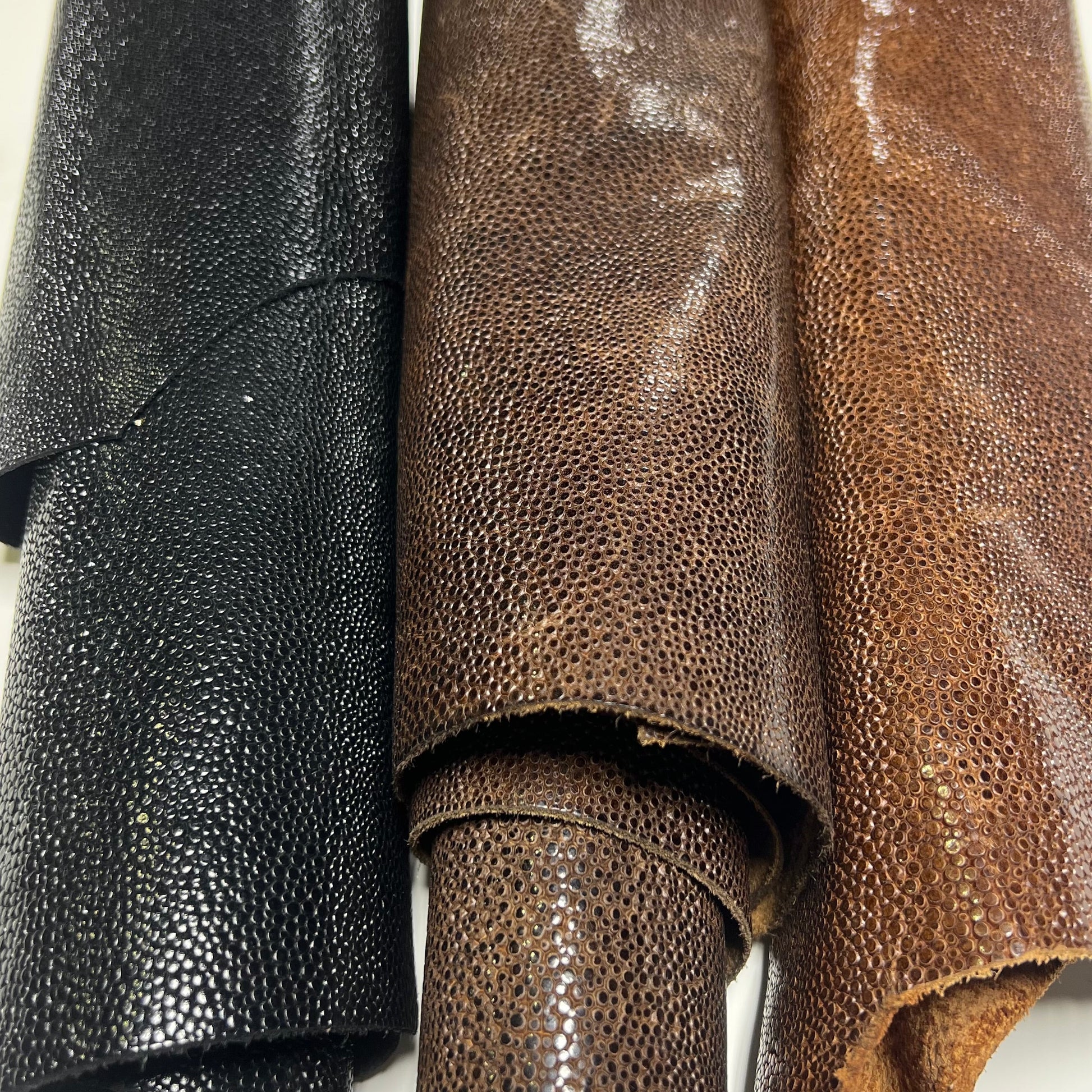 JW Stingray- Embossed top grain cowhide in uniform print, aniline drum dyed base crust, top applied natural shinny wax, hand applied aniline dye top finish, soft temper. Colors will vary from lot to lot due to aniline dye system.