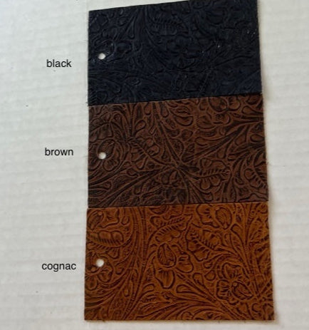 Jw Western Tool- Embossed top grain cowhide in uniform western tooled print, aniline drum dyed base crust, top applied natural shinny wax, hand applied aniline dye top finish, soft temper. Colors will vary from lot to lot due to aniline dye system.