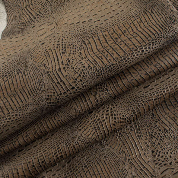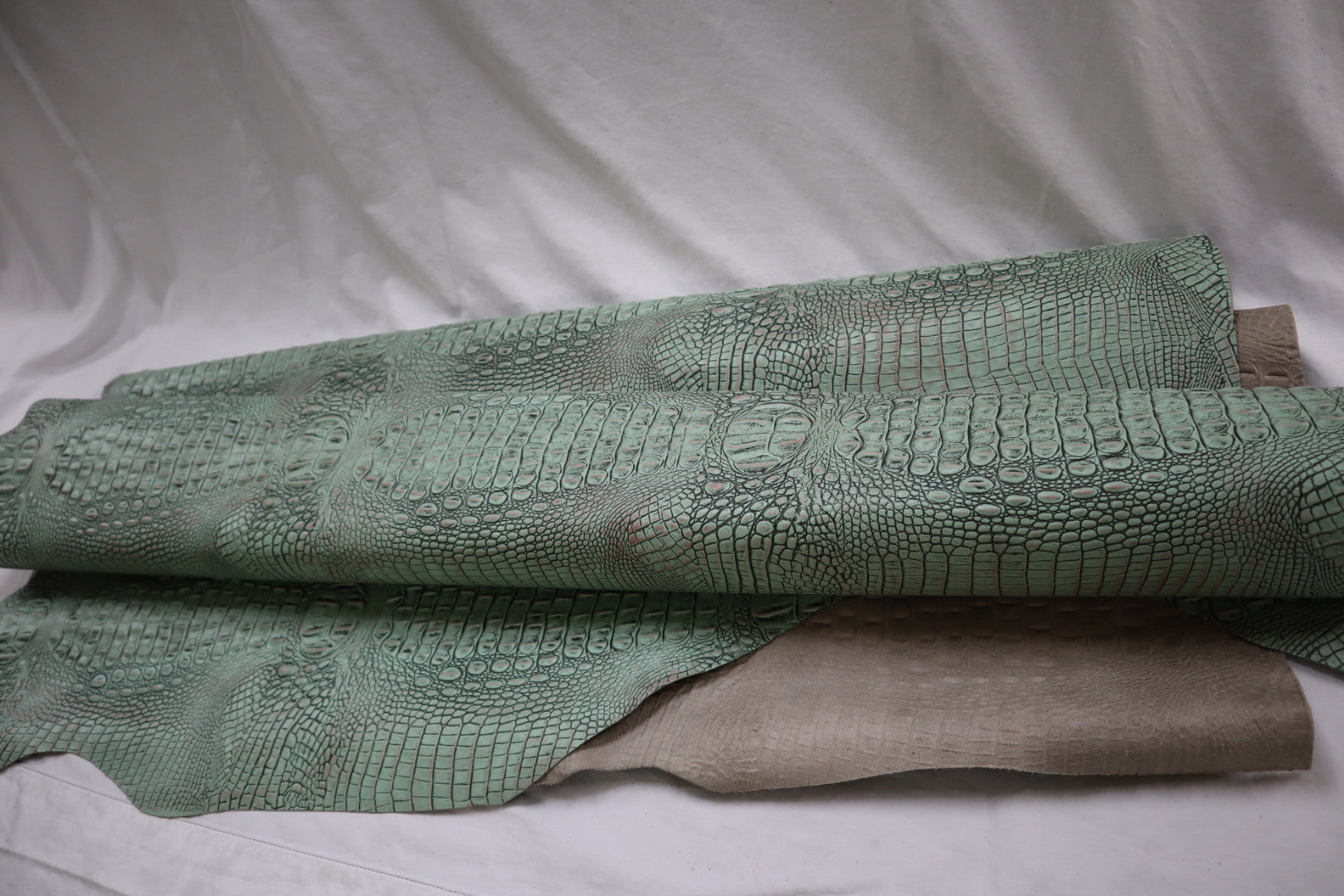 King Croco Whole Hides- Embossed top grain cowhide in repeating horn back croco print, hand rubbed aniline dyes top finish, aniline dyed crust, soft temper. Colors will vary from lot to lot due to aniline dye system.