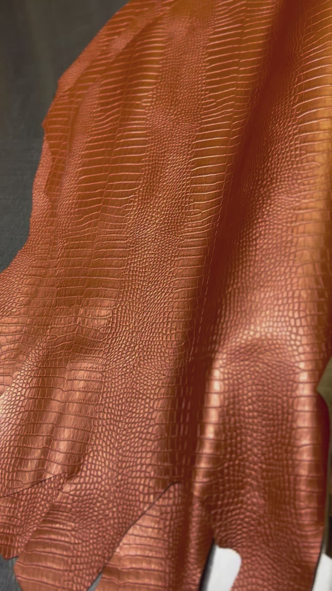 Metallic Mucca Croco- Embossed top grain cowhide in repeating belly print of crocodile. Utilizing a spray finish metallic as opposed to the typical foil to create a stronger adhesion and longevity to our leather.