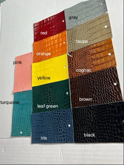 Mini Africana- Top grain embossed in repeating belly crocodile design. Drum dyed through base crust, hand applied aniline dye and antique effect. Hand glazed at final to have high shine. Colors will vary due to the hand made aniline dye process