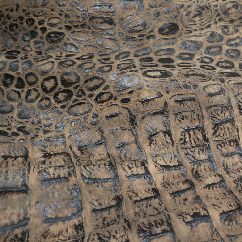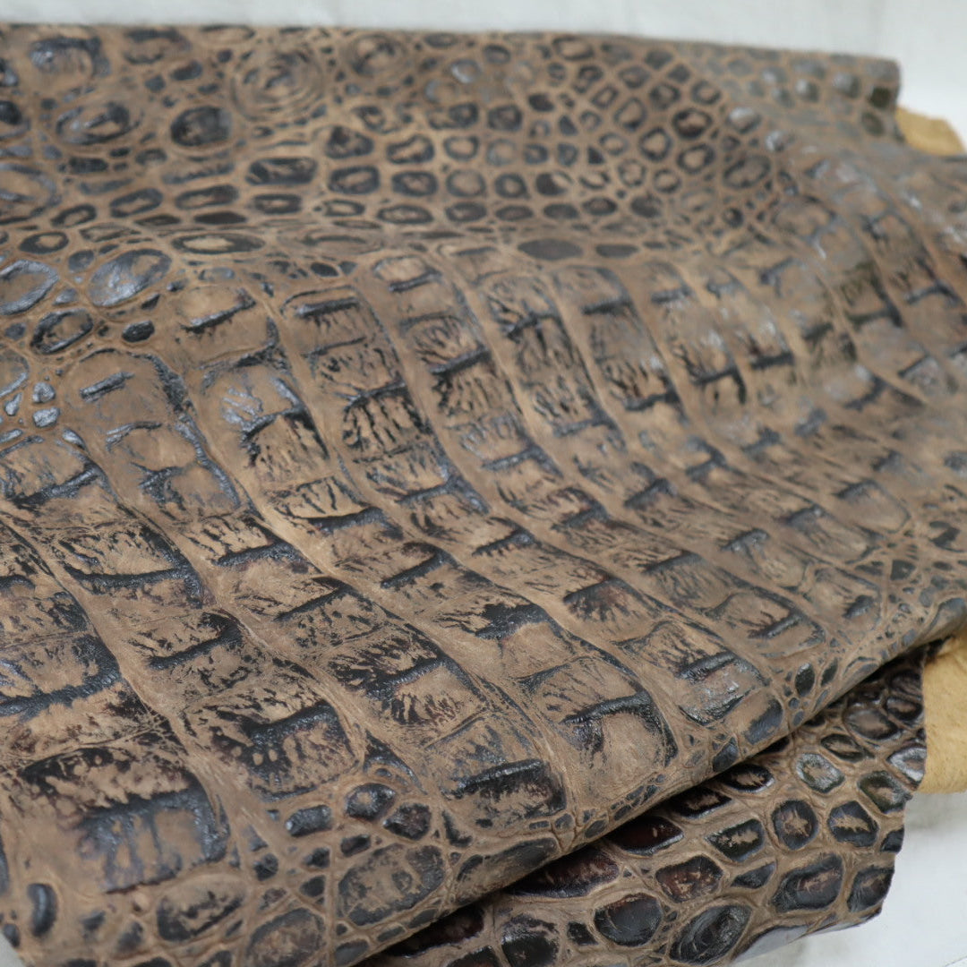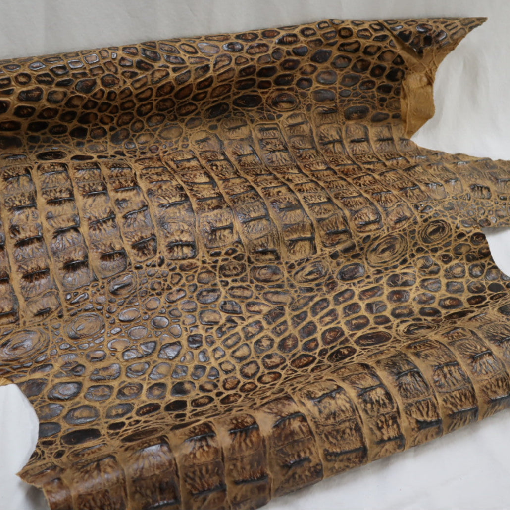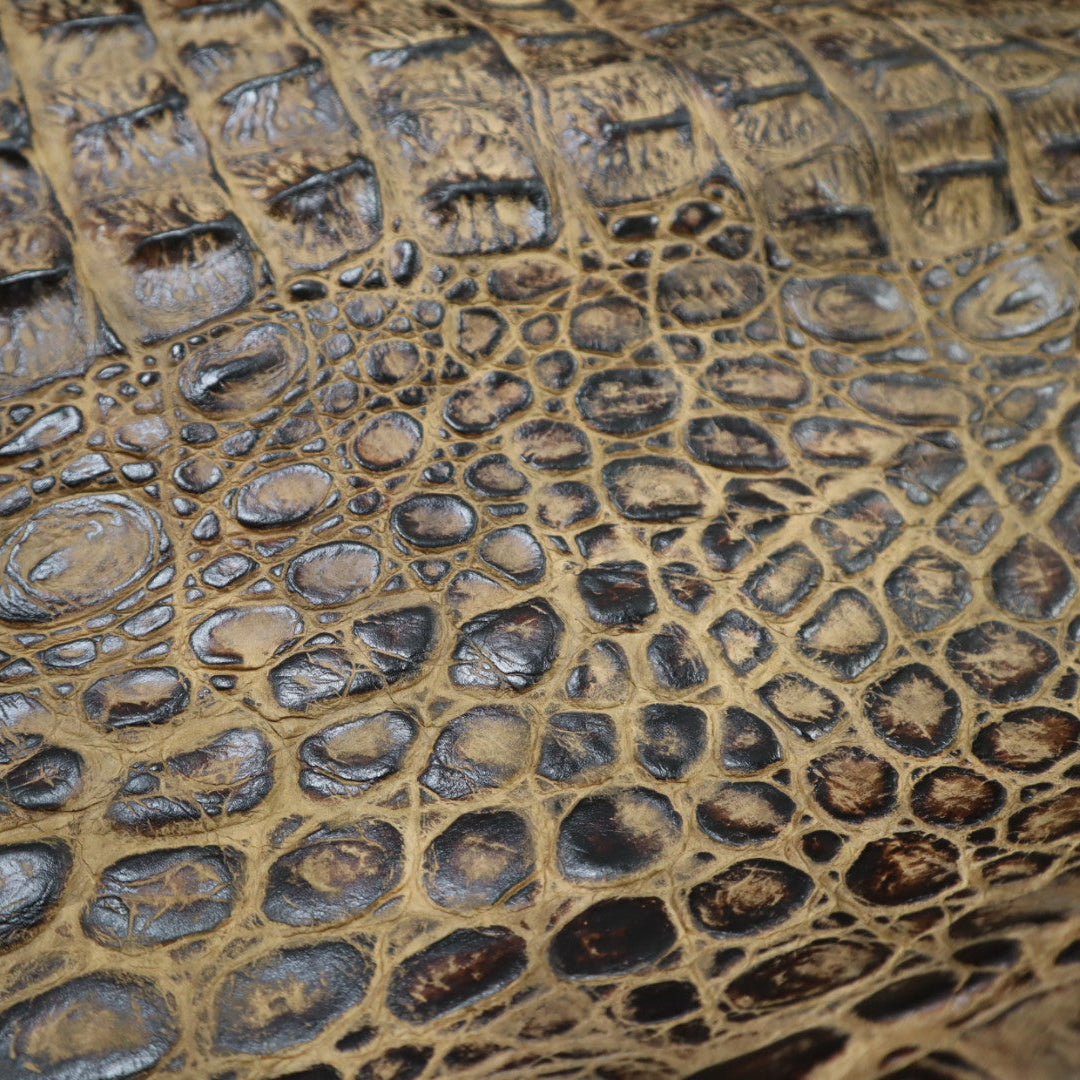 Safari Supergator- Embossed top grain cowhide in repeating large crocodile pattern. Hand rubbed aniline top finish, washed and shrunken at final for soft temper. Colors will vary skin to skin due to washing process and aniline dye process by hand.