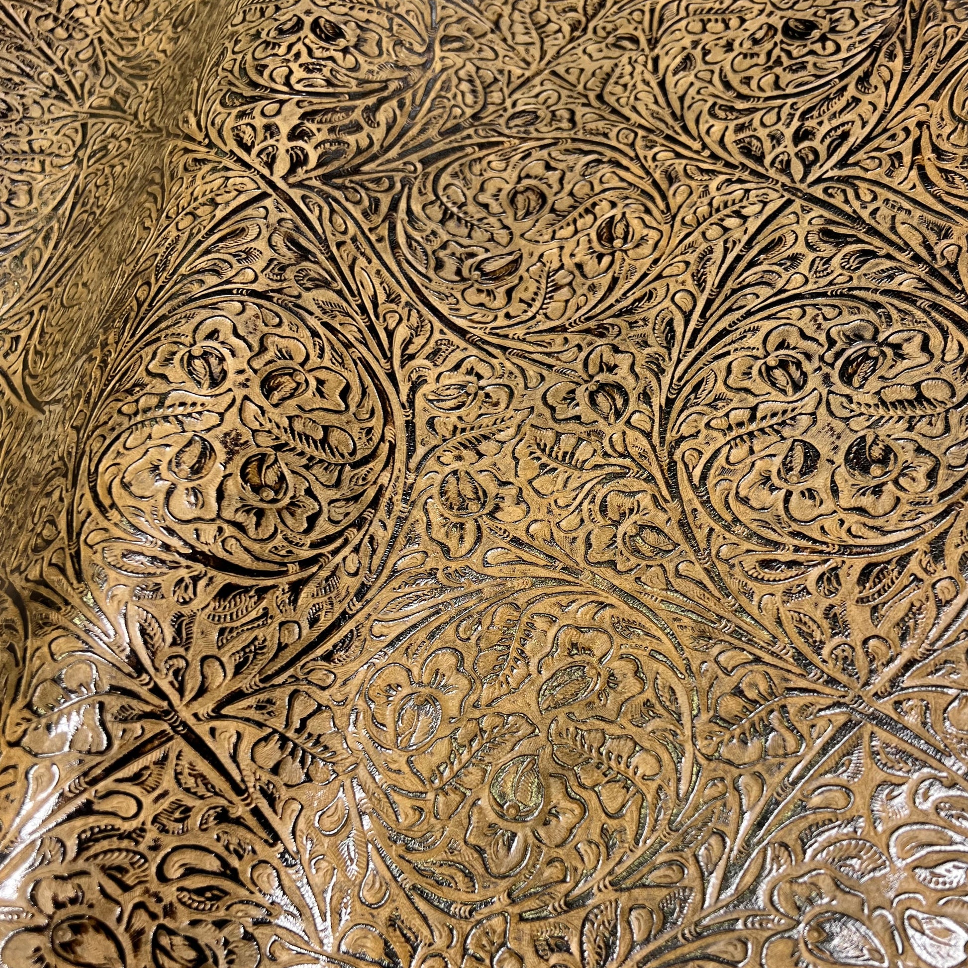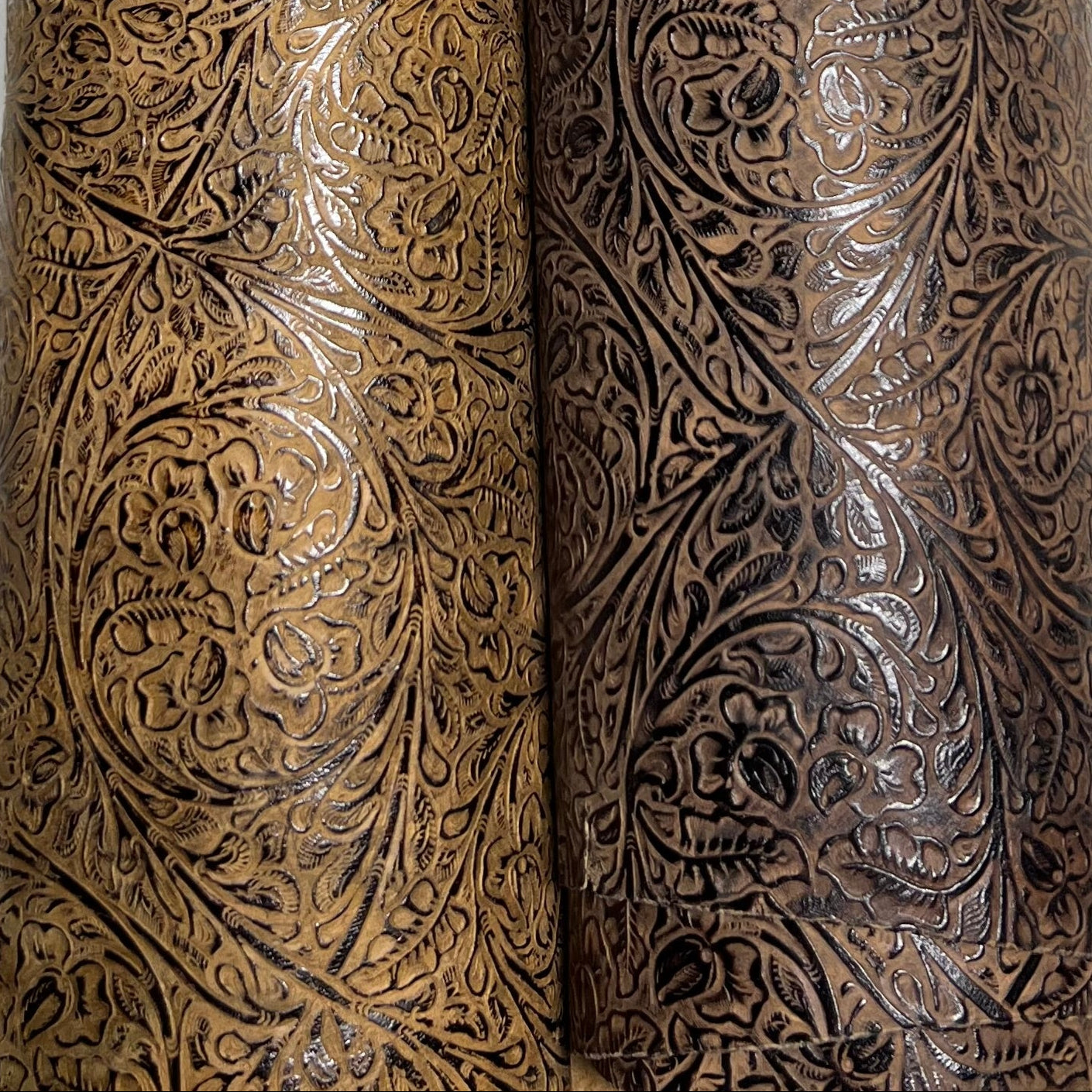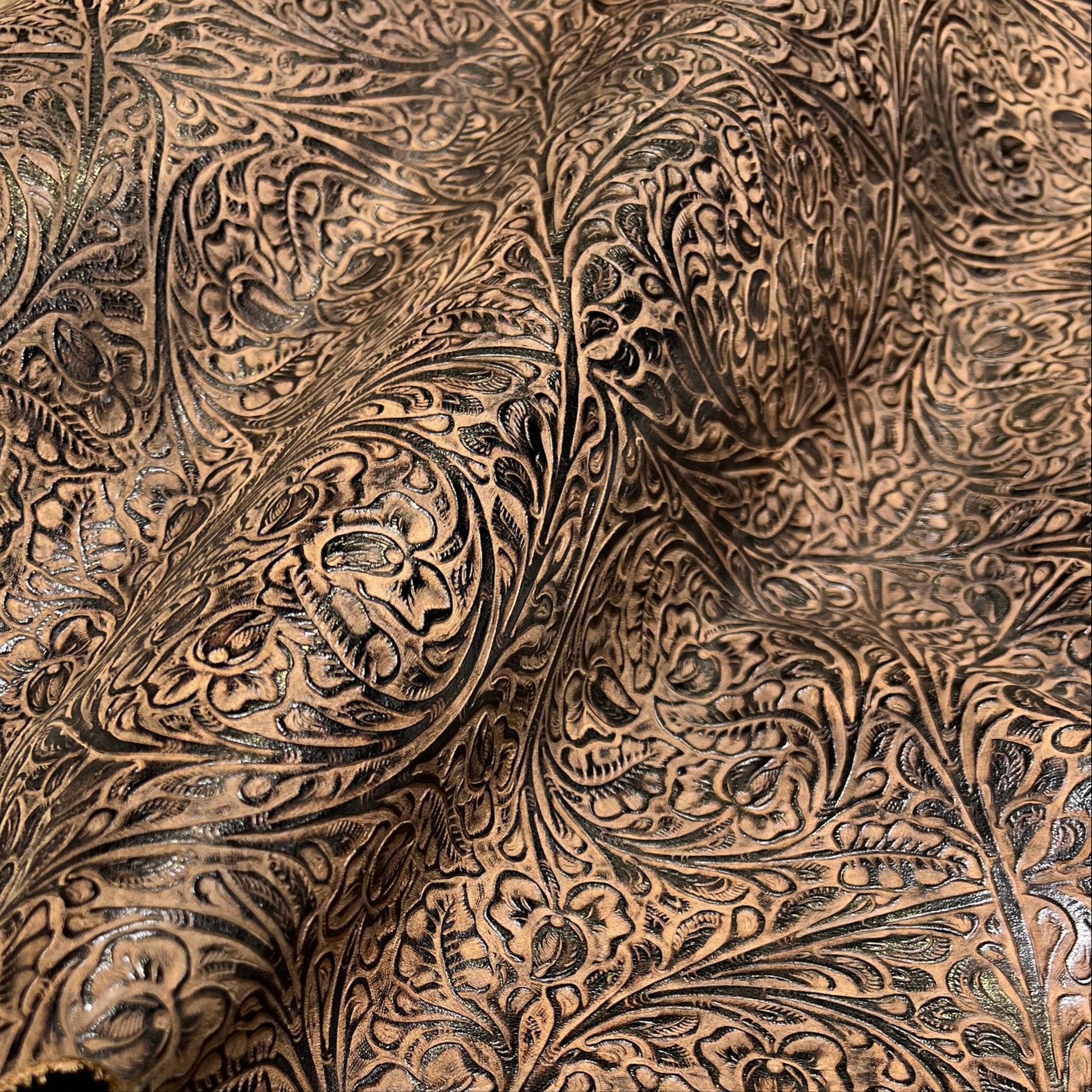 Safari Western Tool- Embossed top grain cowhide in uniform western tooled print. Hand rubbed aniline top finish, washed and shrunken at final for soft temper. Colors will vary skin to skin due to washing process and aniline dye process by hand.