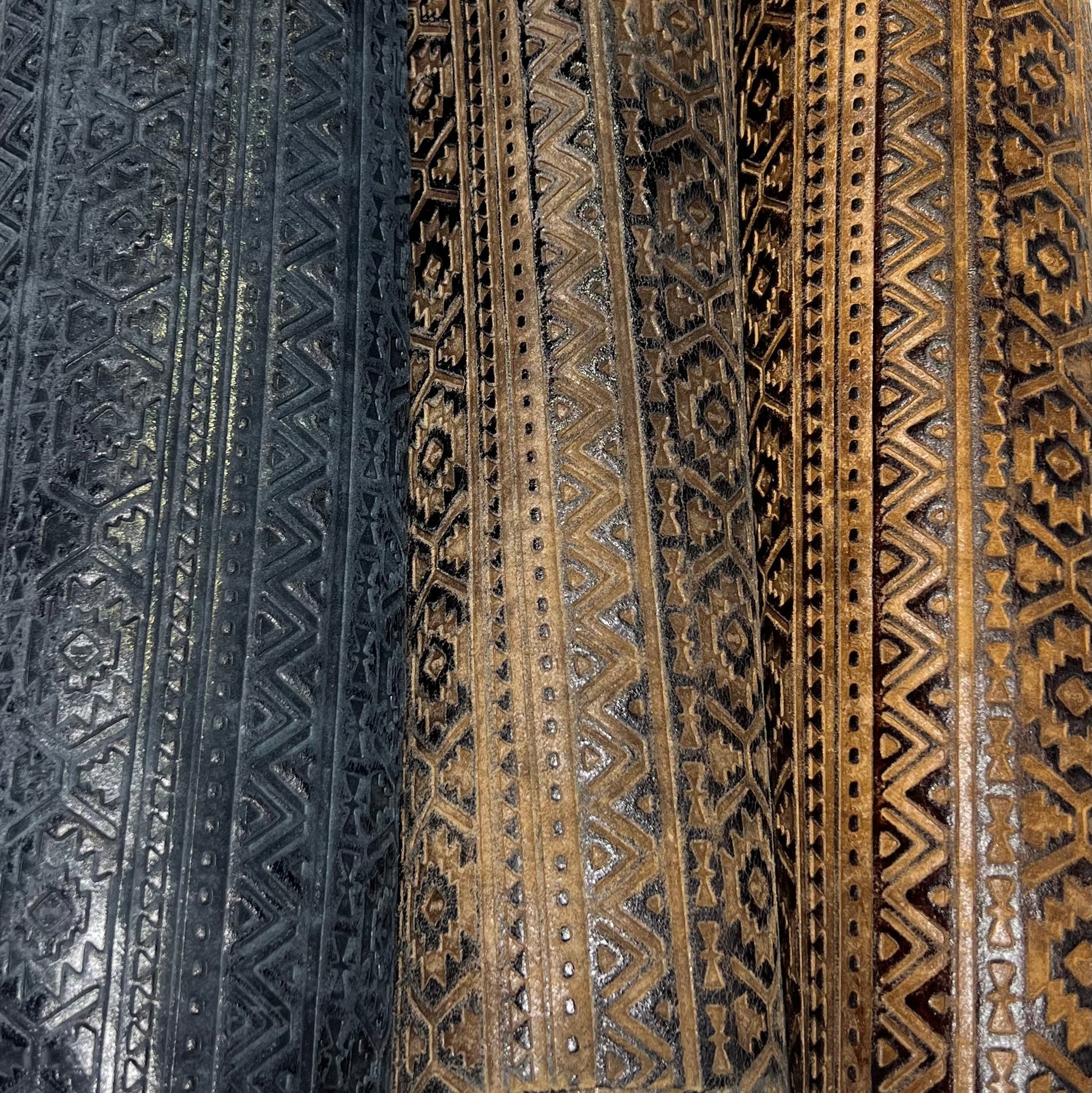 BS Safari Lightning - Embossed rough out, top grain cowhide in repeating geometric linear design. Hand rubbed aniline top finish, washed and shrunken at final for soft temper. Colors will vary skin to skin due to washing process and aniline dye process by hand.