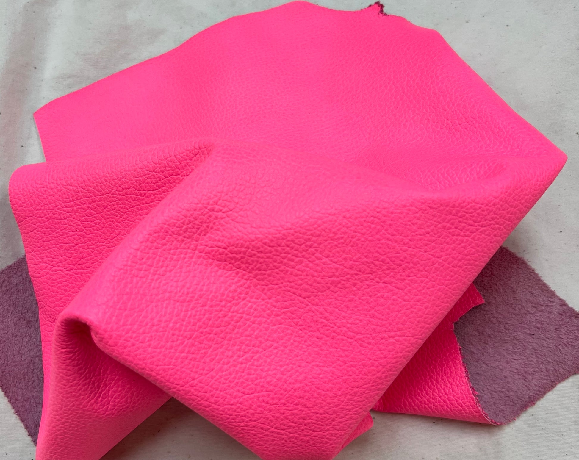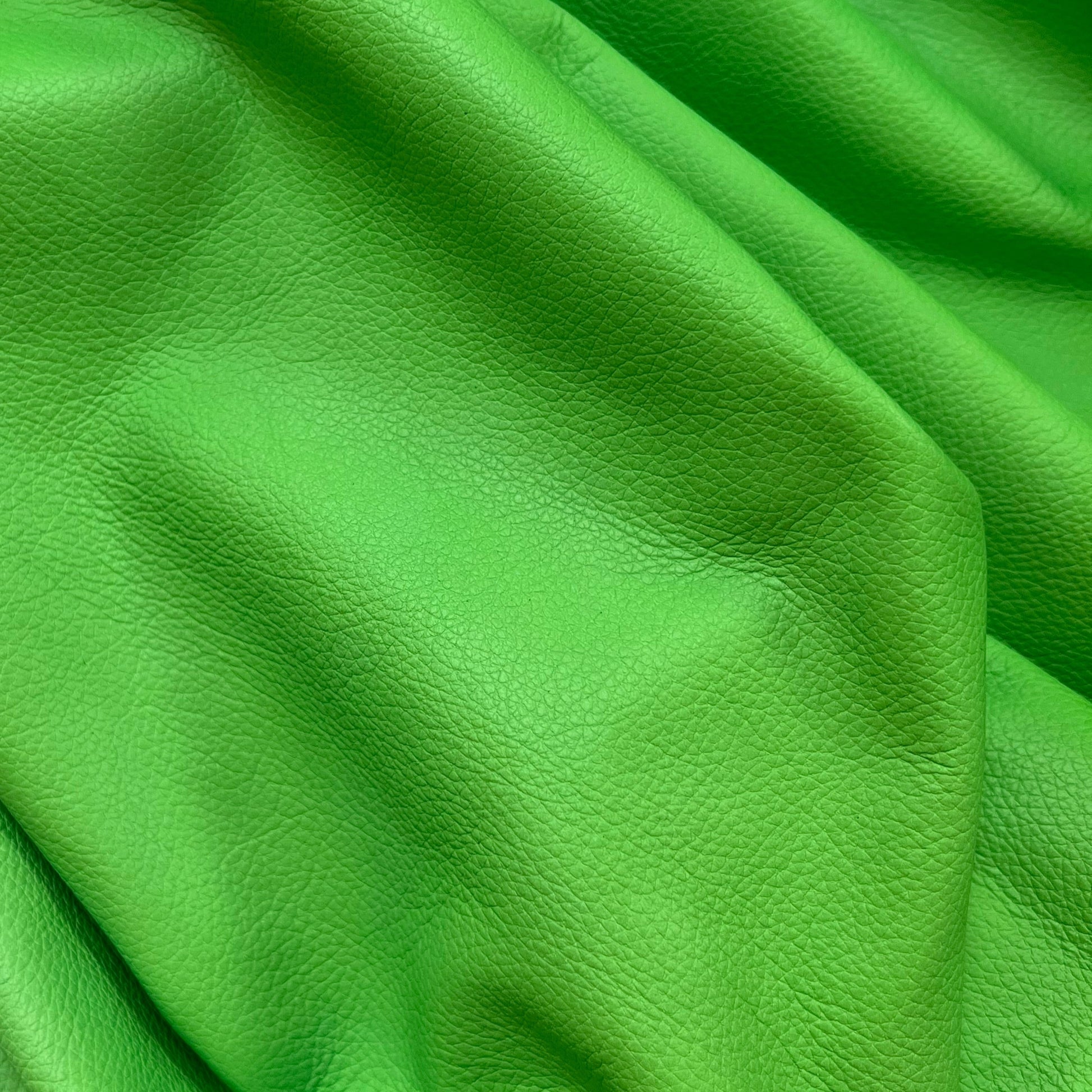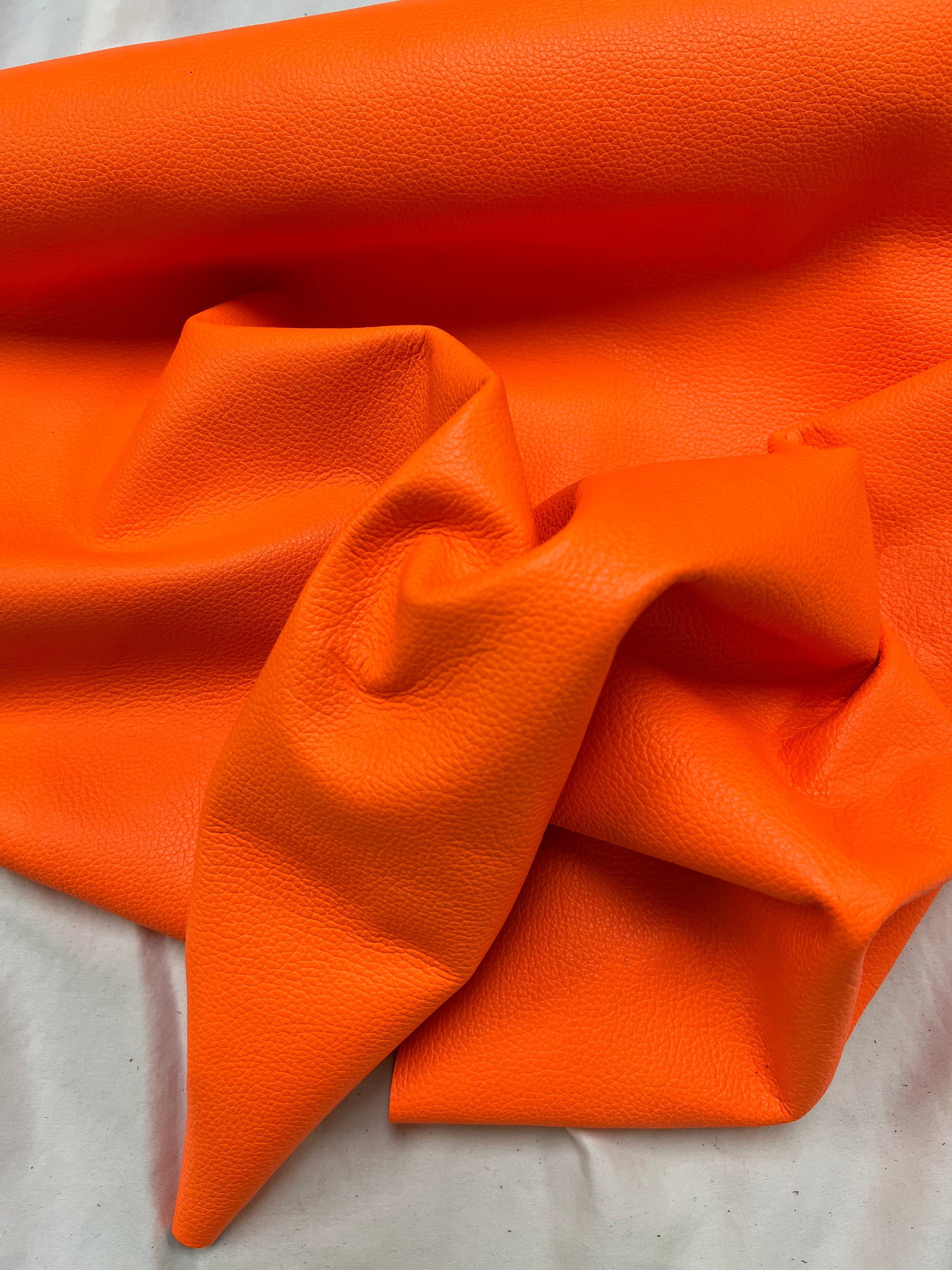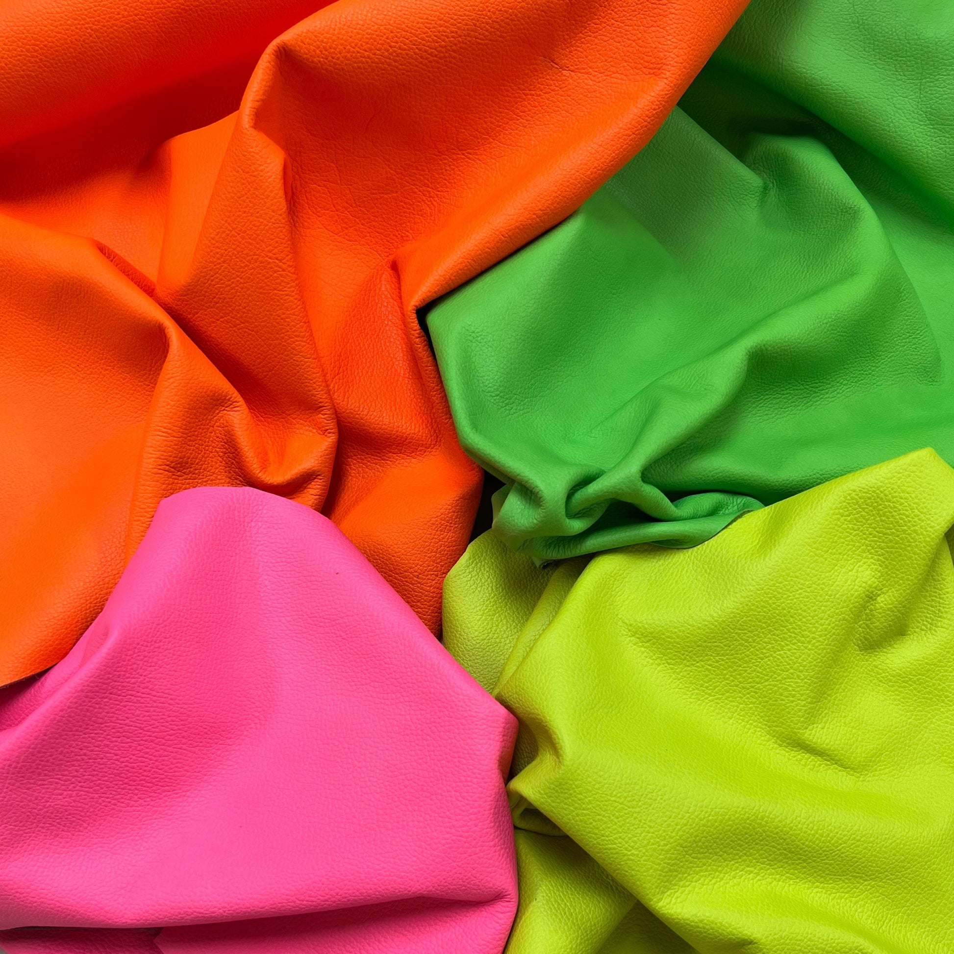 Super Neon- Embossed top grain cowhide in uniform pebble print. Aniline drum dyed to color, top finished with semi pigmented/semi aniline dye in neon bright color. Milled for a soft temper. Colors will vary from lot to lot due to semi aniline dye process.