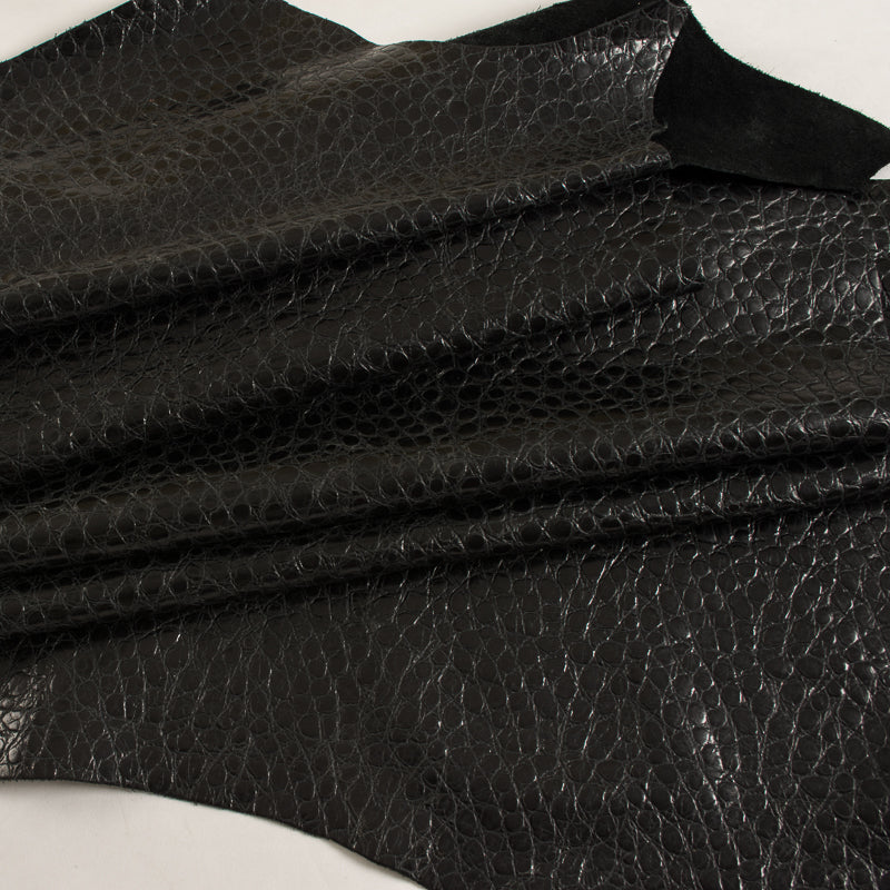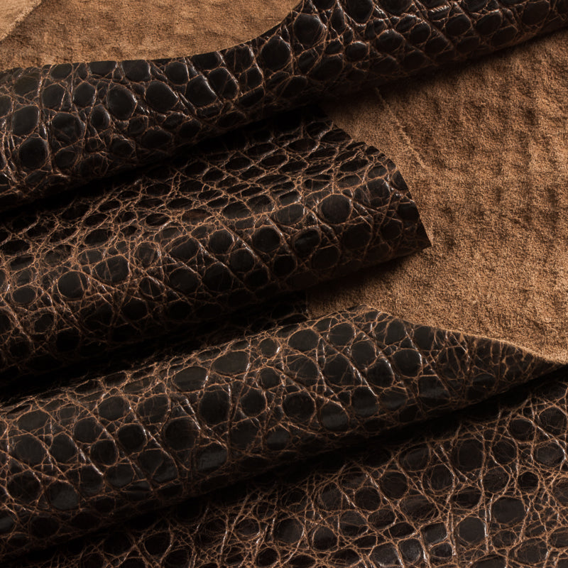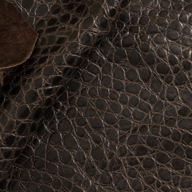 Tuscan Tinga- Embossed top grain cowhide in uniform small arm of crocodile design. Top finished with natural waxes and hand rubbed aniline dye. Soft to medium temper due to washing of skins. Colors will vary from skin to skin due to aniline dye process.