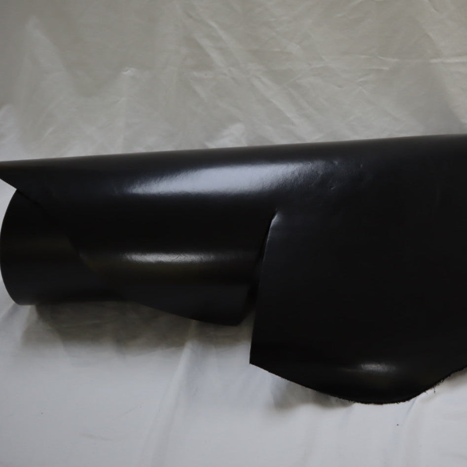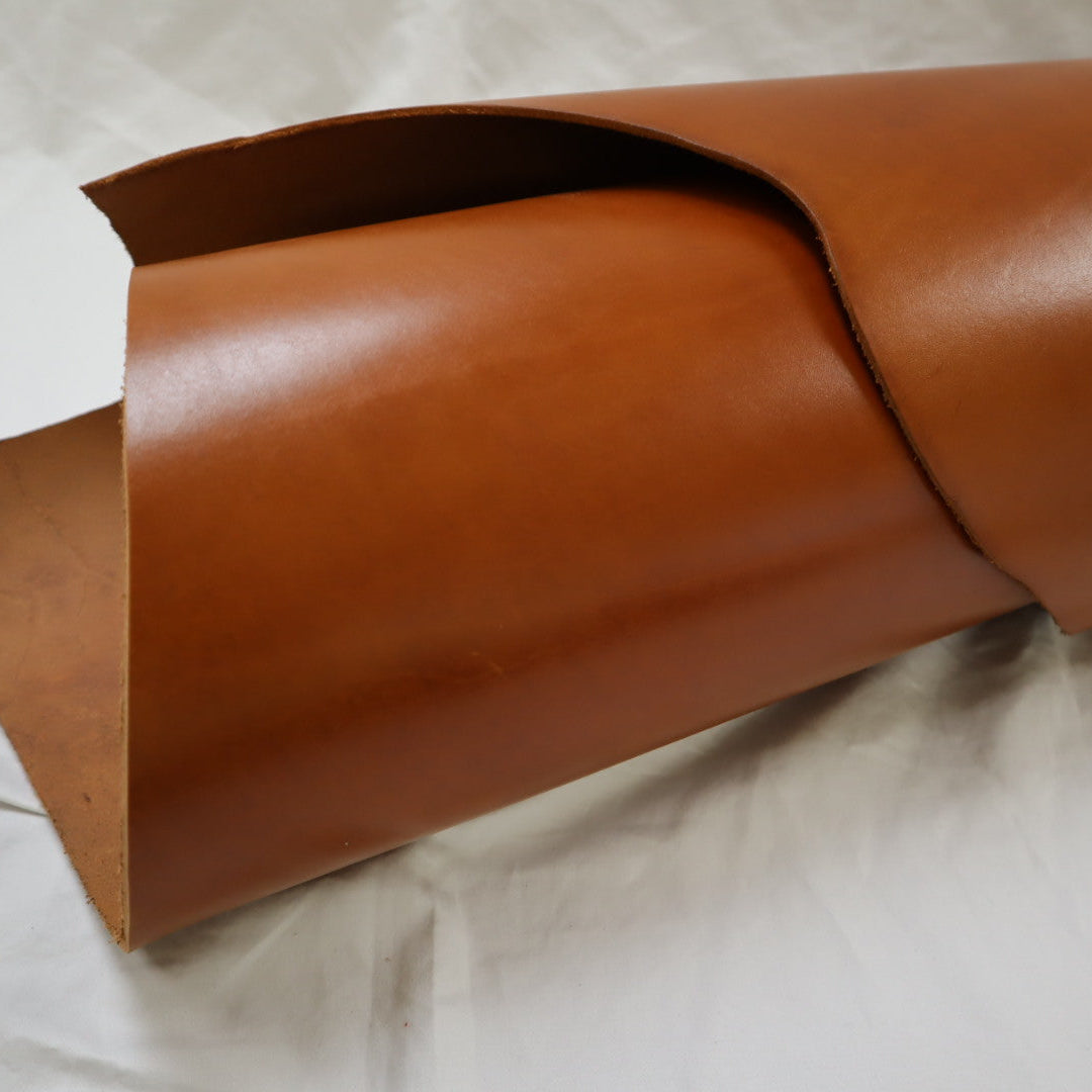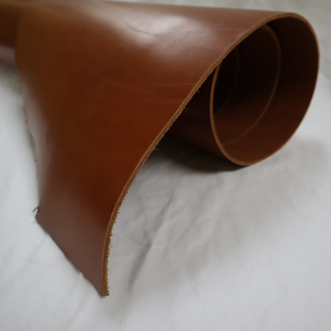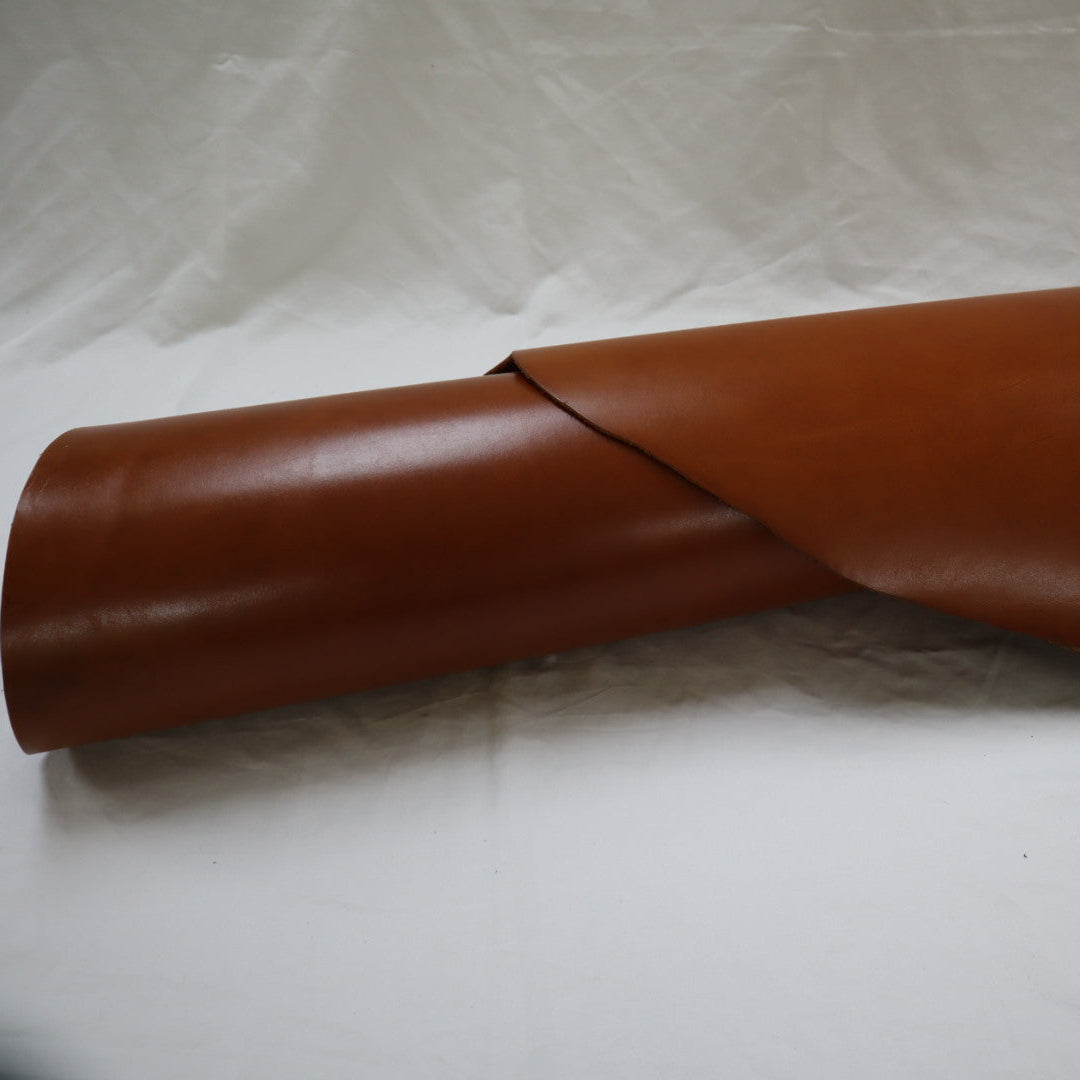 Venice produced on top selection raw material, top grain smooth cowhide, produced with aniline drum dyed through crust, top finished with aniline, and hand glazed at final, resin flesh (back side) for unlined single ply) belt or strap application. Plated flat at final to give very smooth surface. Colors will vary skin to skin due to aniline dyed process. Skin shape is unique, half hides with belly trimmed off