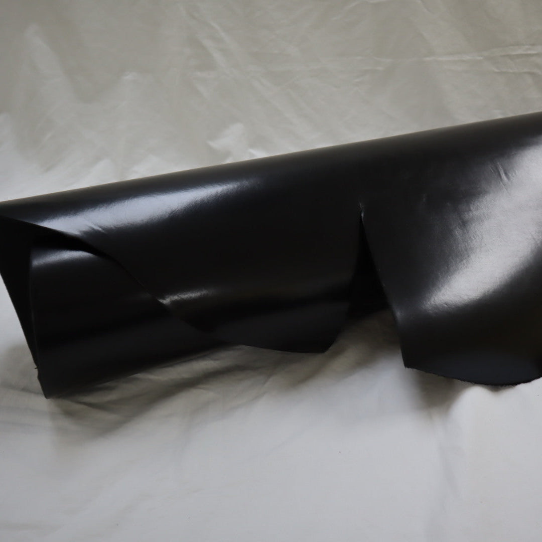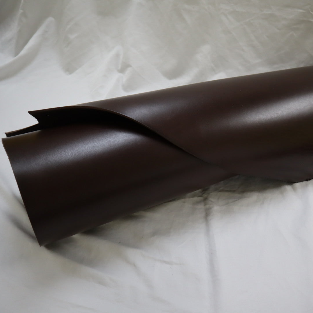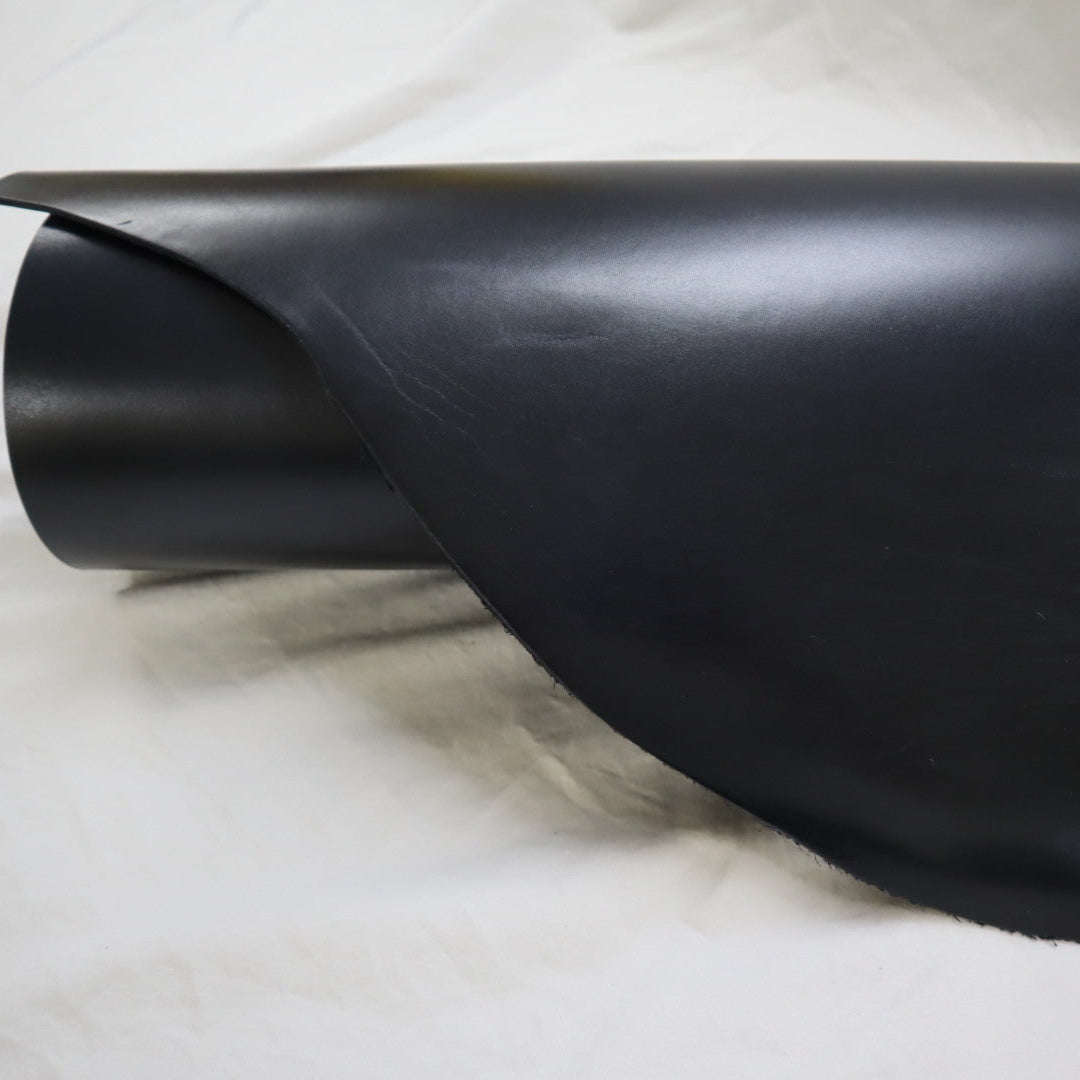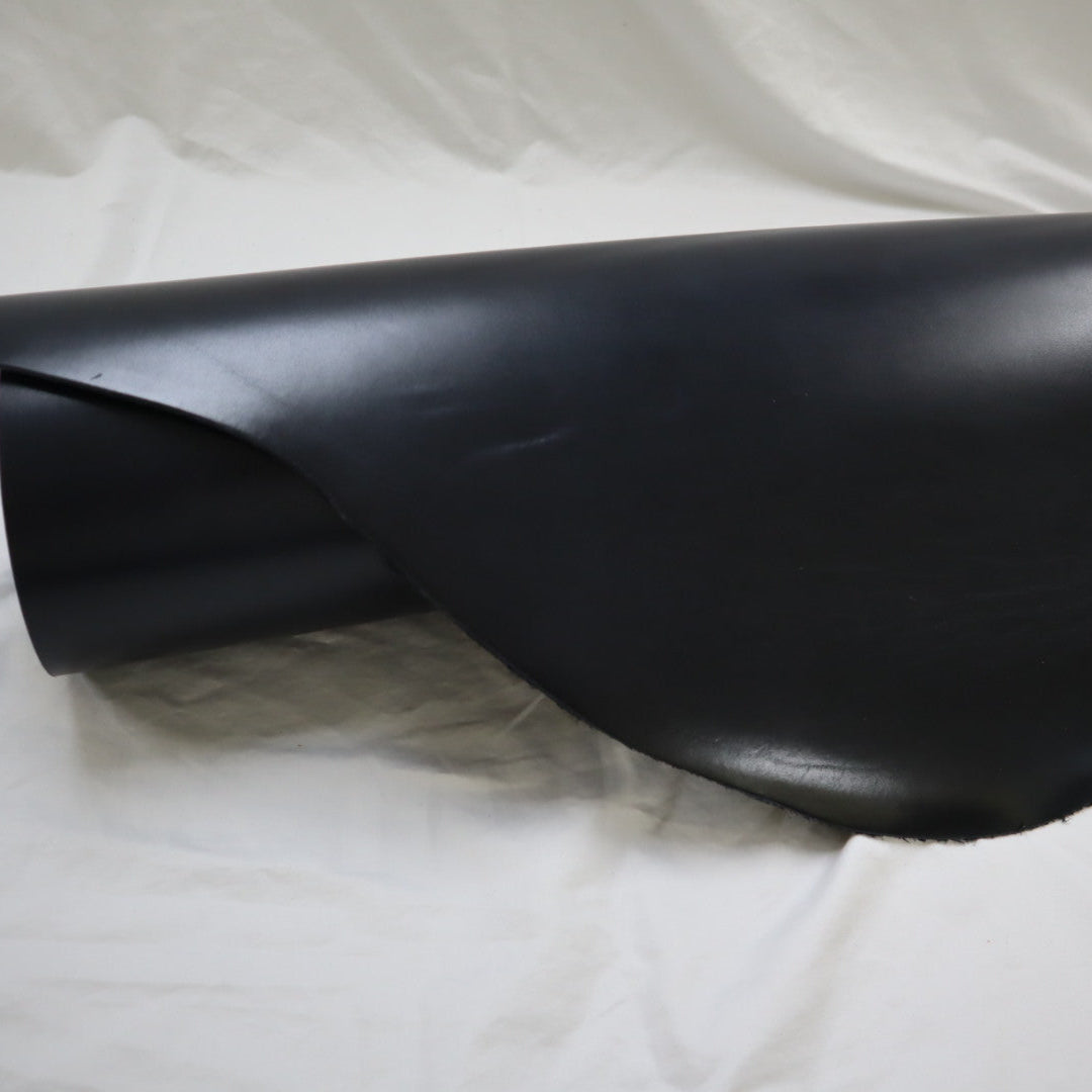 Venice produced on top selection raw material, top grain smooth cowhide, produced with aniline drum dyed through crust, top finished with aniline, and hand glazed at final, resin flesh (back side) for unlined single ply) belt or strap application. Plated flat at final to give very smooth surface. Colors will vary skin to skin due to aniline dyed process. Skin shape is unique, half hides with belly trimmed off