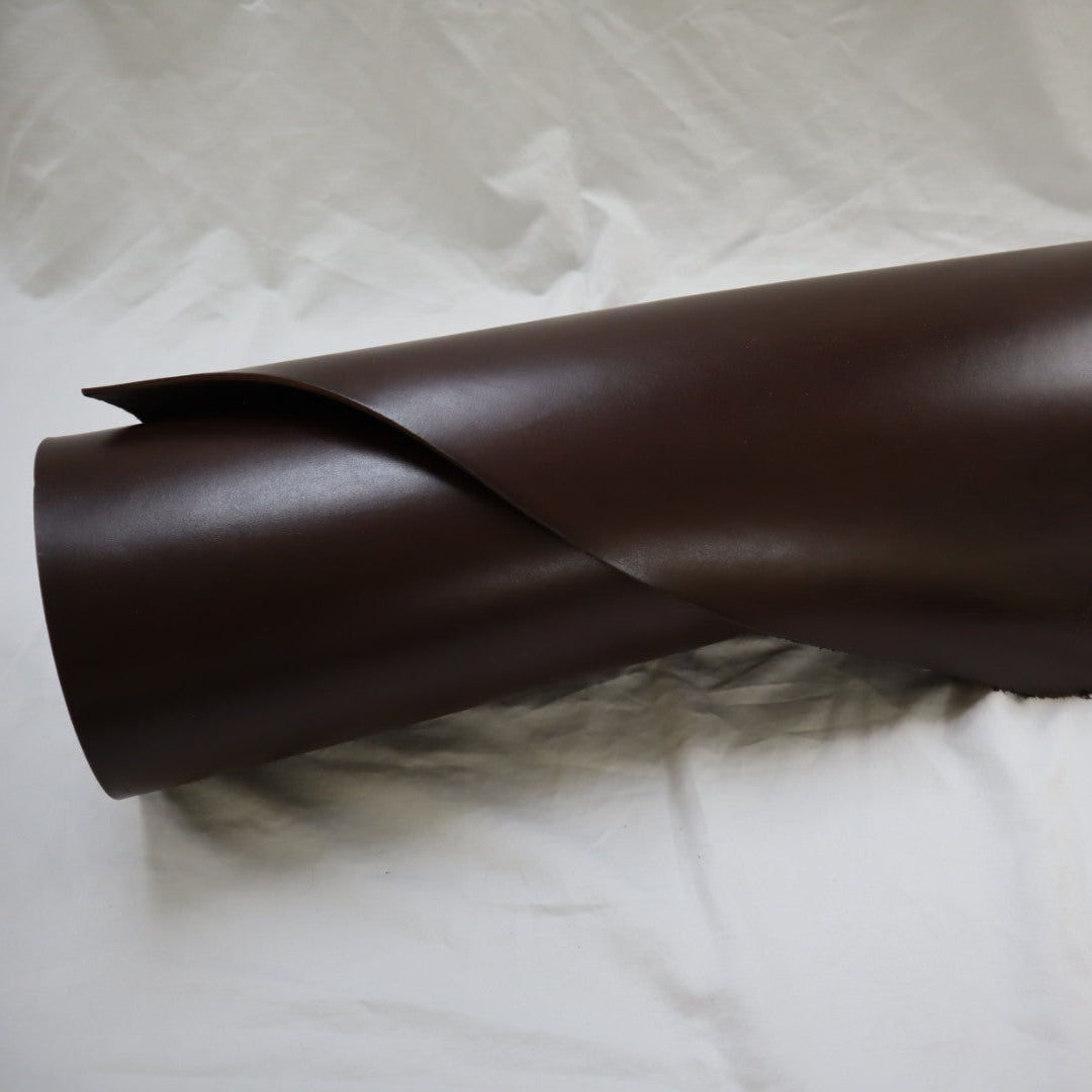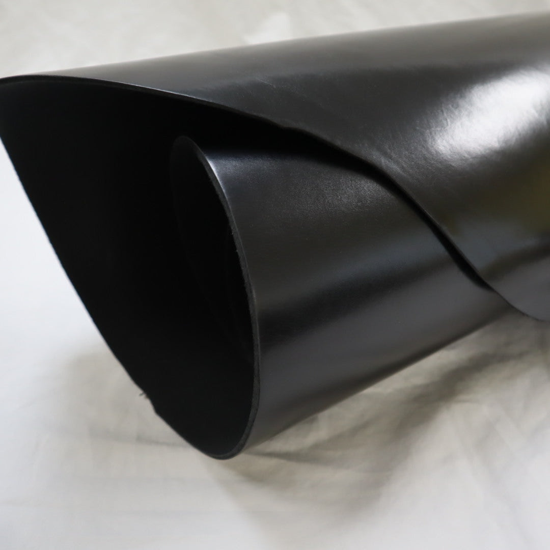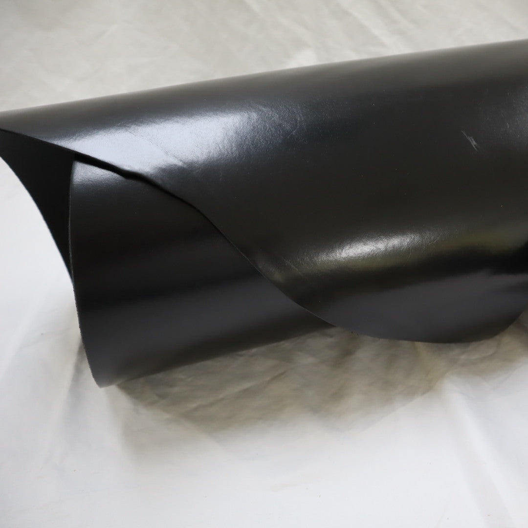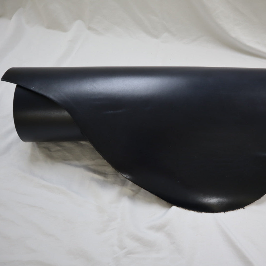 Venice produced on top selection raw material, top grain smooth cowhide, produced with aniline drum dyed through crust, top finished with aniline, and hand glazed at final, resin flesh (back side) for unlined single ply) belt or strap application. Plated flat at final to give very smooth surface. Colors will vary skin to skin due to aniline dyed process. Skin shape is unique, half hides with belly trimmed off