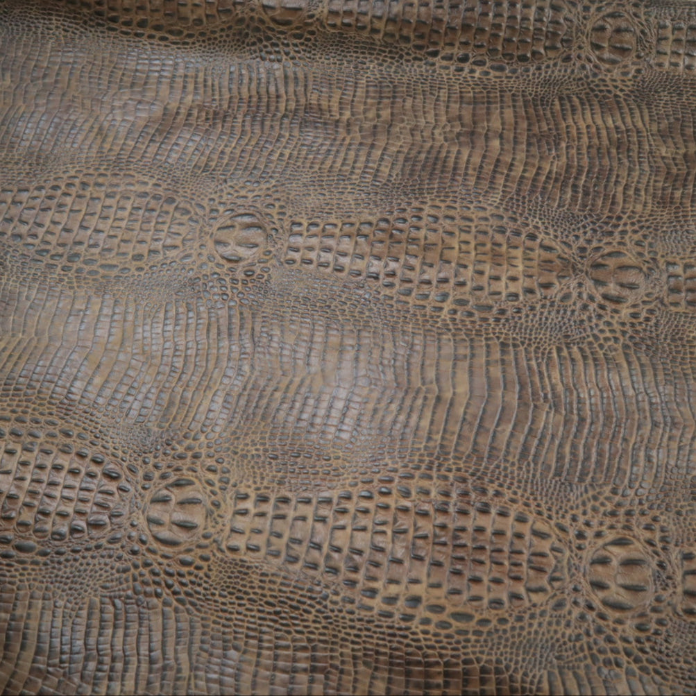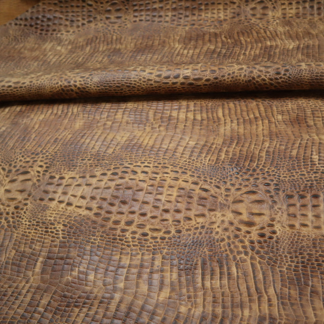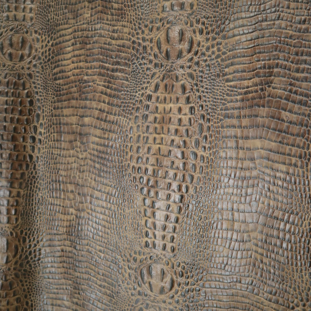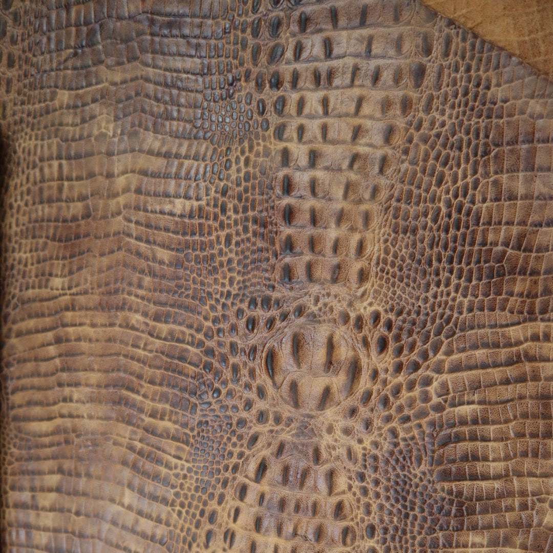 Waxy Baby Croco- Embossed top grain cowhide in repeating raised hornback crocodile print. Top finished with natural waxes and oils for waxy top feel. Hand applied top aniline dyes. Colors will vary from skin to skin due to hand applied dye process.